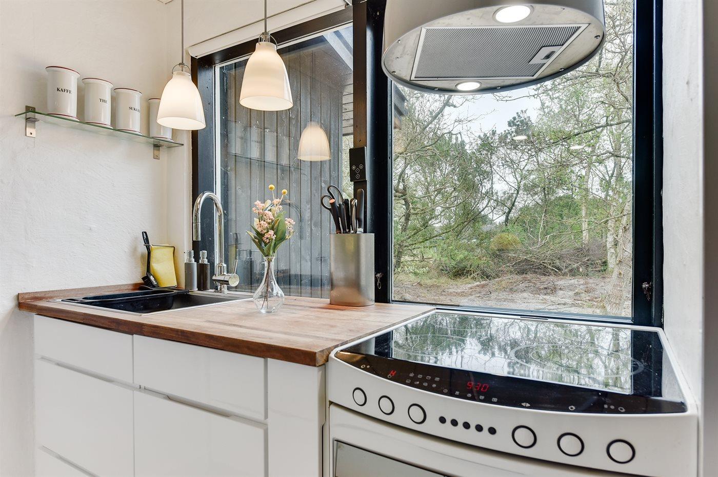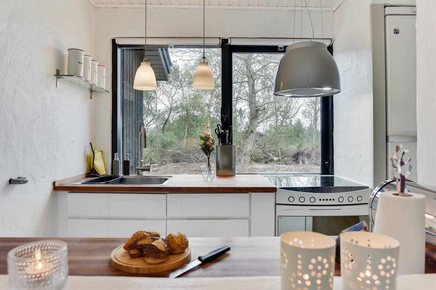 Køkkenet er udstyret med 1 køleskab. Der er 4 keramiske kogeplader, varmluftovn, mikrobølgeovn samt opvaskemaskine.