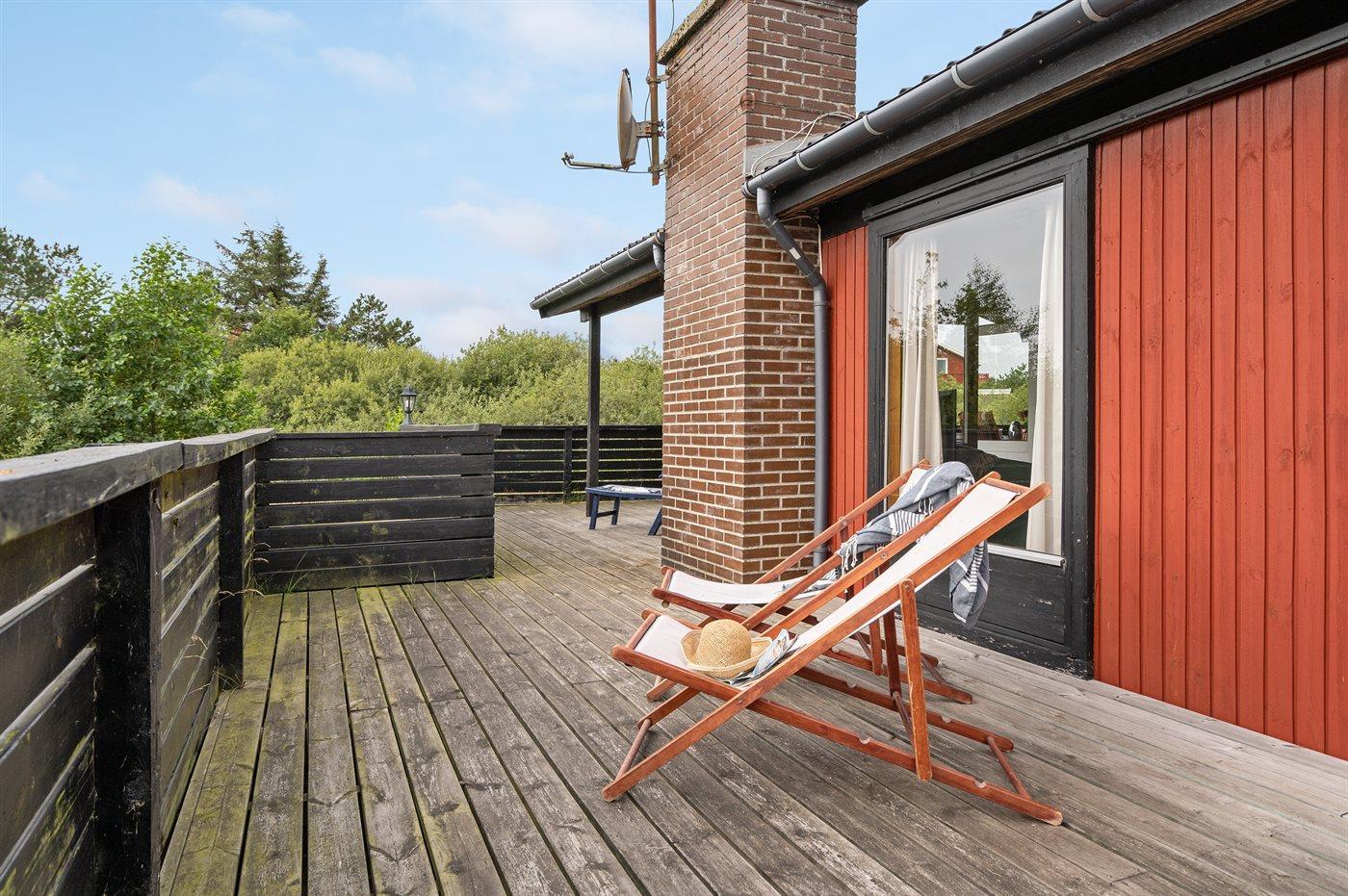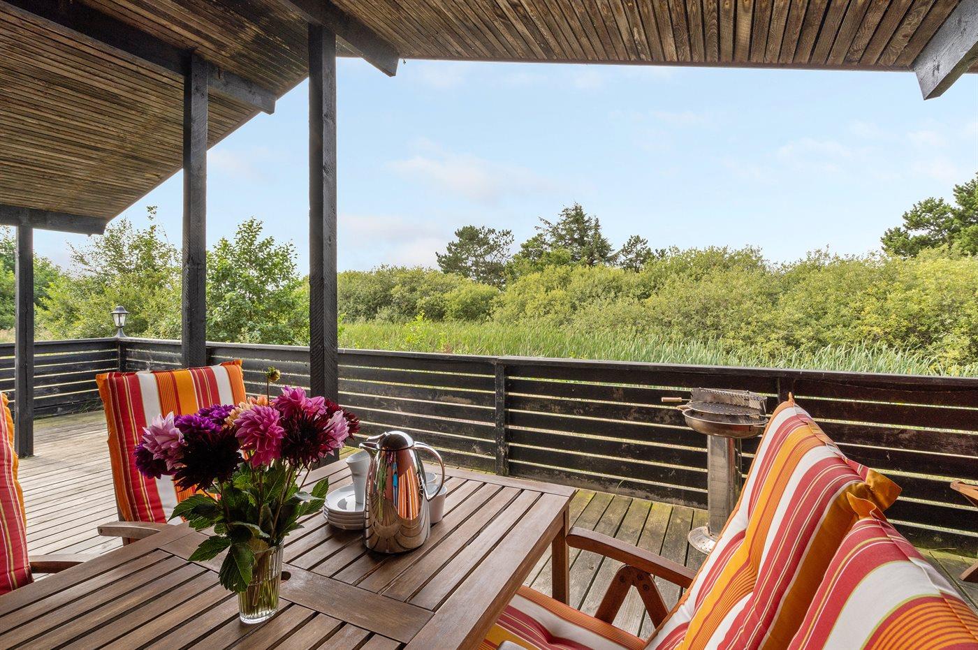 Ferieboligen er beliggende på en 2100 m² stor naturgrund. Der er 550 m til havet. Der er en sø i en afstand af 5 m. Nærmeste forretning er beliggende i en afstand af 550 m. Til ferieboligen hører 114 m² terrasseareal. Desuden er der 21 m² overdækket terrasse. Heraf i alt 134 m² lukket terrasse. Der er redskabsrum. Parkering ved ferieboligen.