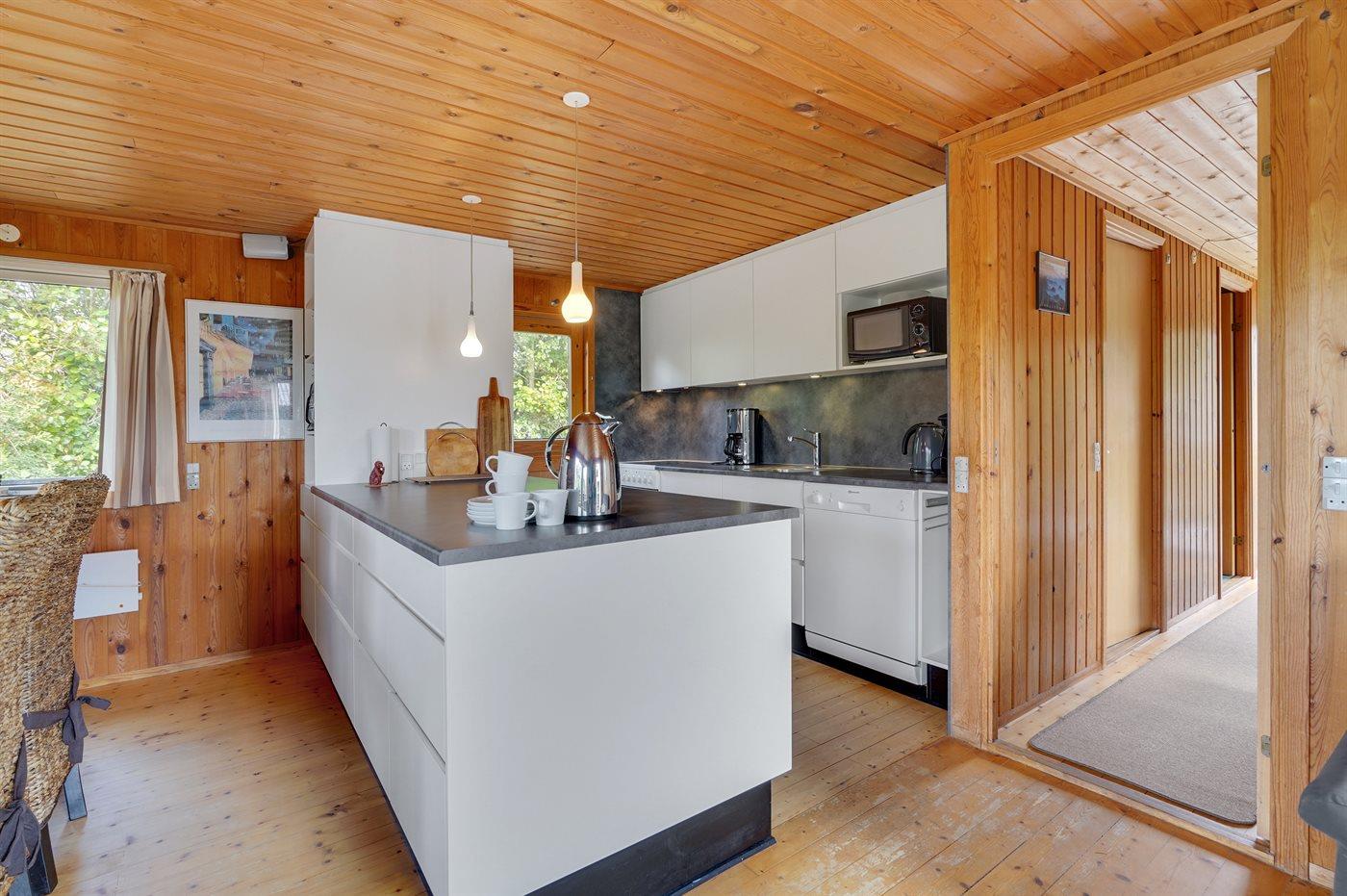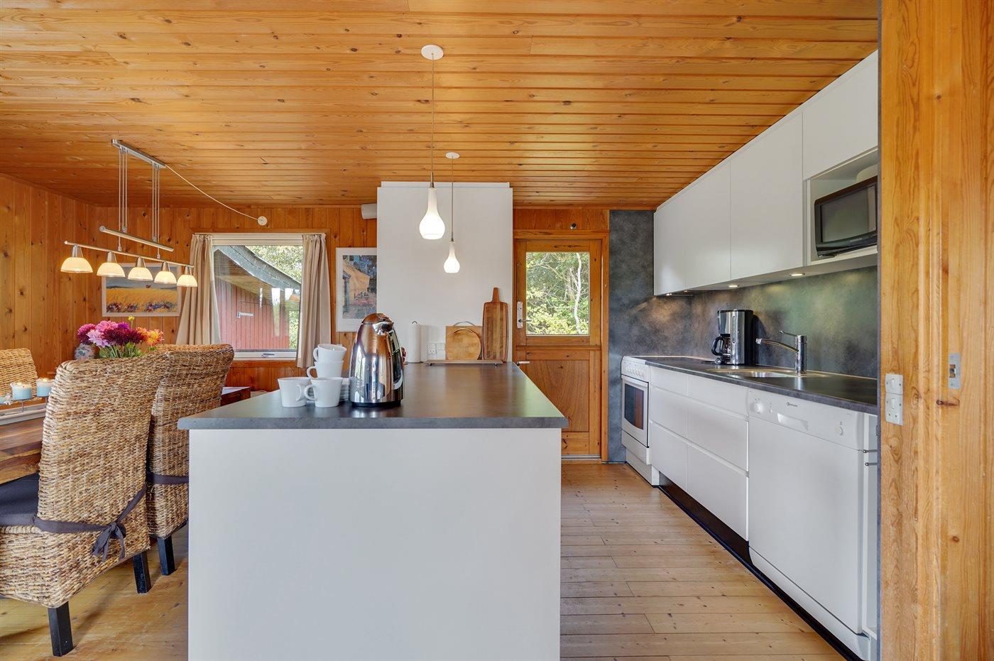 Køkkenet er udstyret med 1 køleskab. Der er 4 keramiske kogeplader, varmluftovn, mikrobølgeovn samt opvaskemaskine.