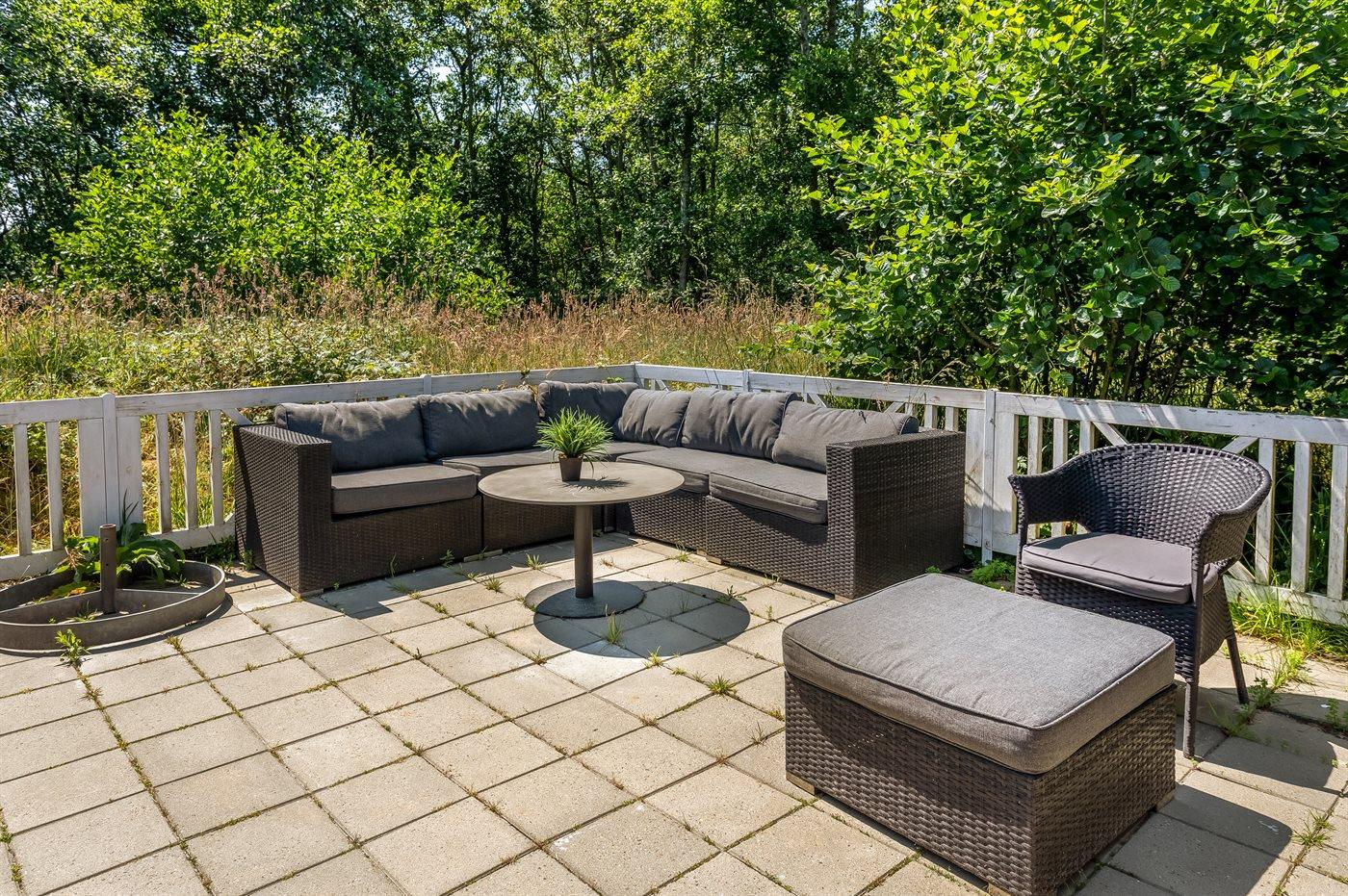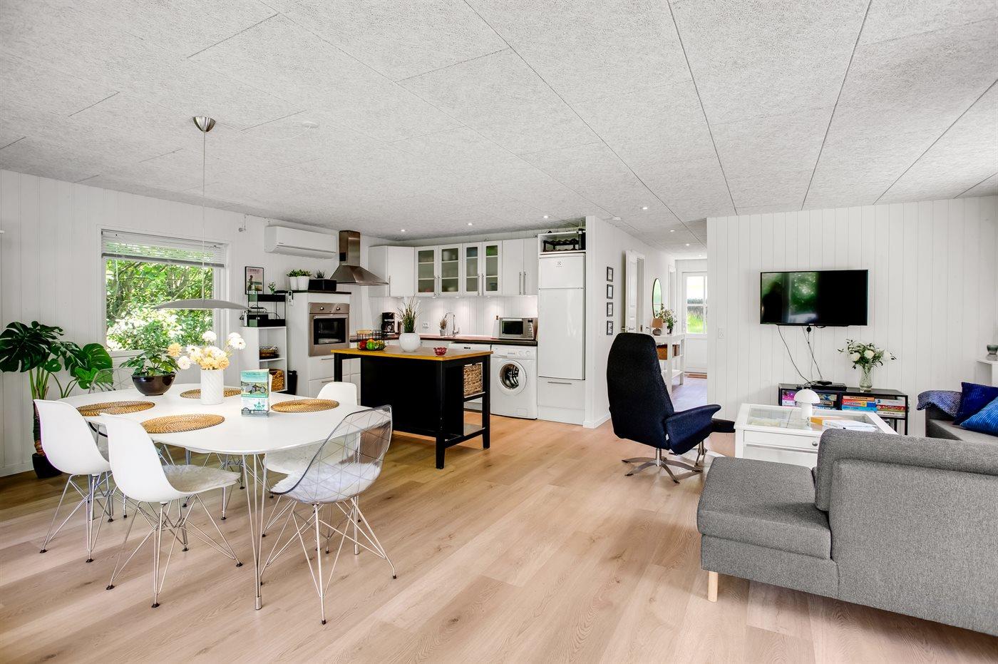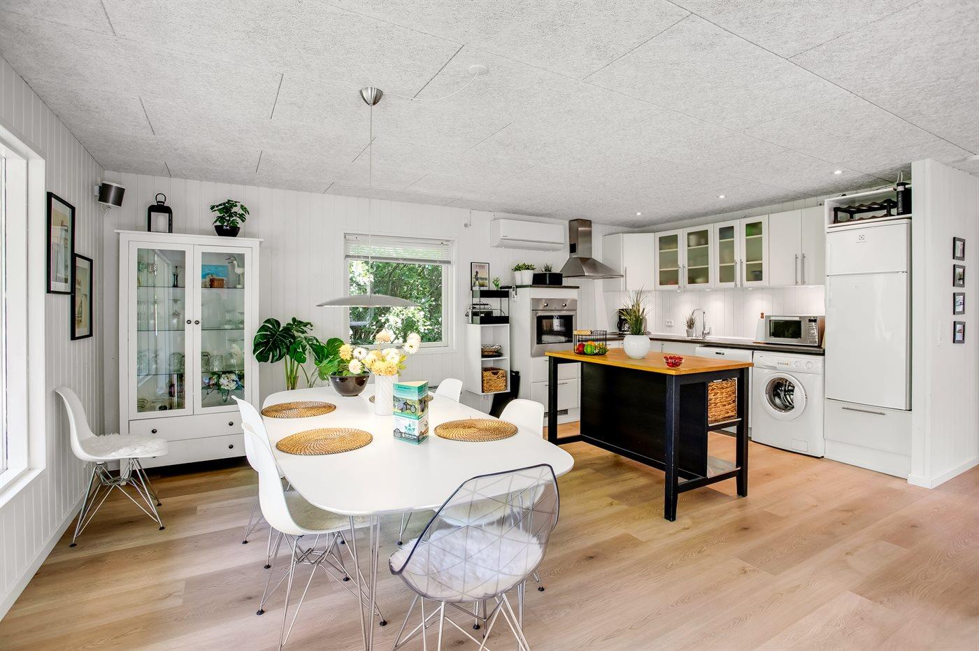 Et hyggeligt sommerhus på Fanø med dejligt køkken-alrum, hvorfra der er direkte adgang til den delvist overdækkede terrasse, hvor der er god plads.