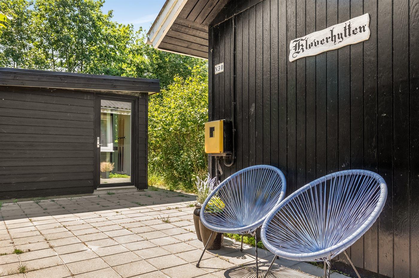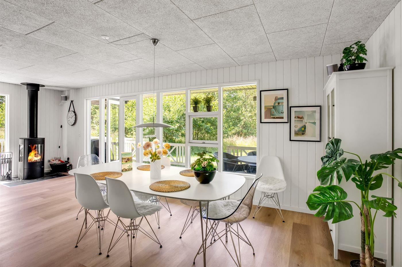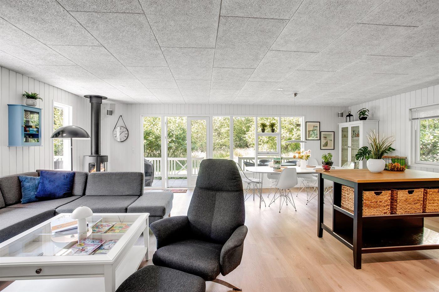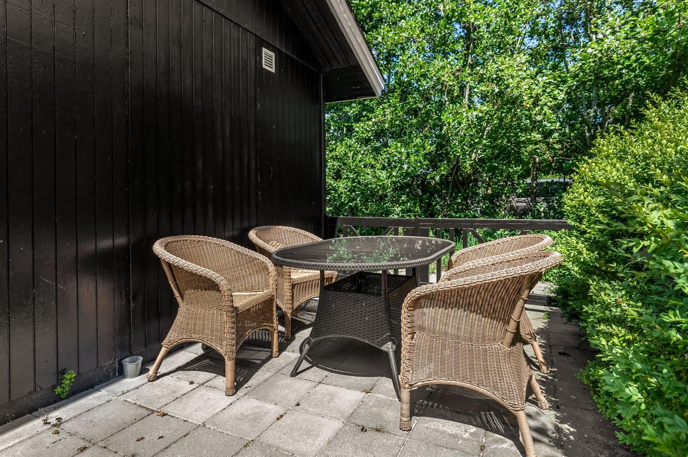 Et hyggeligt sommerhus på Fanø med dejligt køkken-alrum, hvorfra der er direkte adgang til den delvist overdækkede terrasse, hvor der er god plads.