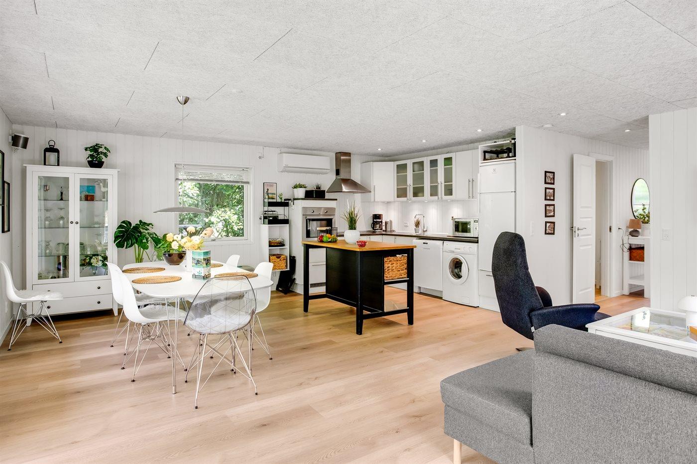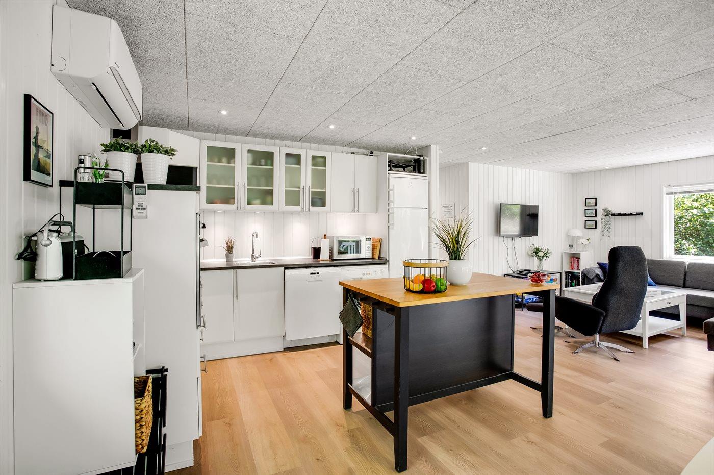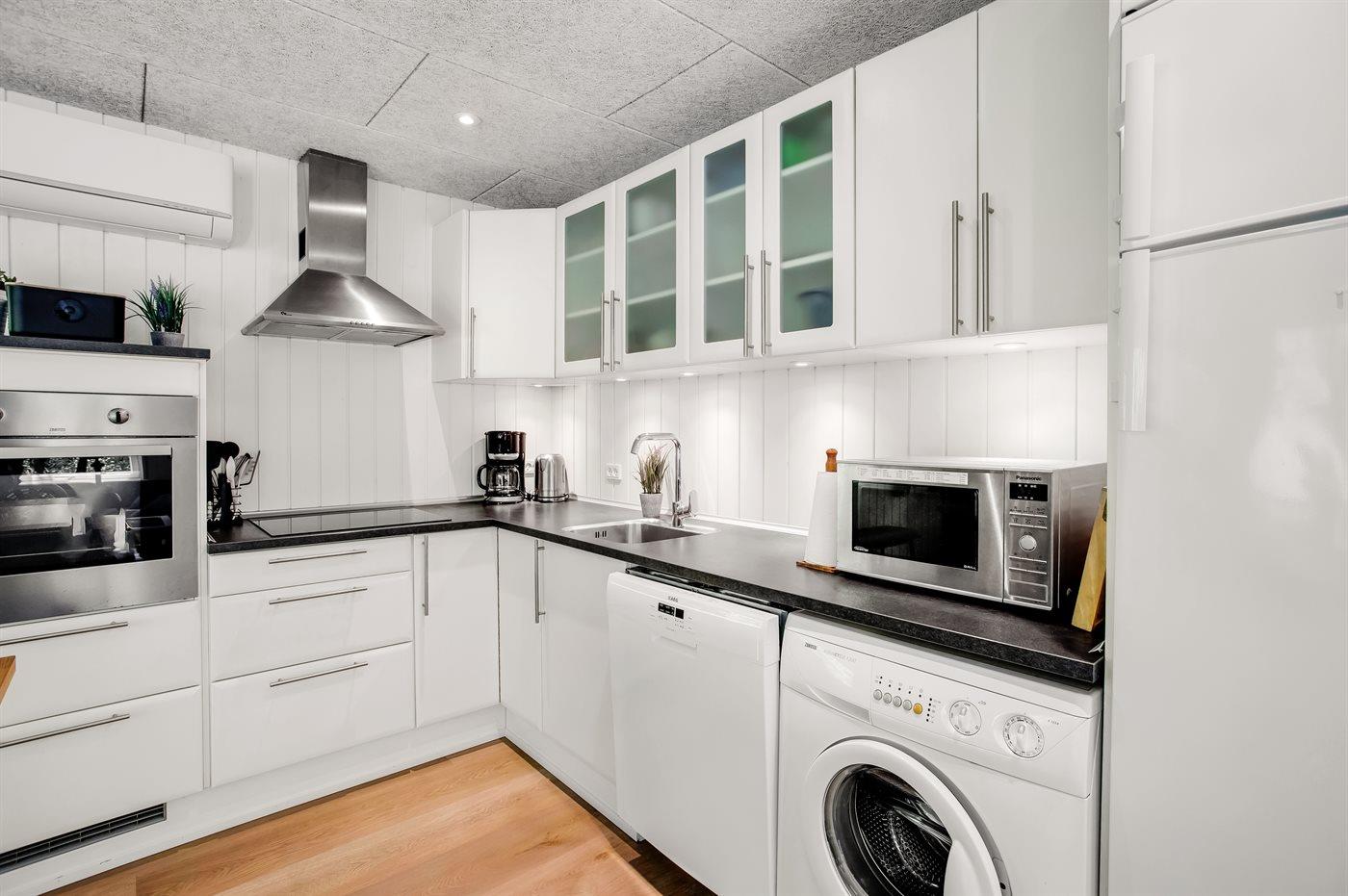 Køkkenet er udstyret med 1 køleskab. Der er 4 keramiske kogeplader, varmluftovn, mikrobølgeovn samt opvaskemaskine.