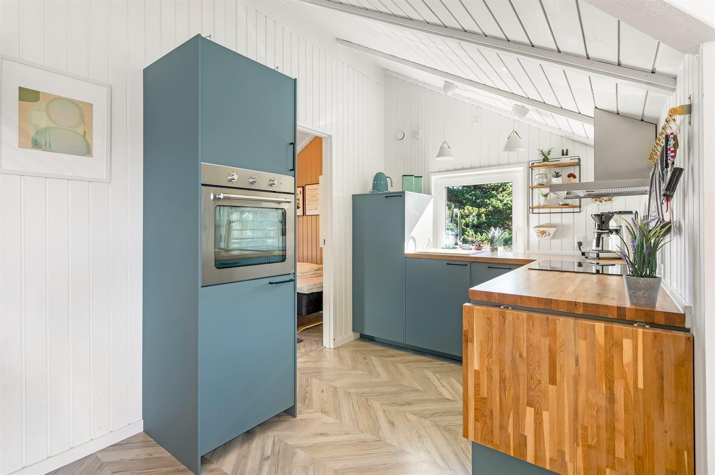 Køkkenet er udstyret med 1 køleskab. Der er 4 induktionskogeplader, varmluftovn, mikrobølgeovn samt opvaskemaskine. Der findes desuden et lille køleskab og en fryser i skuret.