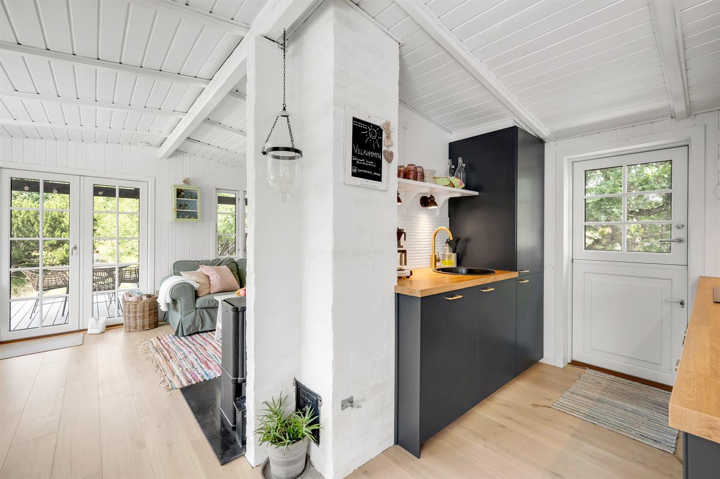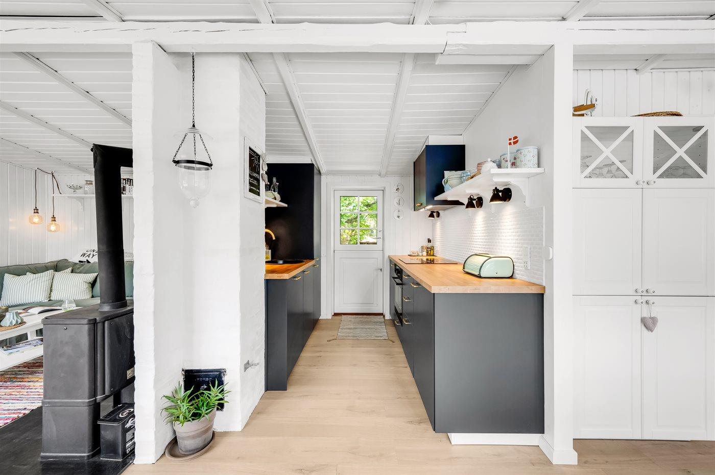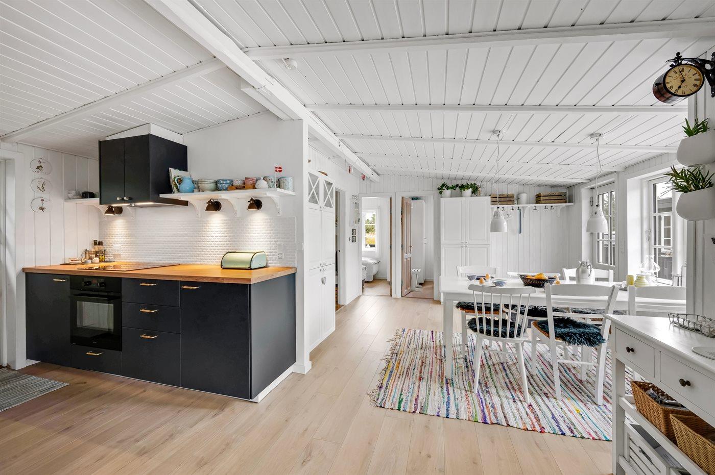 Køkkenet er udstyret med 1 køleskab. Der er 4 keramiske kogeplader, varmluftovn samt opvaskemaskine.