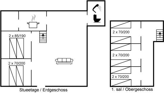Der er i alt 5 soveværelser. Sovepladserne fordeler sig på: 4 sovepladser i dobbeltsenge. 6 sovepladser i enkeltsenge.