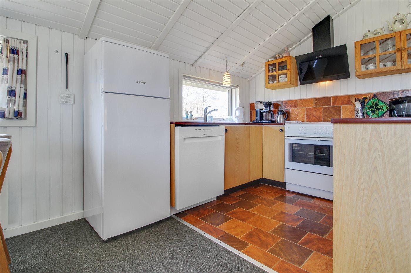 Køkkenet er udstyret med 1 køleskab. Der er 4 elkogeplader, bageovn samt opvaskemaskine.