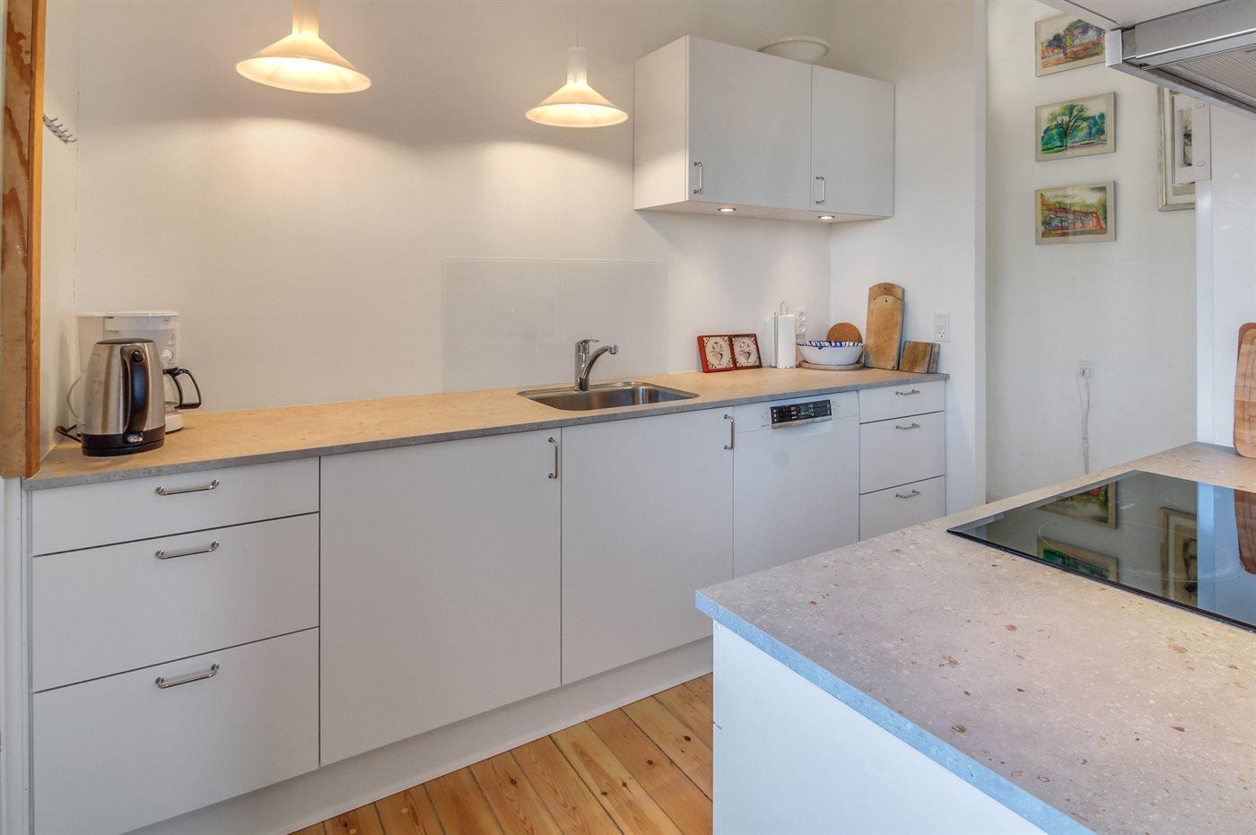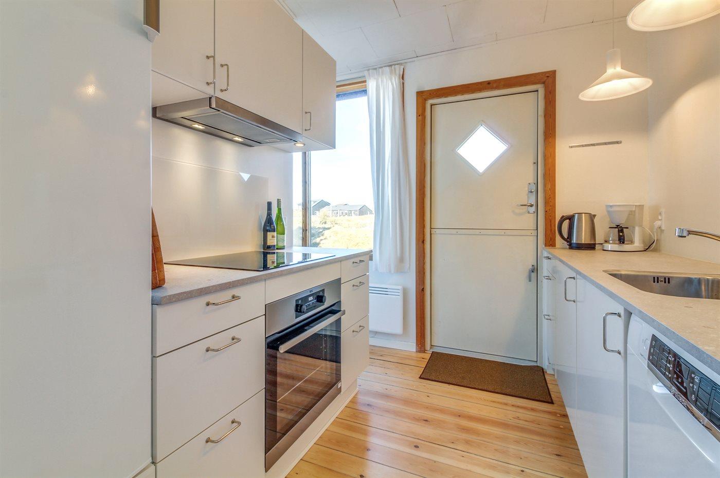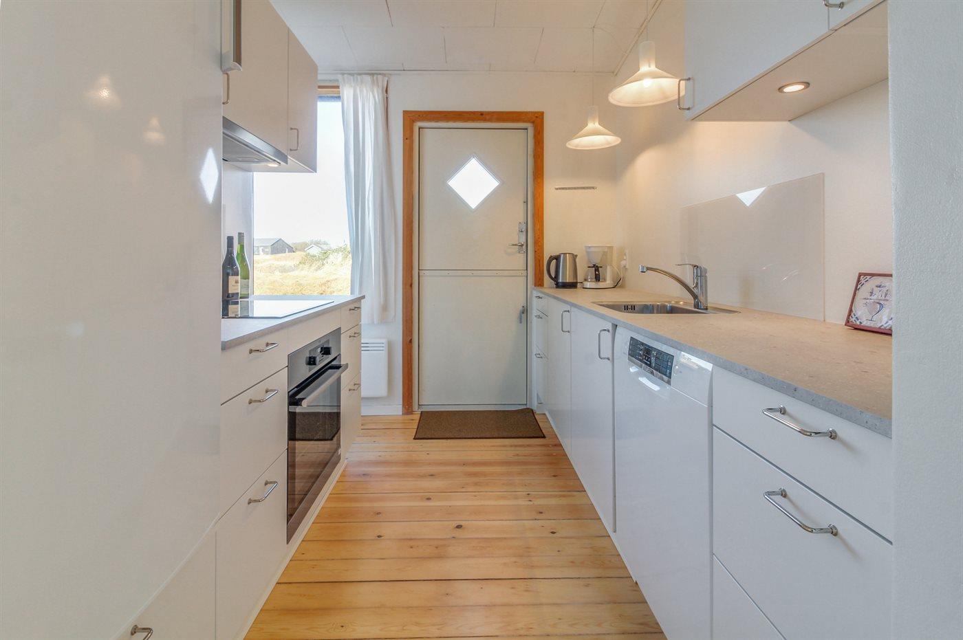 Køkkenet er udstyret med 1 køleskab. Der er 4 keramiske kogeplader, varmluftovn samt opvaskemaskine.