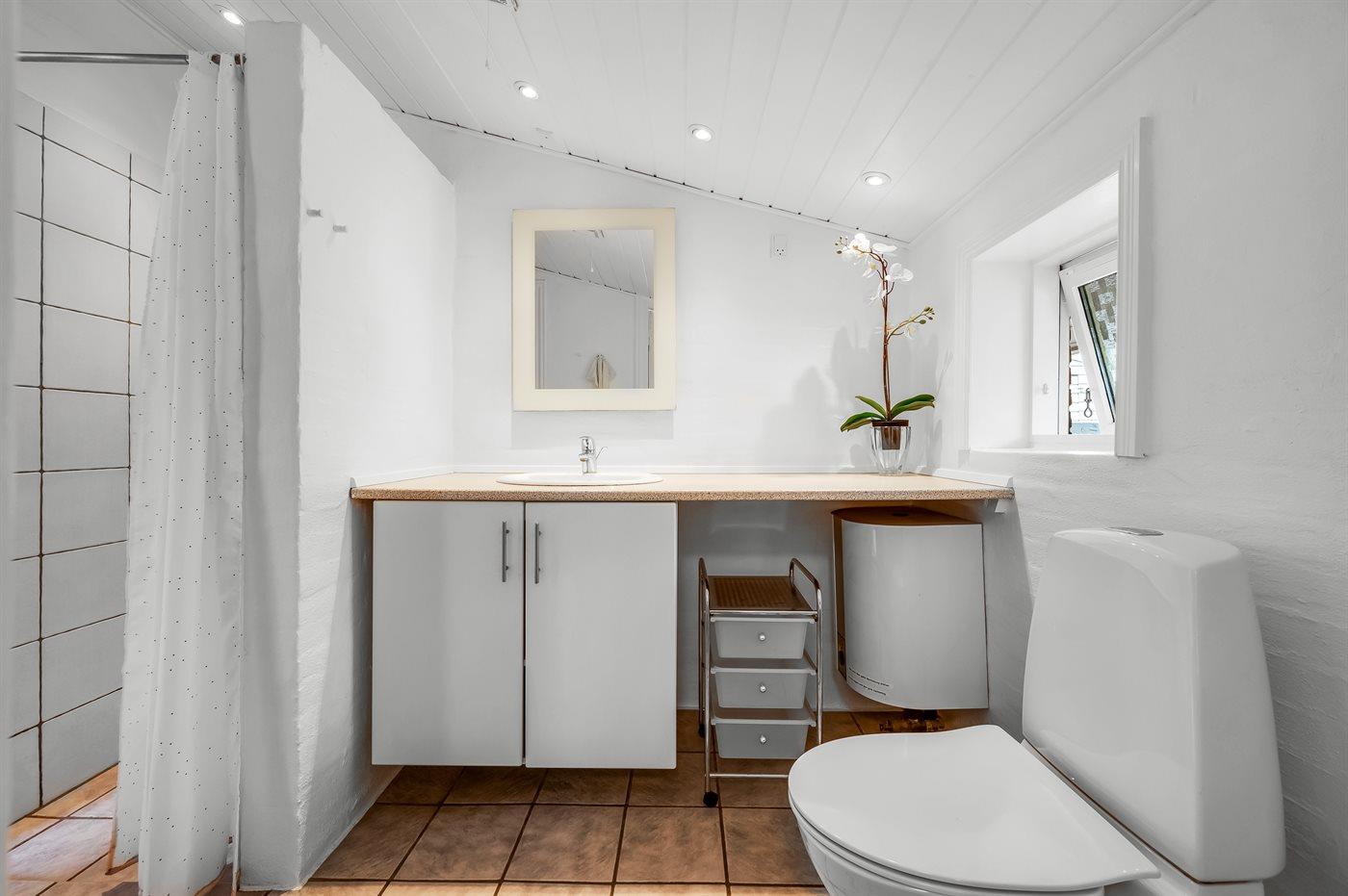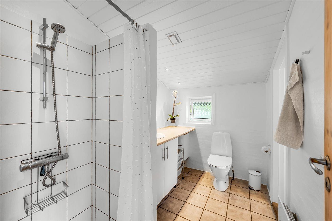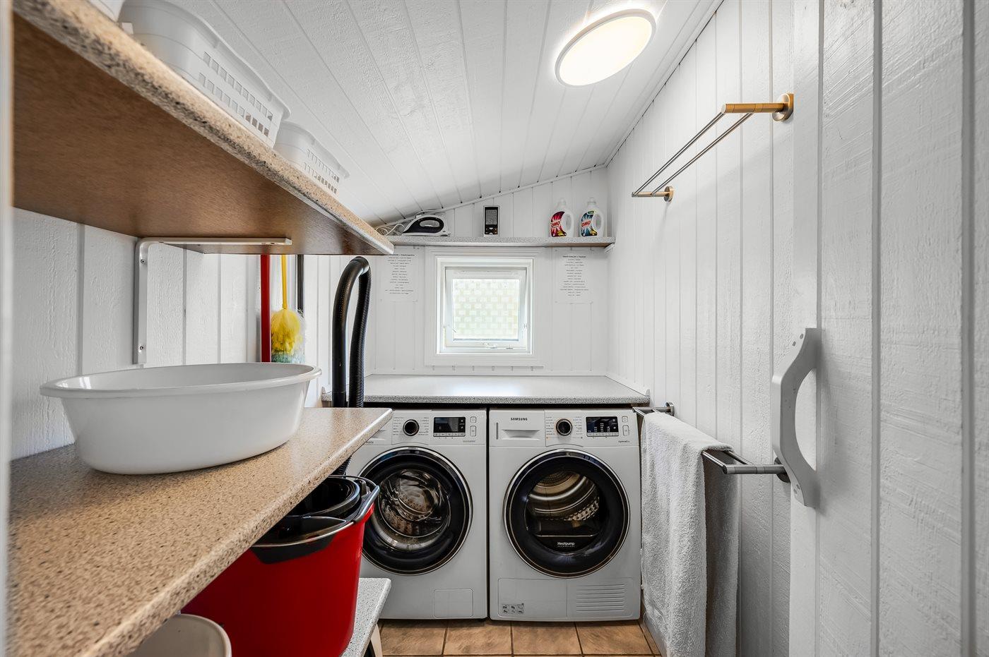 Dejligt badeværelse med sauna og gulvvarme. Vaskemaskine og tørretumbler i et praktisk rum.
