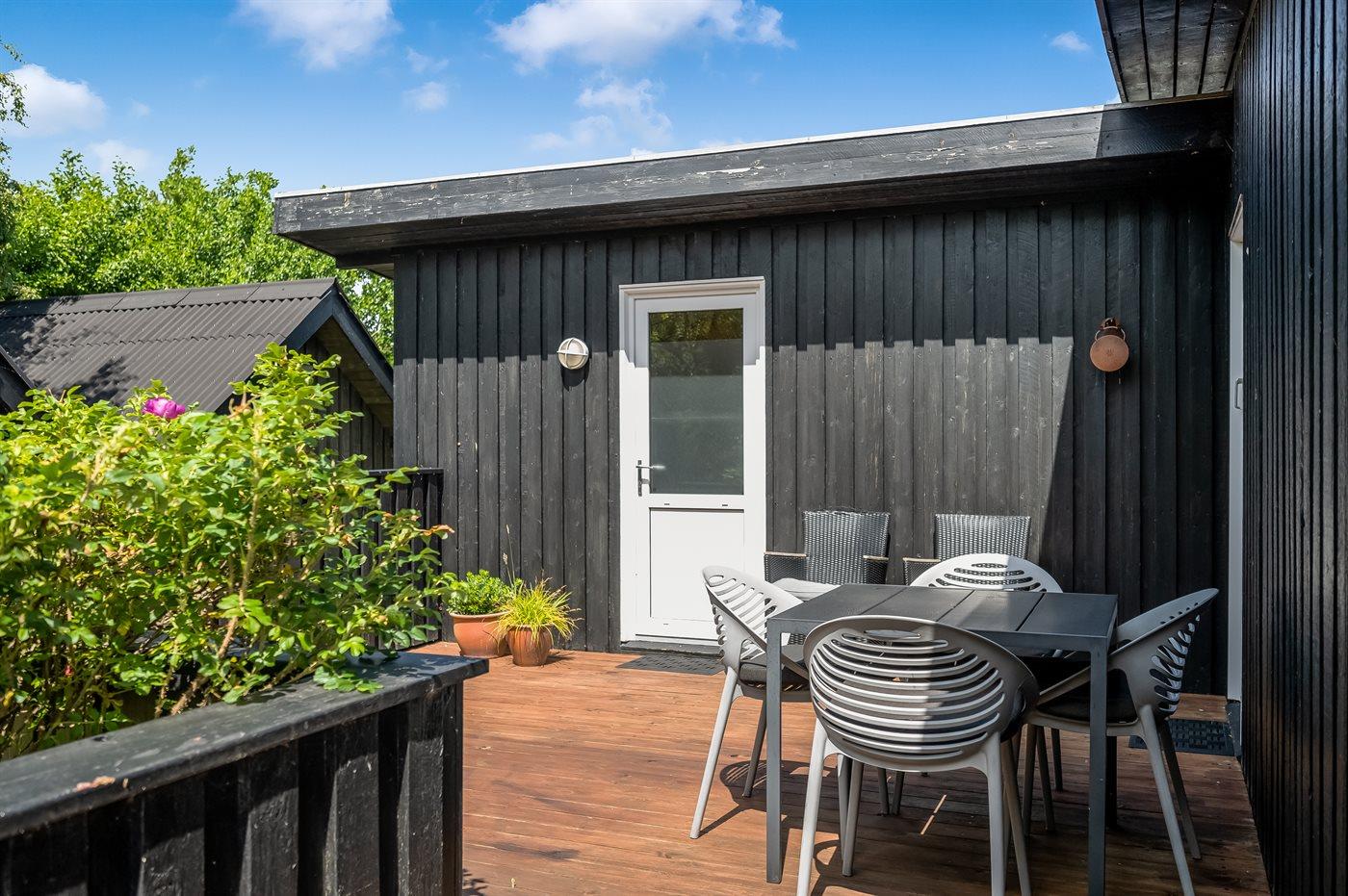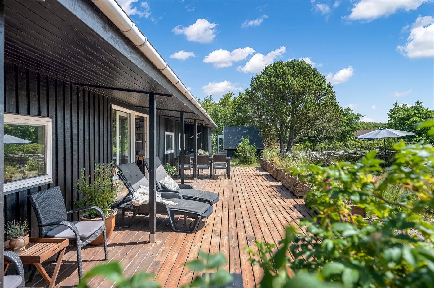 Moderne sommerhus i Rindby Strand med fire terrasser og kun 1 km til stranden, perfekt til afslapning i naturskønne omgivelser.