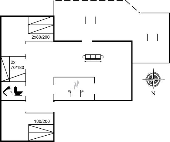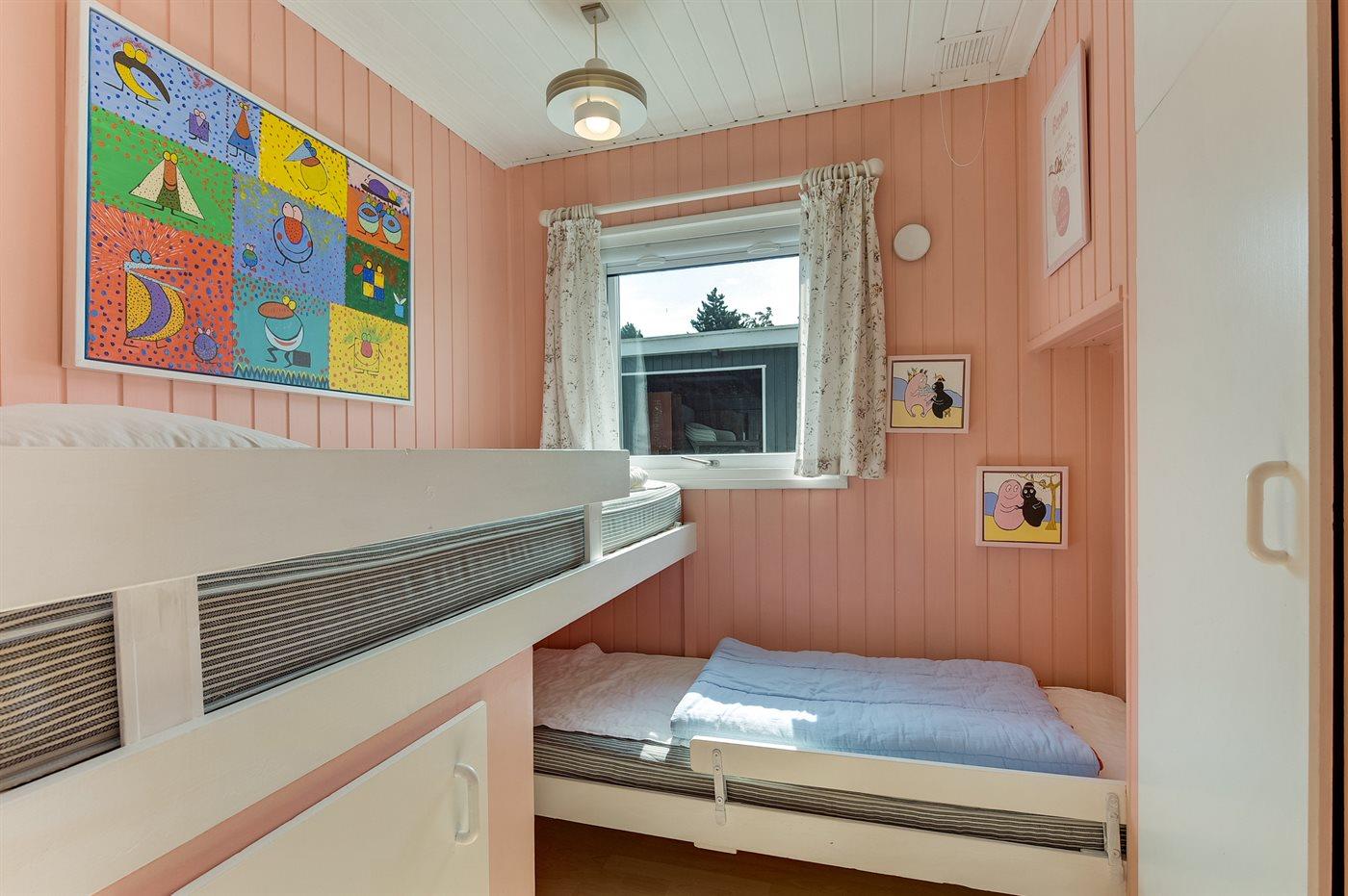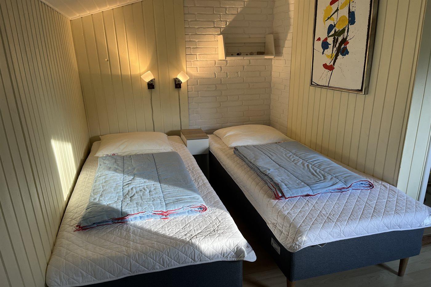 Der er i alt 3 soveværelser. Sovepladserne fordeler sig på: 2 sovepladser i dobbeltseng. 2 sovepladser i enkeltsenge. 2 sovepladser i køjeseng. Derudover er der 1 stk. barneseng.