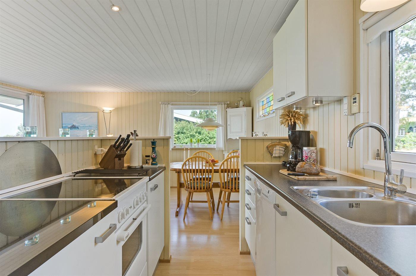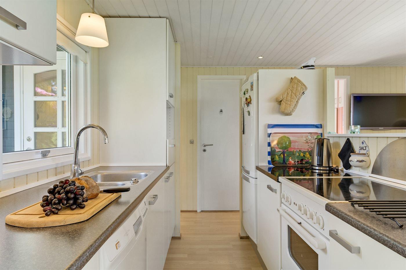 Køkkenet er udstyret med 1 køleskab. Der er 4 keramiske kogeplader, varmluftovn, mikrobølgeovn samt opvaskemaskine.