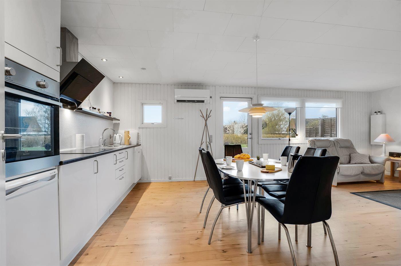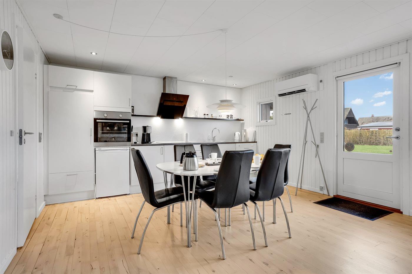 Køkkenet er udstyret med 1 køleskab. Der er 4 induktionskogeplader, varmluftovn, mikrobølgeovn samt opvaskemaskine.