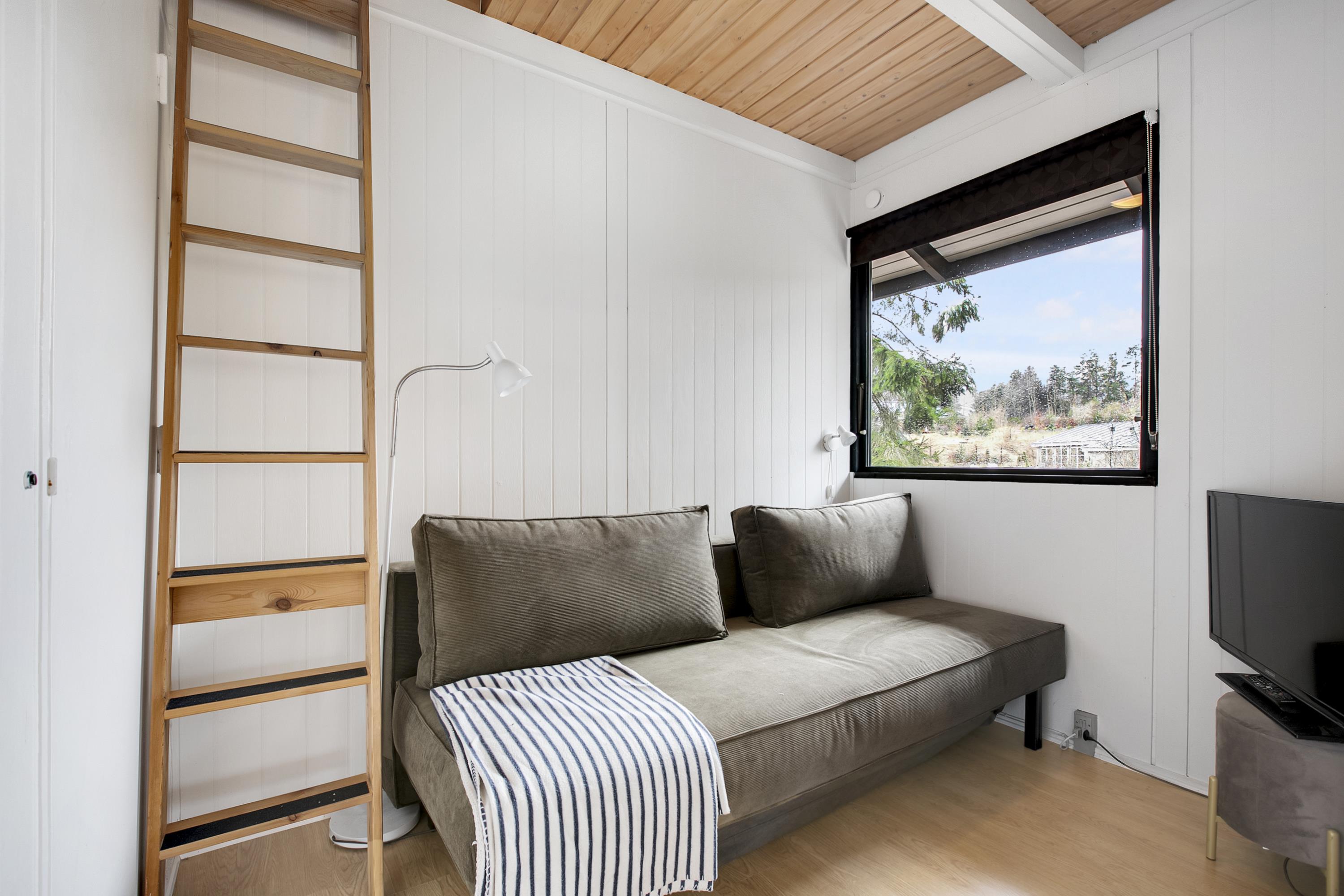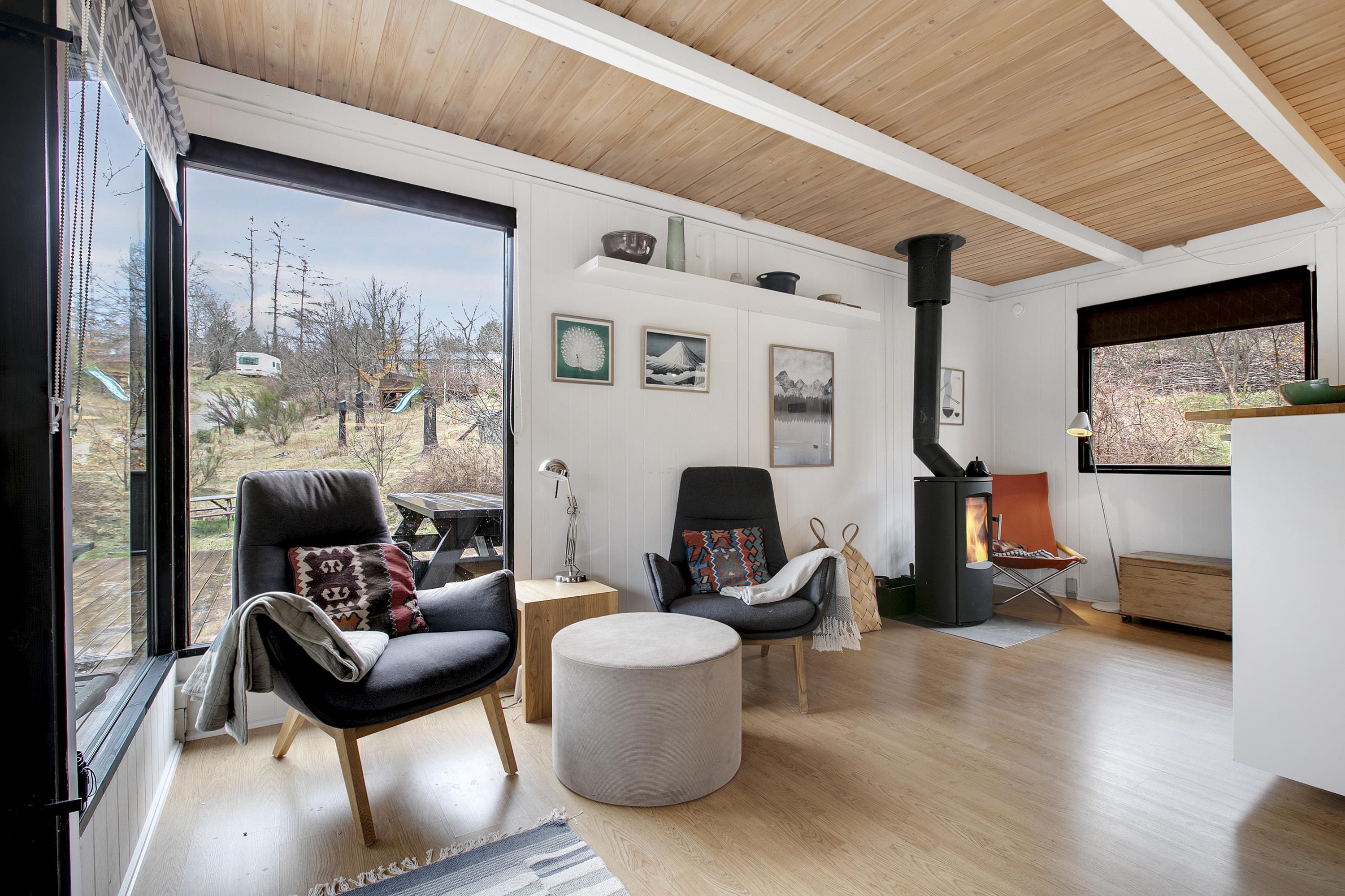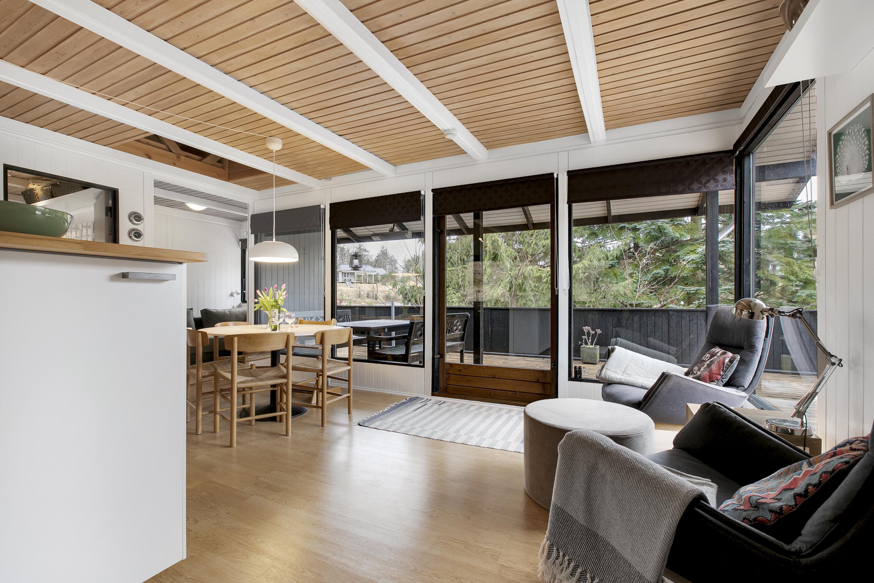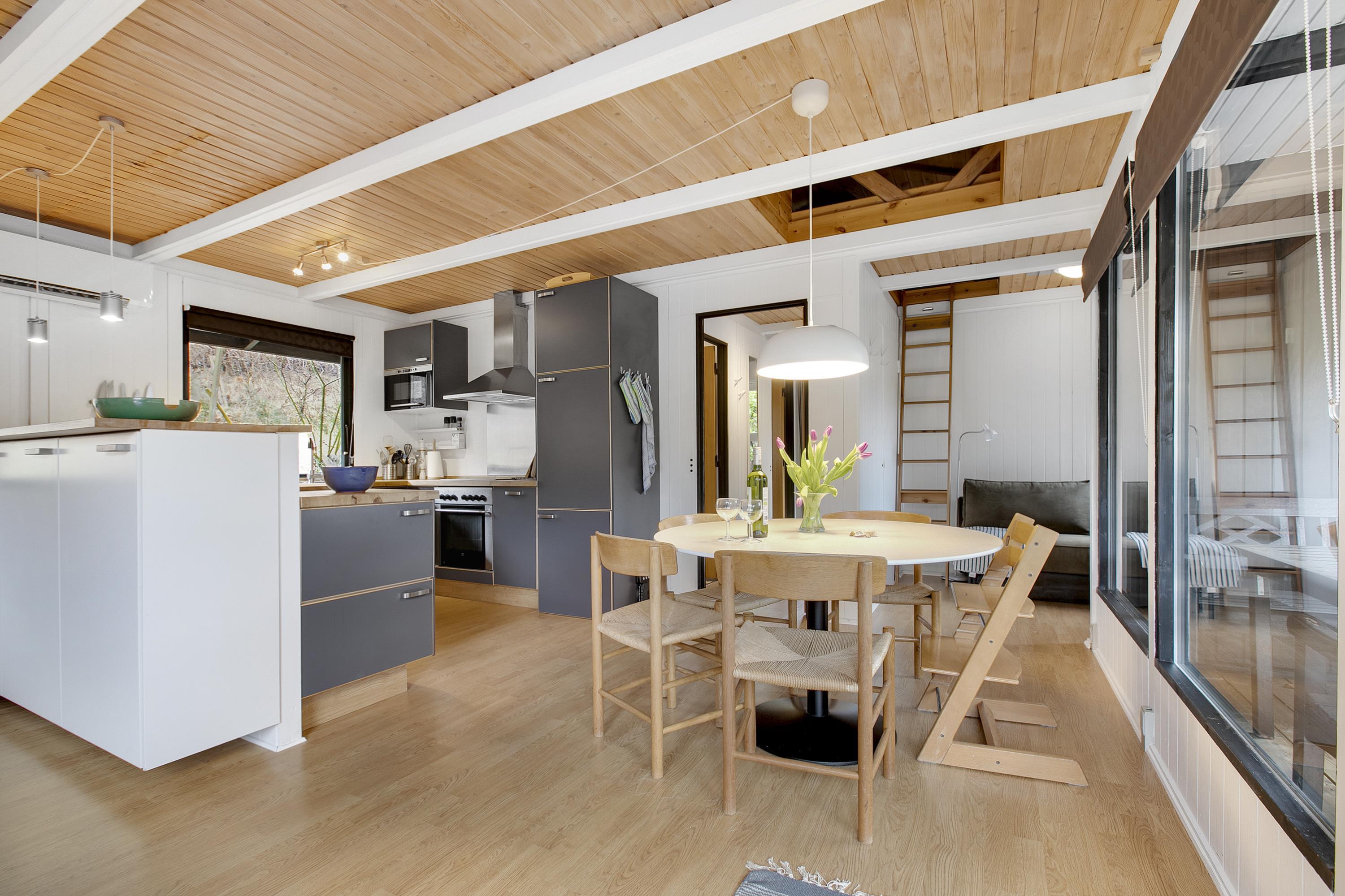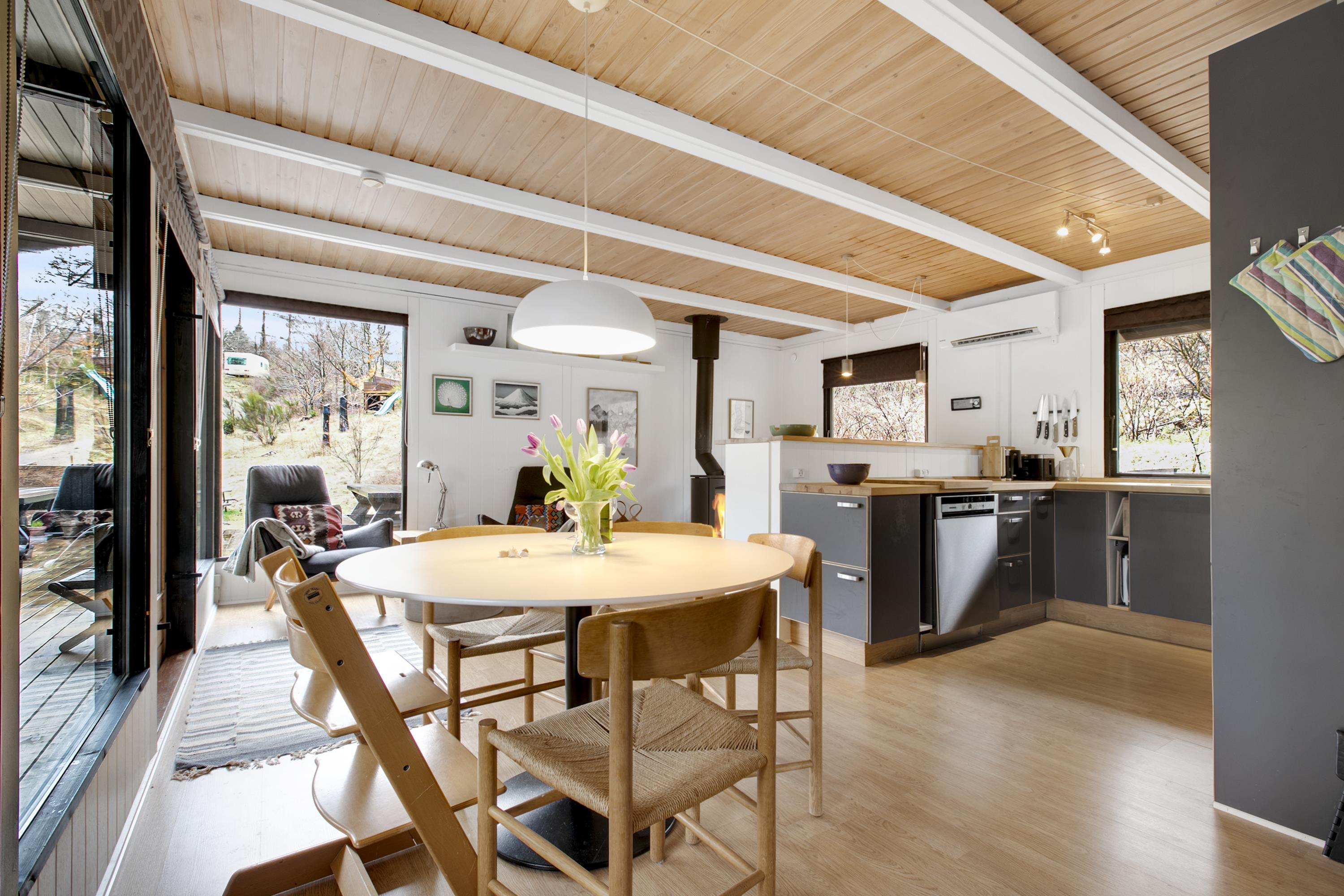 Huset fremstår overalt åbent og indbydende med masser af lysindfald. Den smukt og enkelt møblerede opholdsstue med udgang til terrasse ligger i åben forbindelse med køkken og har spiseafdeling til 5 personer - 3 voksne og 2 børn, brændeovn, samt fladskærms-TV med chromecast – bemærk, at der ingen kanaler er tilkoblet, alt indhold skal streames fra PC eller andet medie. Nyere lækkert køkken med keramiske kogeplader, ovn, køle-/fryseskab og opvaskemaskine. Husets 5 sovepladser fordeler sig på 1 værelse med dobbeltseng og 1 værelse med 2 enkeltsenge, beregnet til børn, samt en sovesofa i stuen. Pænt, oprindeligt badeværelse med bruseniche og vaskemaskine. Huset har varmepumpe med aircondition. Der er barnestol til de mindste. Internetadgang.