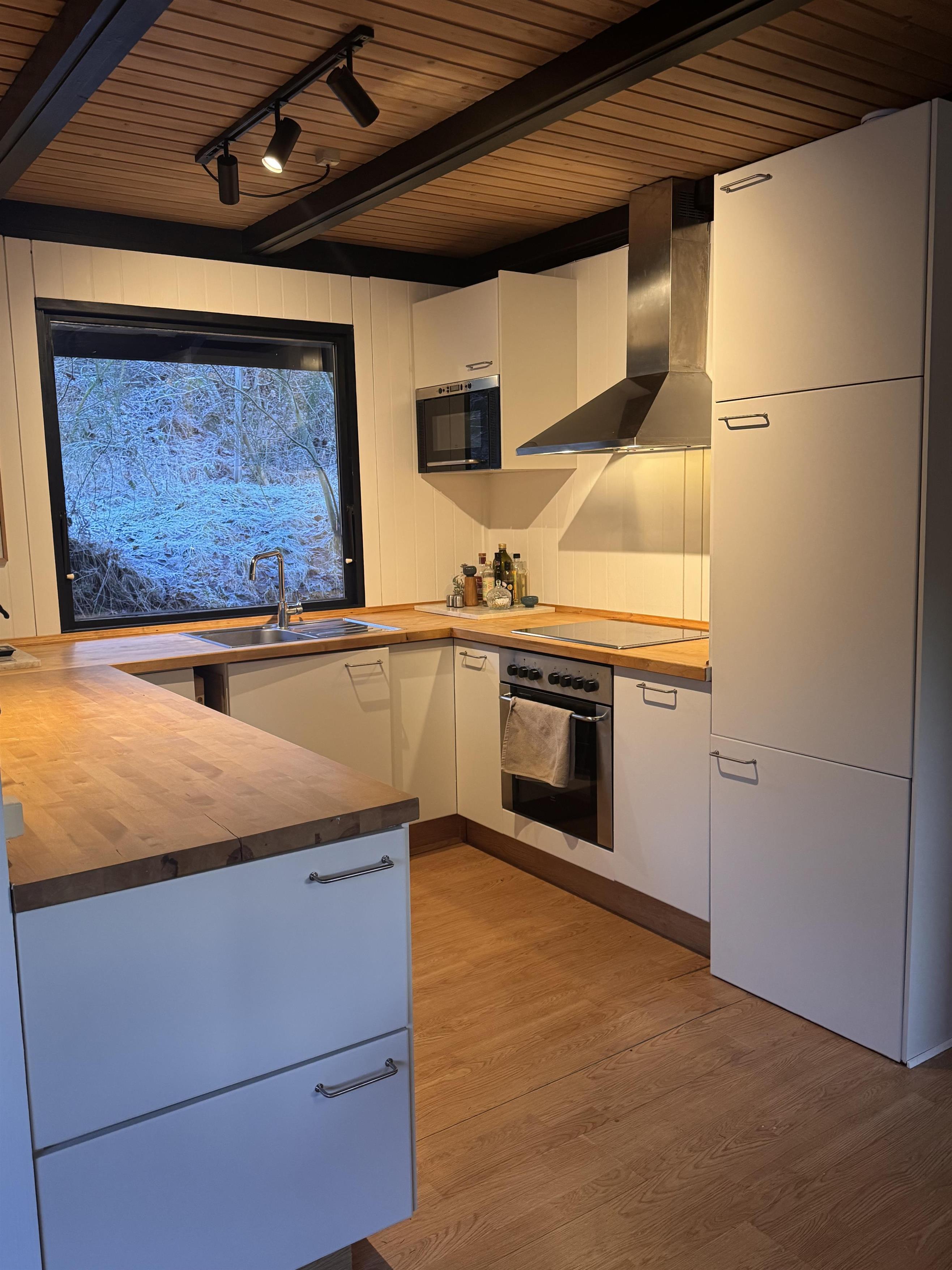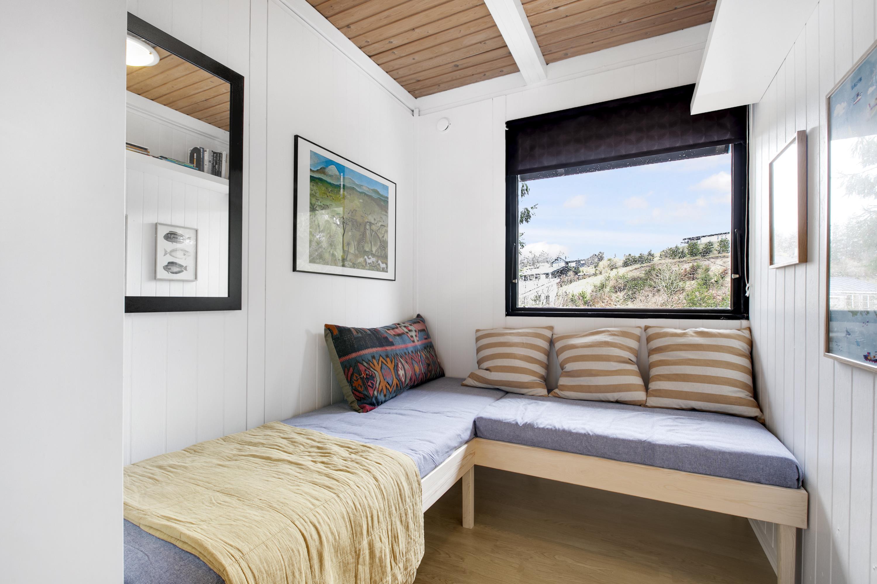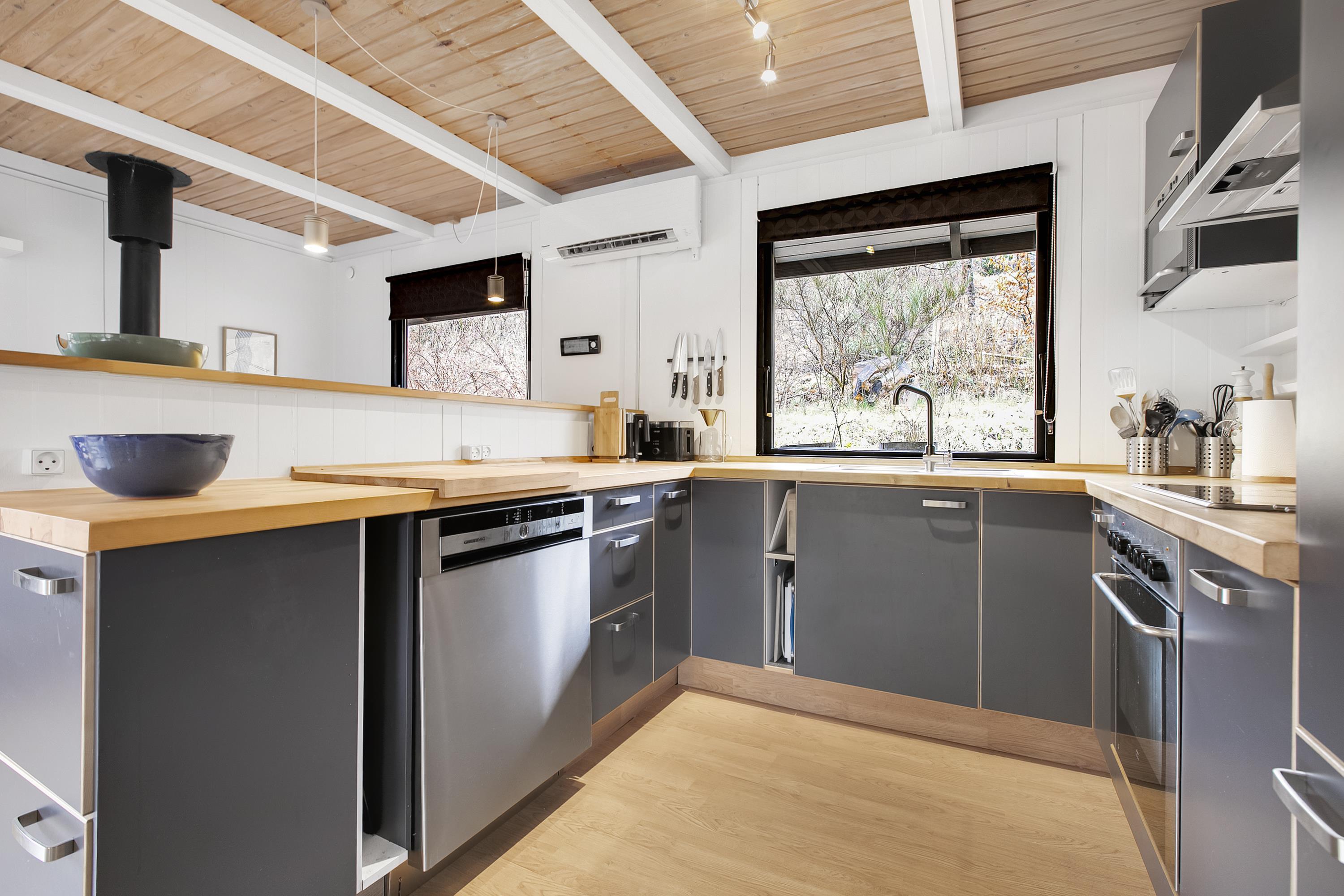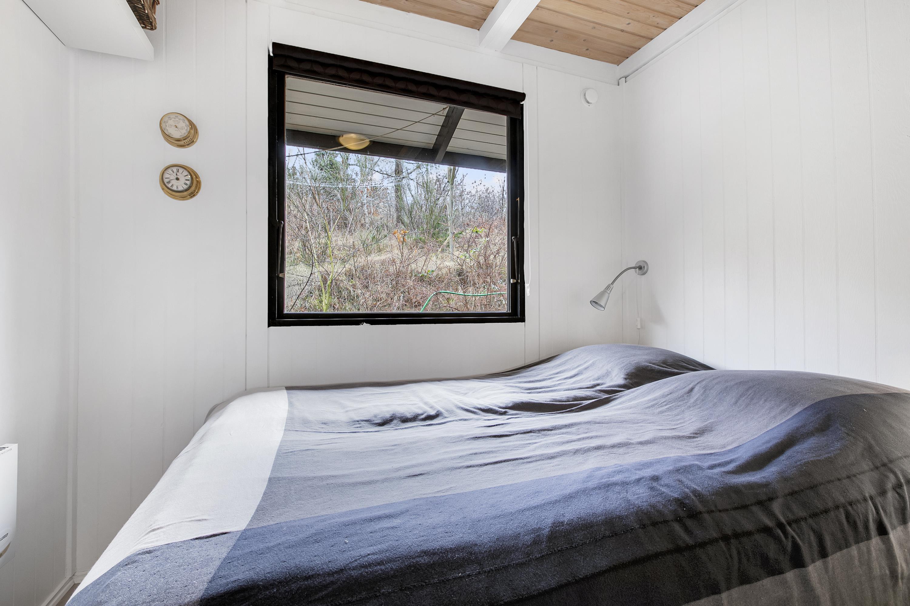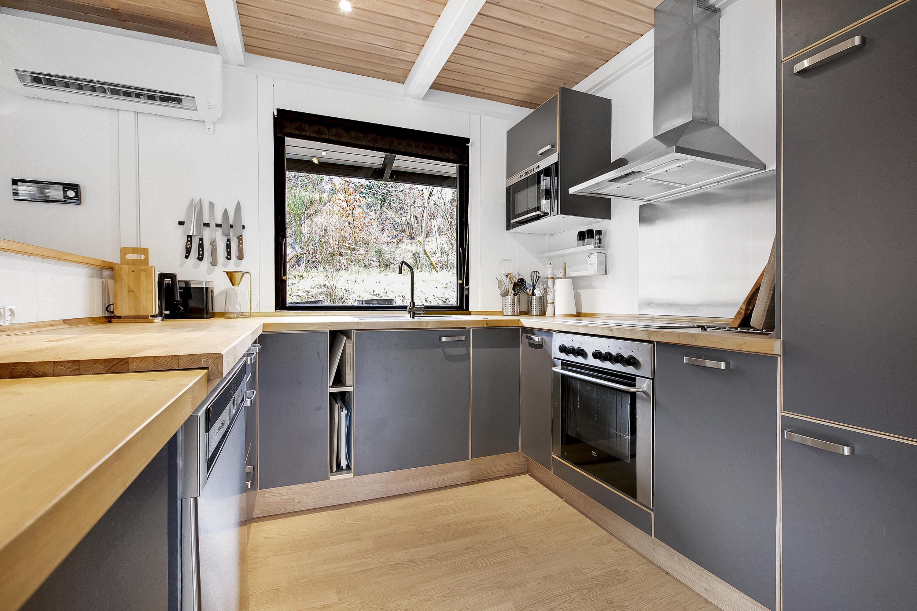 Huset fremstår overalt åbent og indbydende med masser af lysindfald. Den smukt og enkelt møblerede opholdsstue med udgang til terrasse ligger i åben forbindelse med køkken og har spiseafdeling til 5 personer - 3 voksne og 2 børn, brændeovn, samt fladskærms-TV med chromecast – bemærk, at der ingen kanaler er tilkoblet, alt indhold skal streames fra PC eller andet medie. Nyere lækkert køkken med keramiske kogeplader, ovn, køle-/fryseskab og opvaskemaskine. Husets 5 sovepladser fordeler sig på 1 værelse med dobbeltseng og 1 værelse med 2 enkeltsenge, beregnet til børn, samt en sovesofa i stuen. Pænt, oprindeligt badeværelse med bruseniche og vaskemaskine. Huset har varmepumpe med aircondition. Der er barnestol til de mindste. Internetadgang.