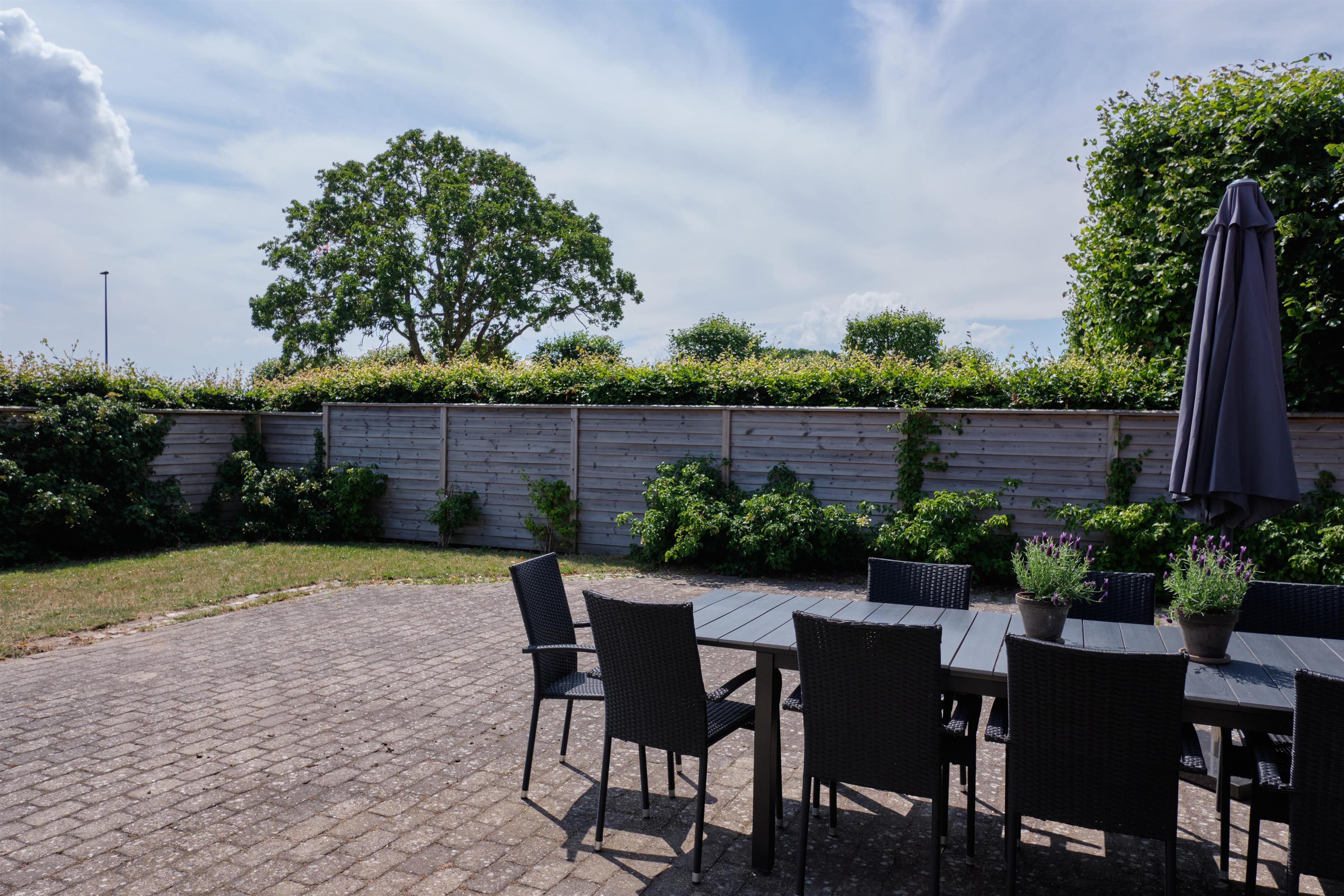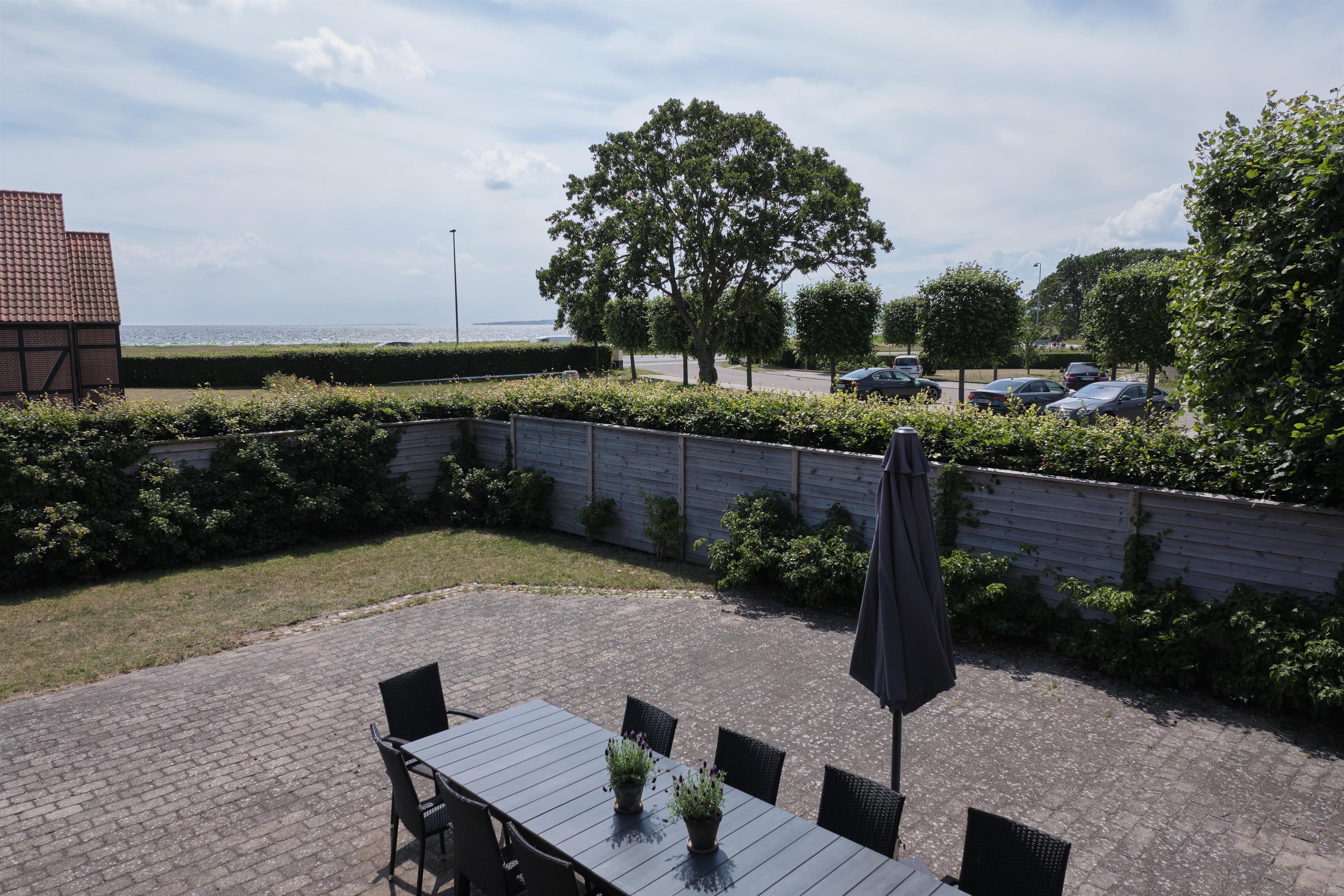 Rummeligt feriehus nær Femmøller Strand med stor terrasse, havemøbler, og panoramaudsigt til Ebeltoft Vig.