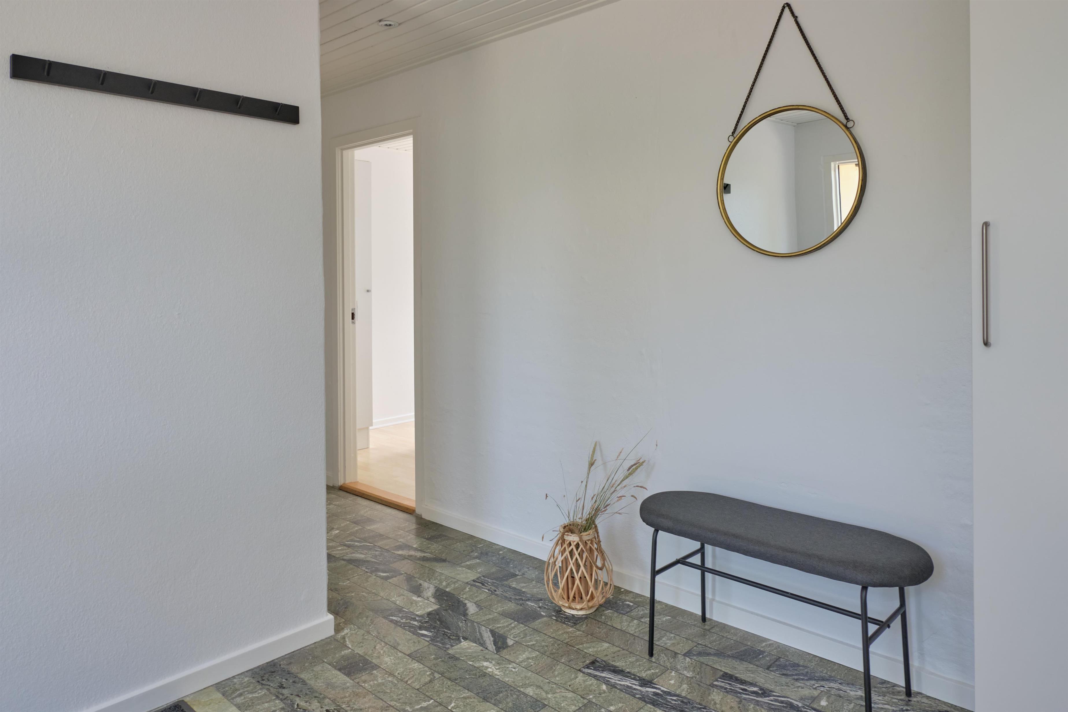 I anden række ved maleriske Femmøller Strand ligger dette usædvanligt rummelige og gennemførte feriehus med plads til den store eller flere familier. Den store, sydøstvendte fliseterrasse med kig til Ebeltoft Vig har gode havemøbler, liggestole, parasol og grill. Der er bare 150 meter til børnevenlig sandstrand og en kort spadseretur til den lokale købmand, og på den anden side af vejen ligger den legendariske Molskro.