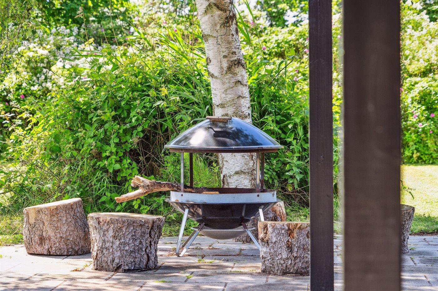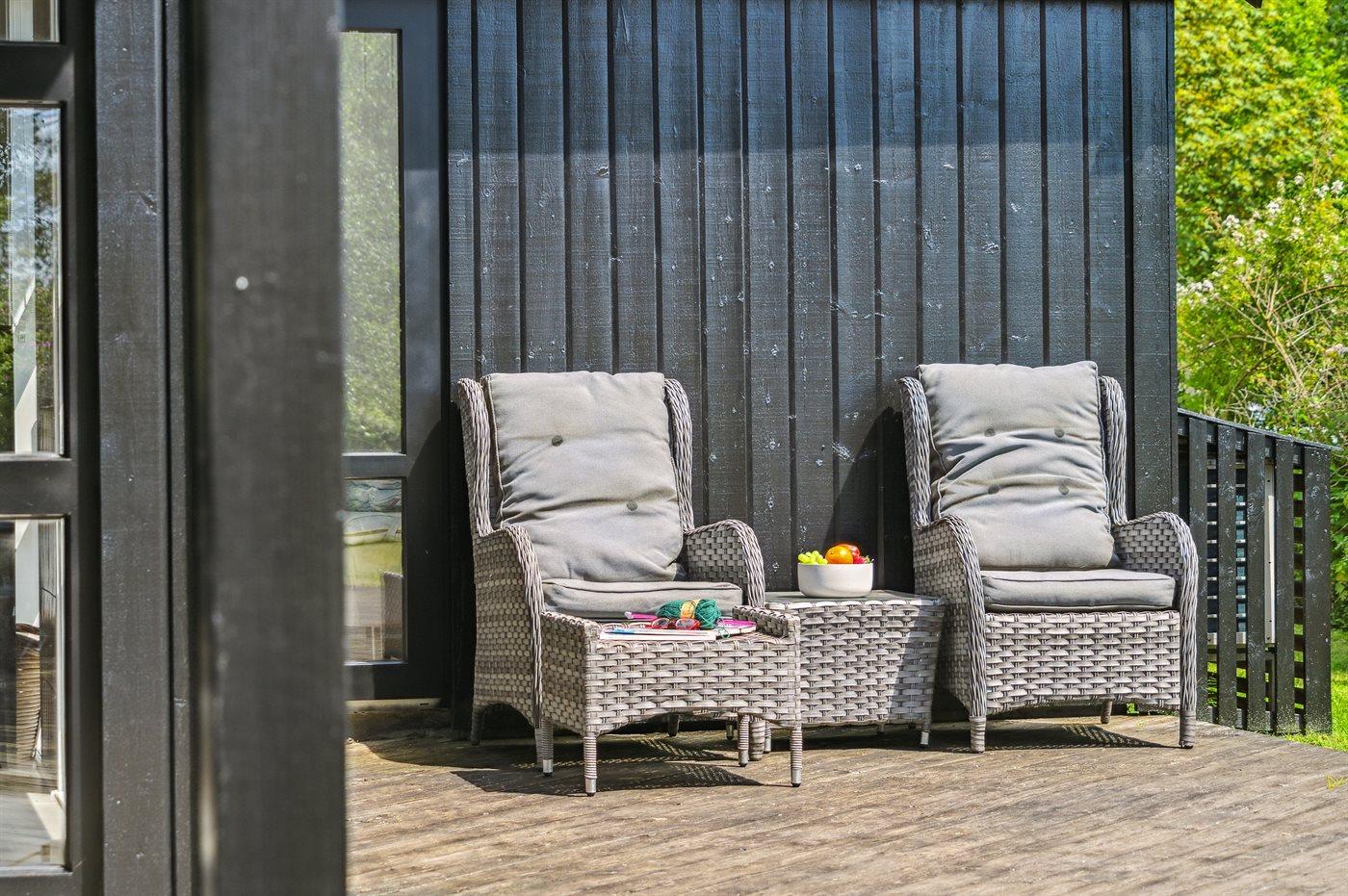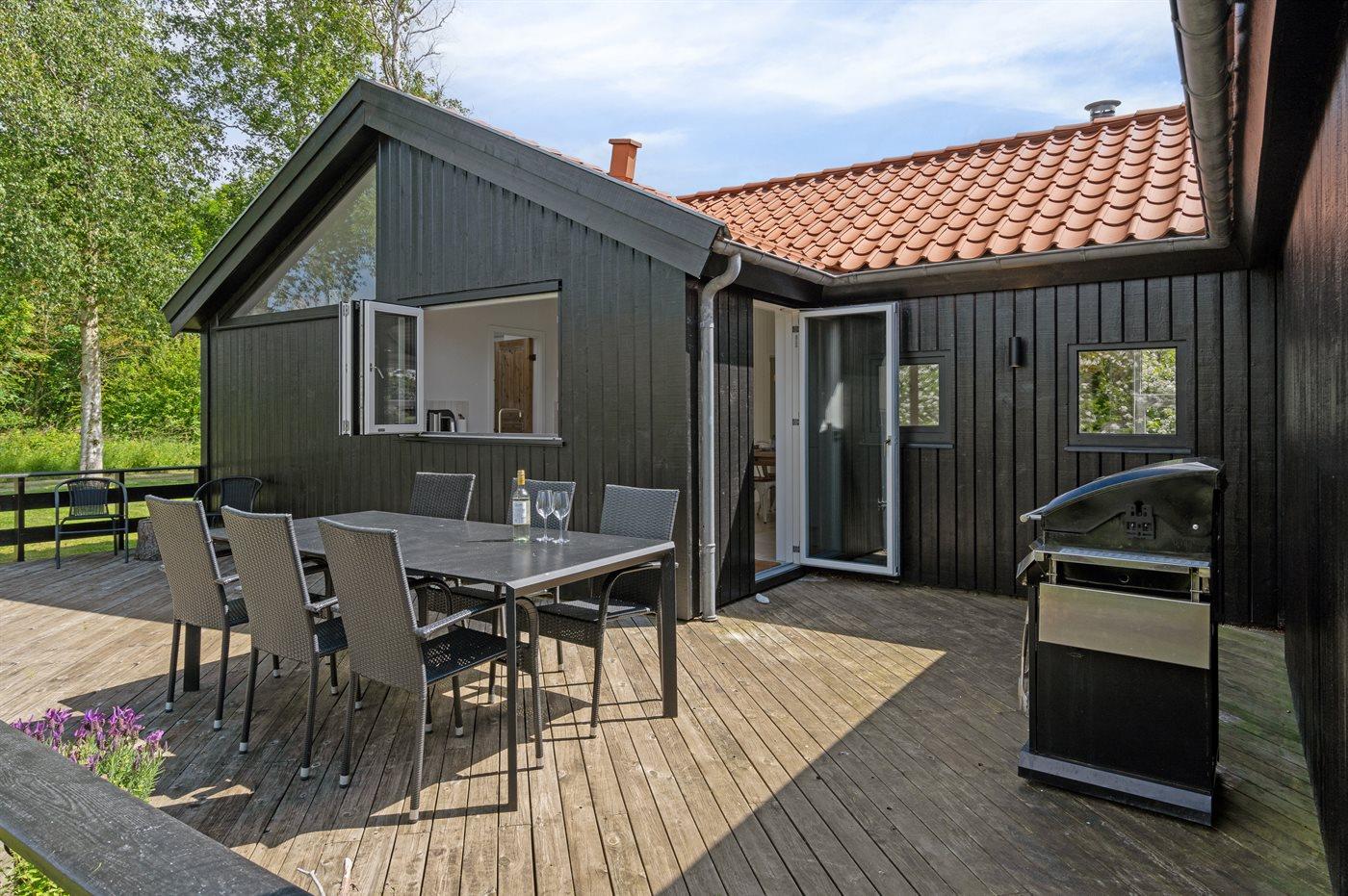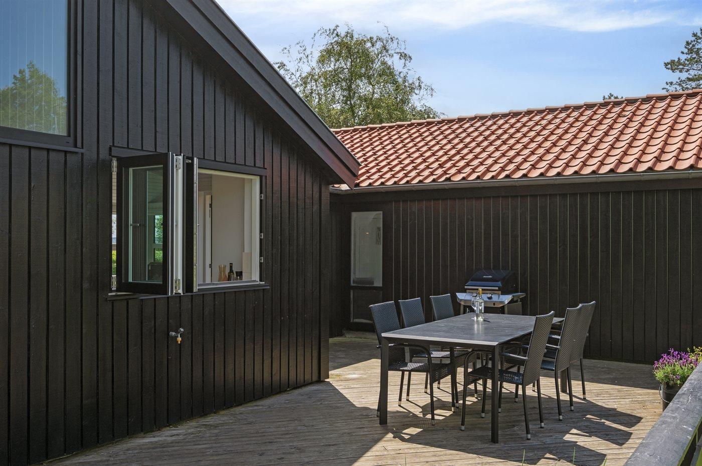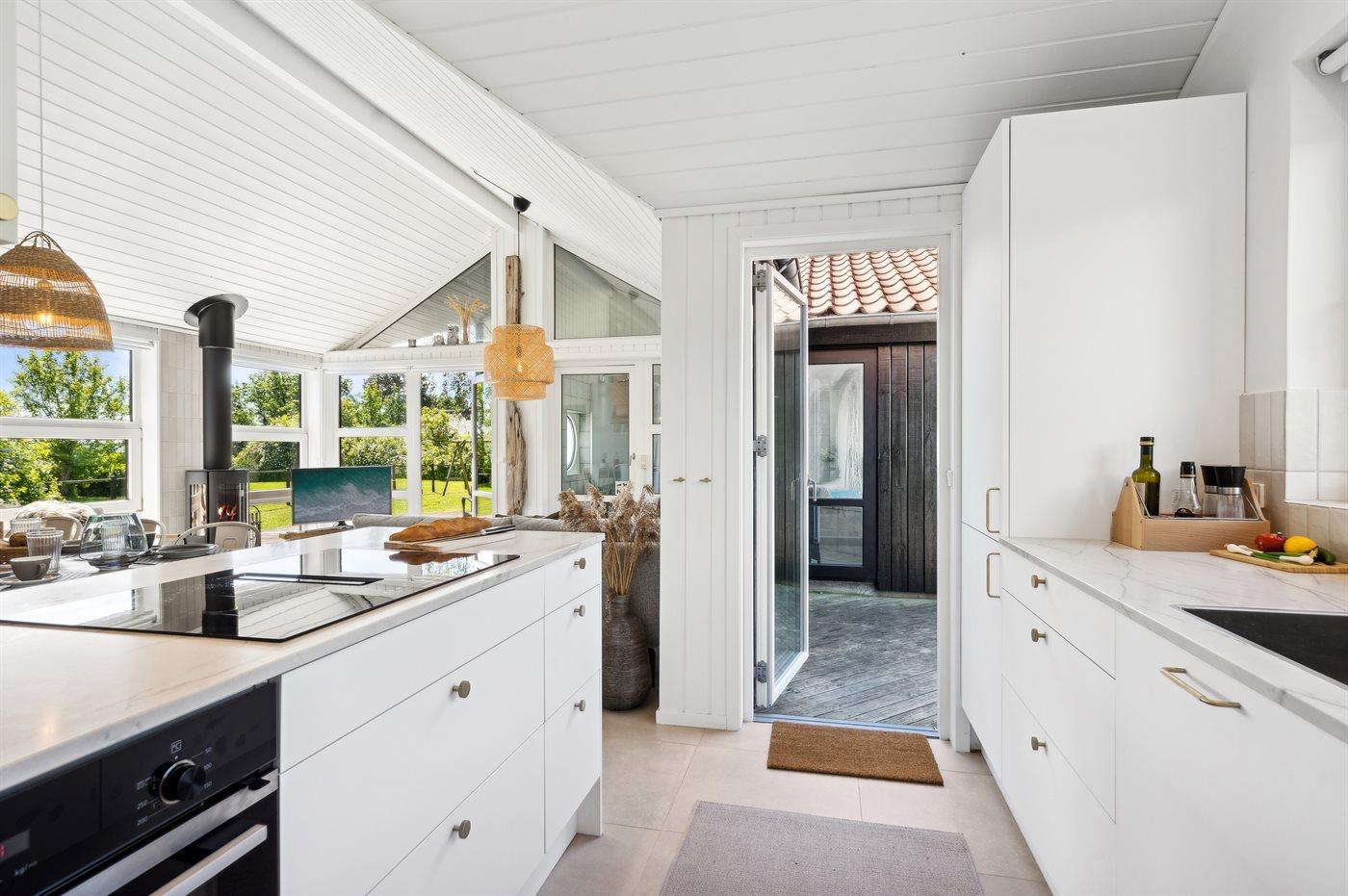 Lige udenfor køkkenet kan du nyde aftensolen på en ugeneret terrasse som er udstyret med grill og der er et stort "bar "vindue som kan åbnes helt op så terrasseområdet, hænger godt sammen med køkkenet.