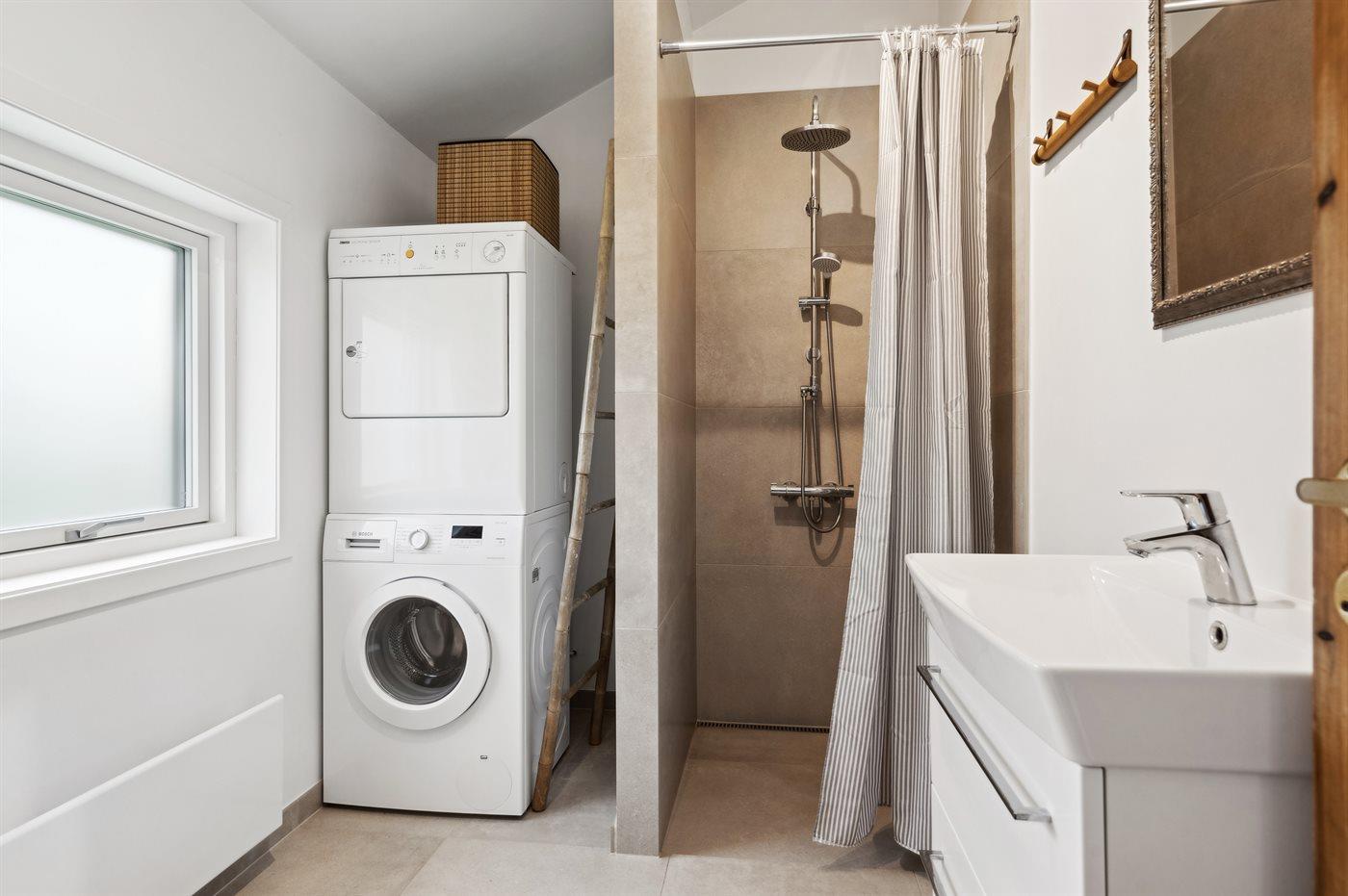 Skønt nyt badeværelse med opvarmet klinkegulv, lækker stor bruseniche, vaskemaskine og tørretumbler. Badeværelset er lyst med hvide gibs beklædte væge og lofter.