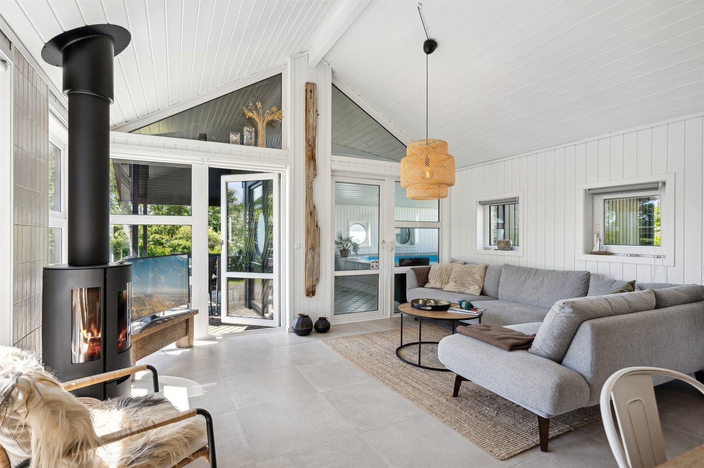 Indenfor i stuen er der en stor hjørnesofa og tv, så der er god plads til alle mand. I ferieboligen findes smart-TV, Chromecast og Apple-TV. Der er mindst 4 danske kanaler. 1-3 svenske kanaler. 1-3 norske kanaler. Mindst 4 tyske kanaler. 1-3 engelske kanaler. Der er trådløst internet til rådighed.