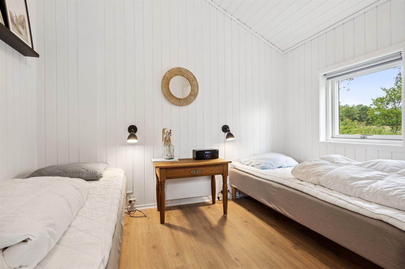 Væggene og lofterne er i resten af huset overalt beklædt med hvid malet paneler, hvilket giver en rigtig sommerhusstemning.