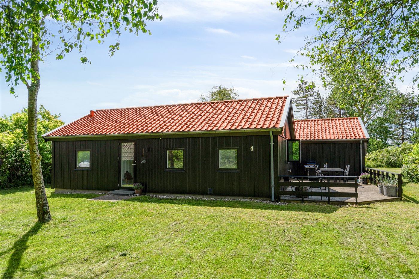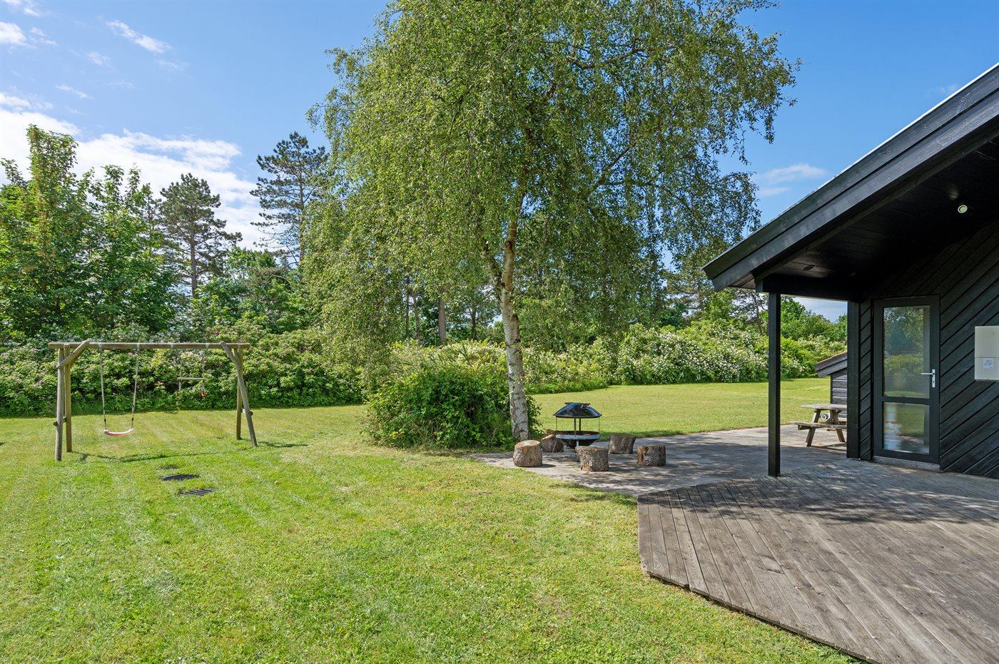 Hyggeligt træsommerhus nær Femmøller Strand med pool, spa, sauna og havudsigt på stor naturgrund.