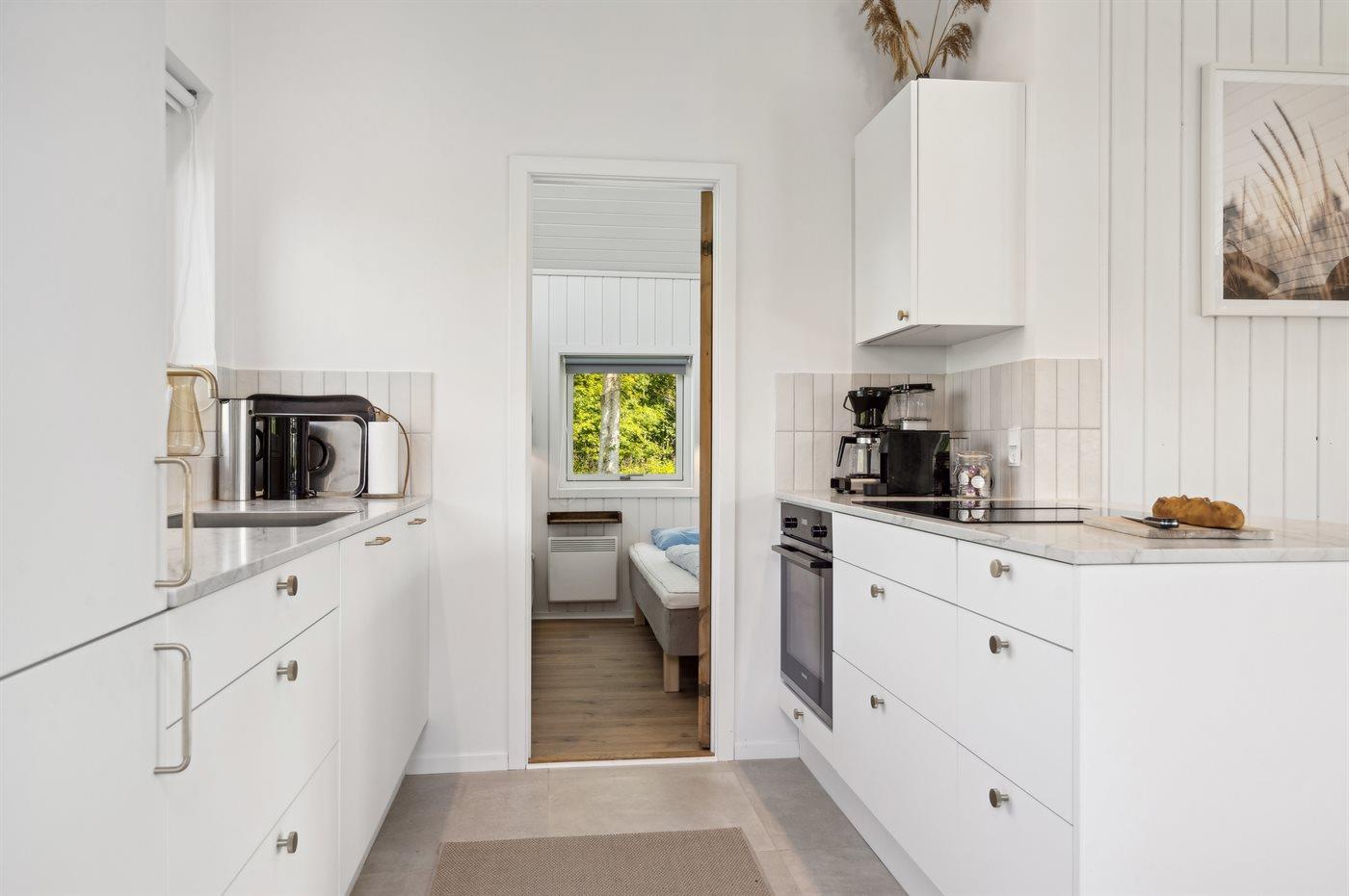 Køkken er helt nyt åbent og veludstyret med induktionskogeplade med indbygget emhætte, opvasker, ovn og kølefryseskab, perfekt til madlavning og hyggelige måltider sammen.
