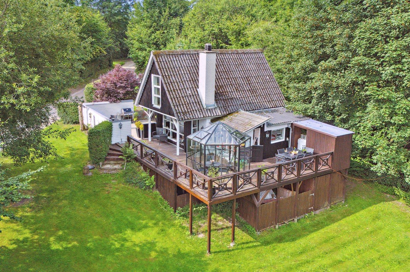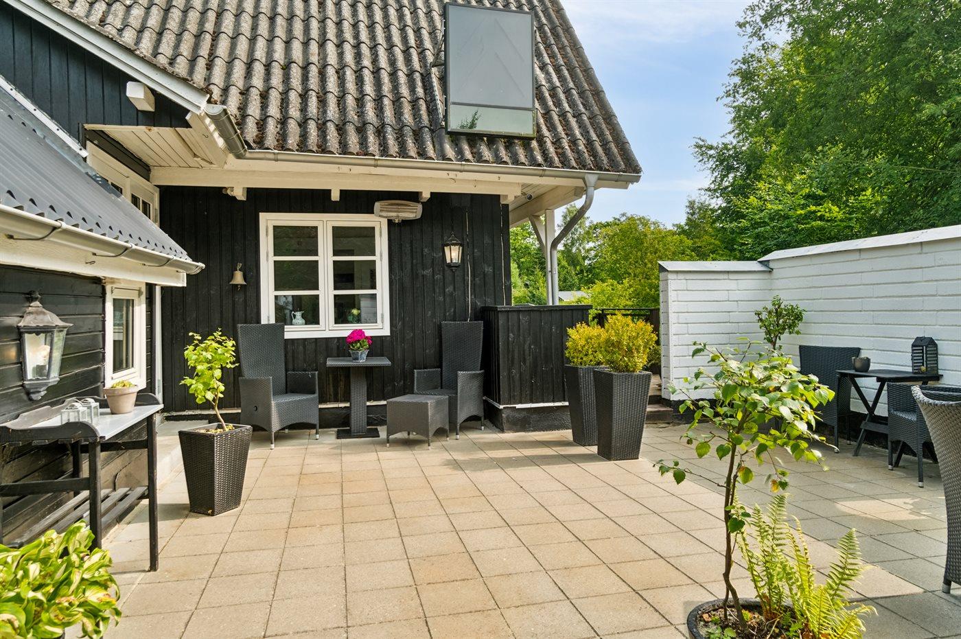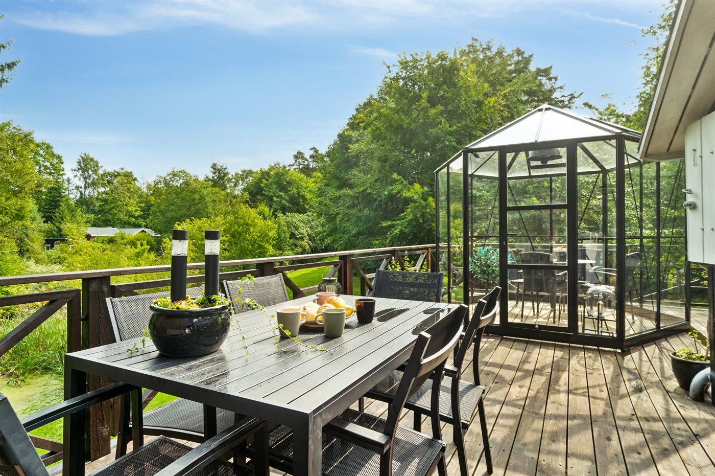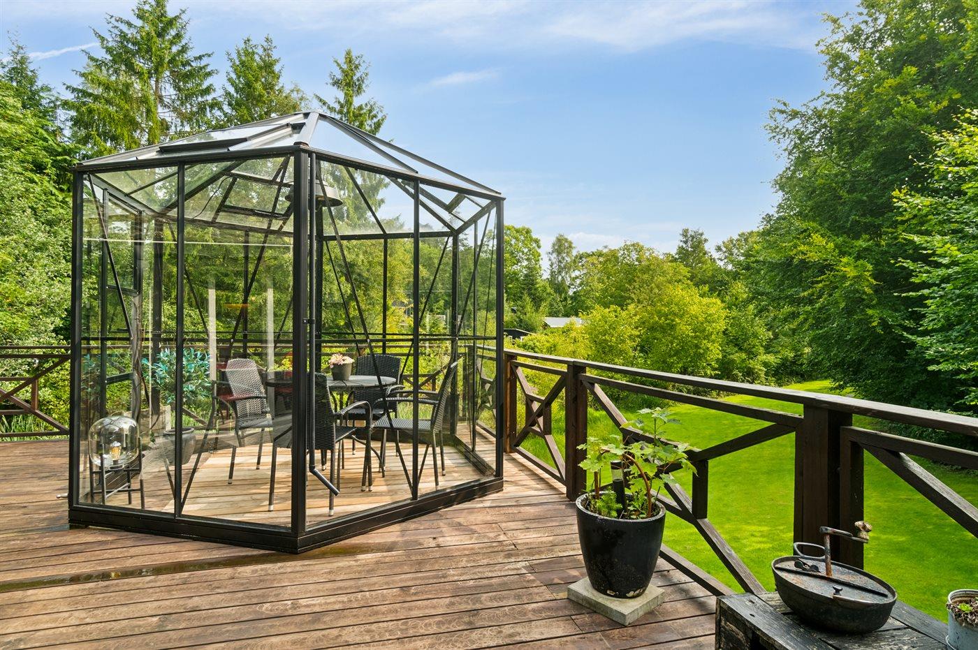 Udenfor har huset terrasser hele vejen rundt, hvor særligt den hyggelige gårdhave bør fremhæves. Sent på aftenen indbyder husets orangeri til at forlænge sommeraftenerne. Huset ligger på en fantastisk grund, og fra træterrassen er der udsigt til smuk natur og fredelige omgivelser.