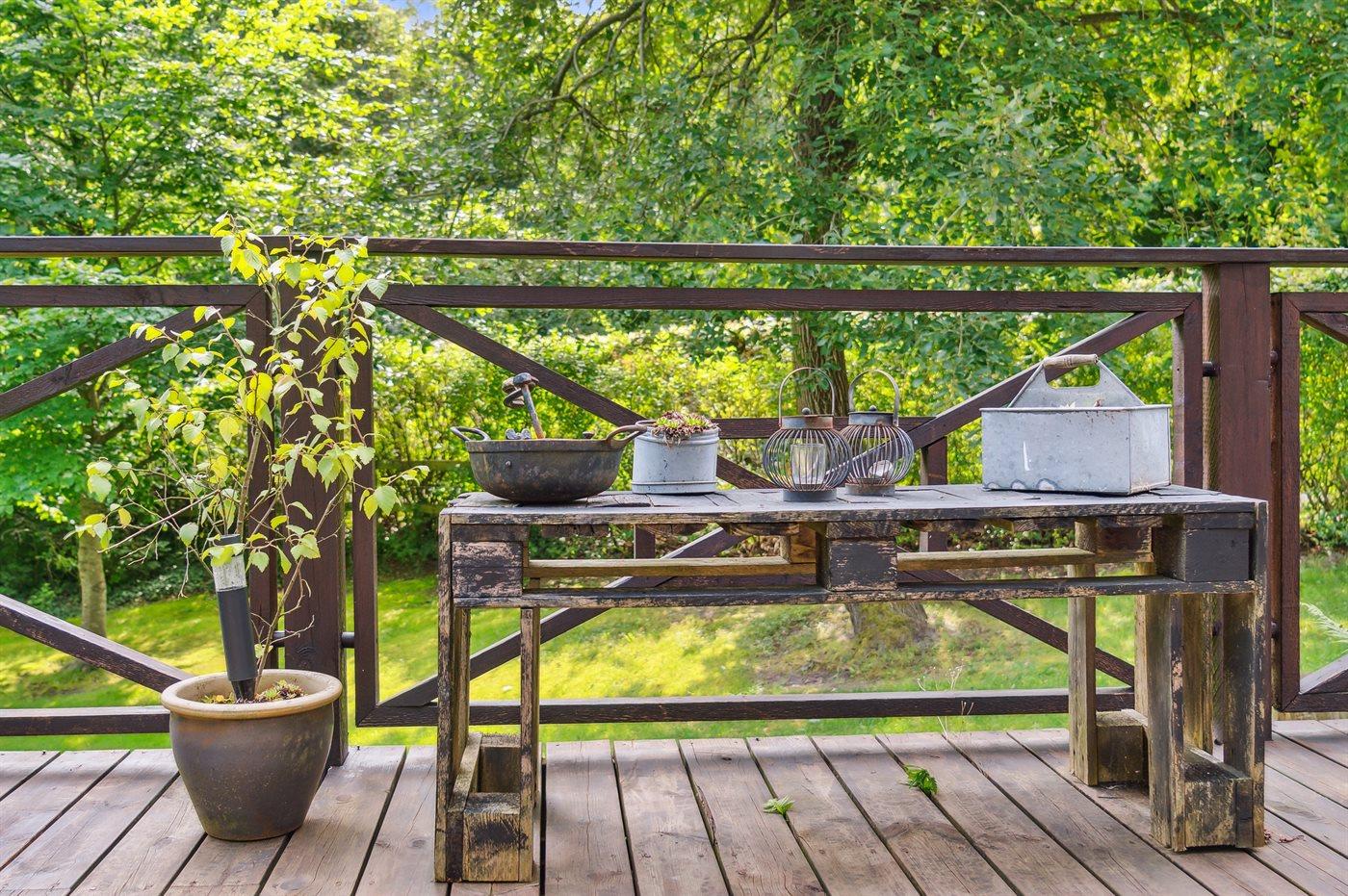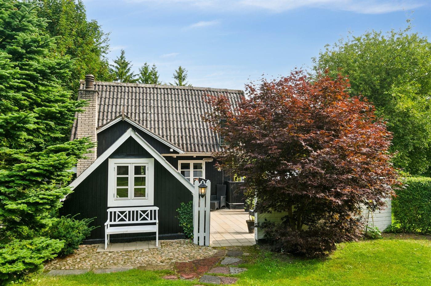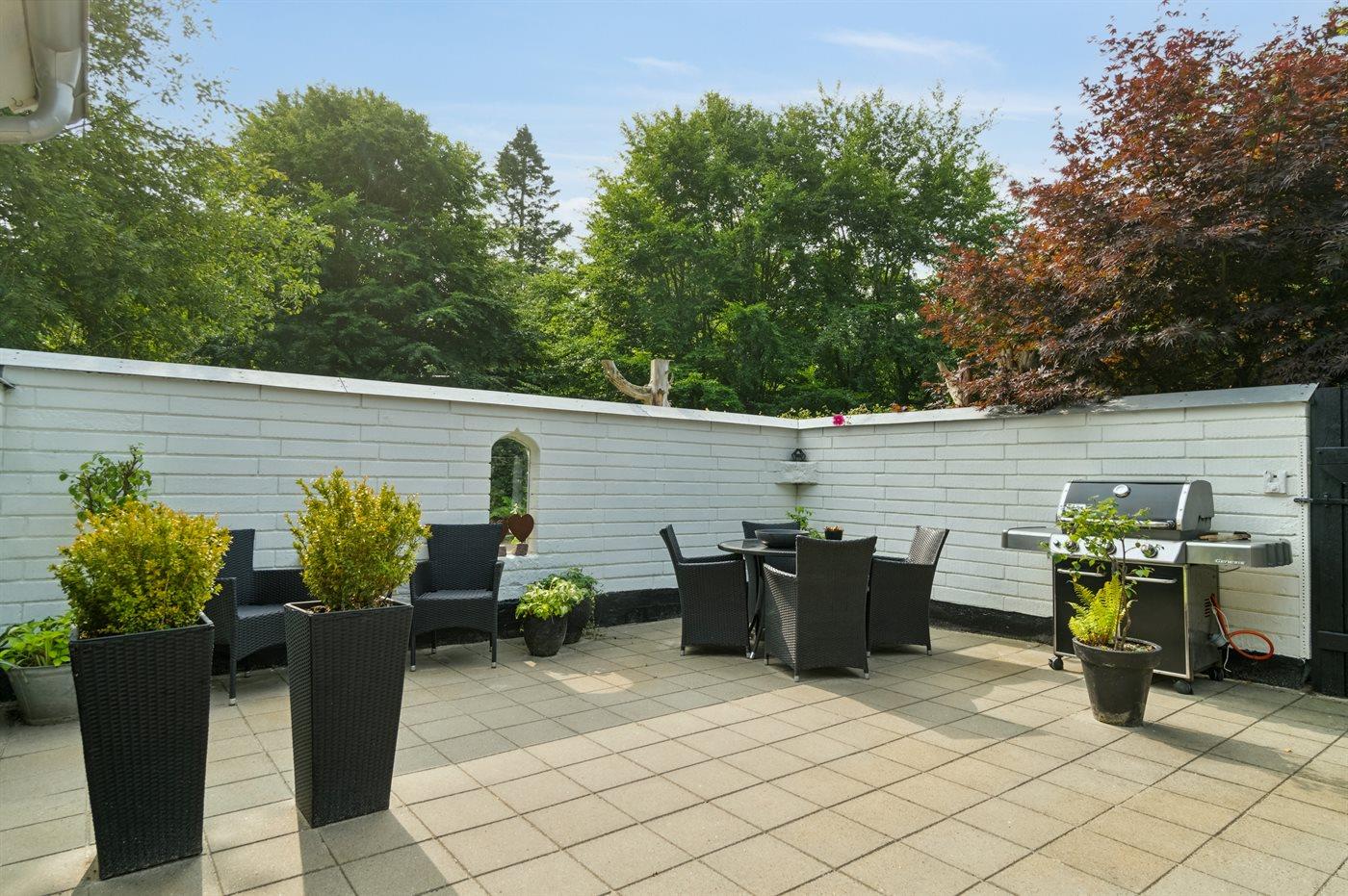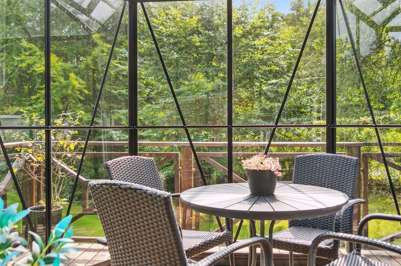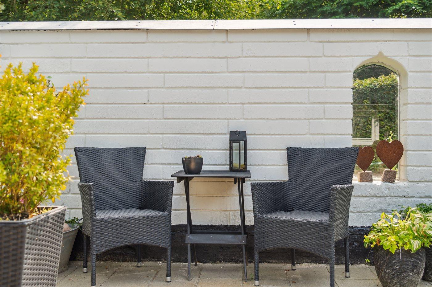 Udenfor har huset terrasser hele vejen rundt, hvor særligt den hyggelige gårdhave bør fremhæves. Sent på aftenen indbyder husets orangeri til at forlænge sommeraftenerne. Huset ligger på en fantastisk grund, og fra træterrassen er der udsigt til smuk natur og fredelige omgivelser.