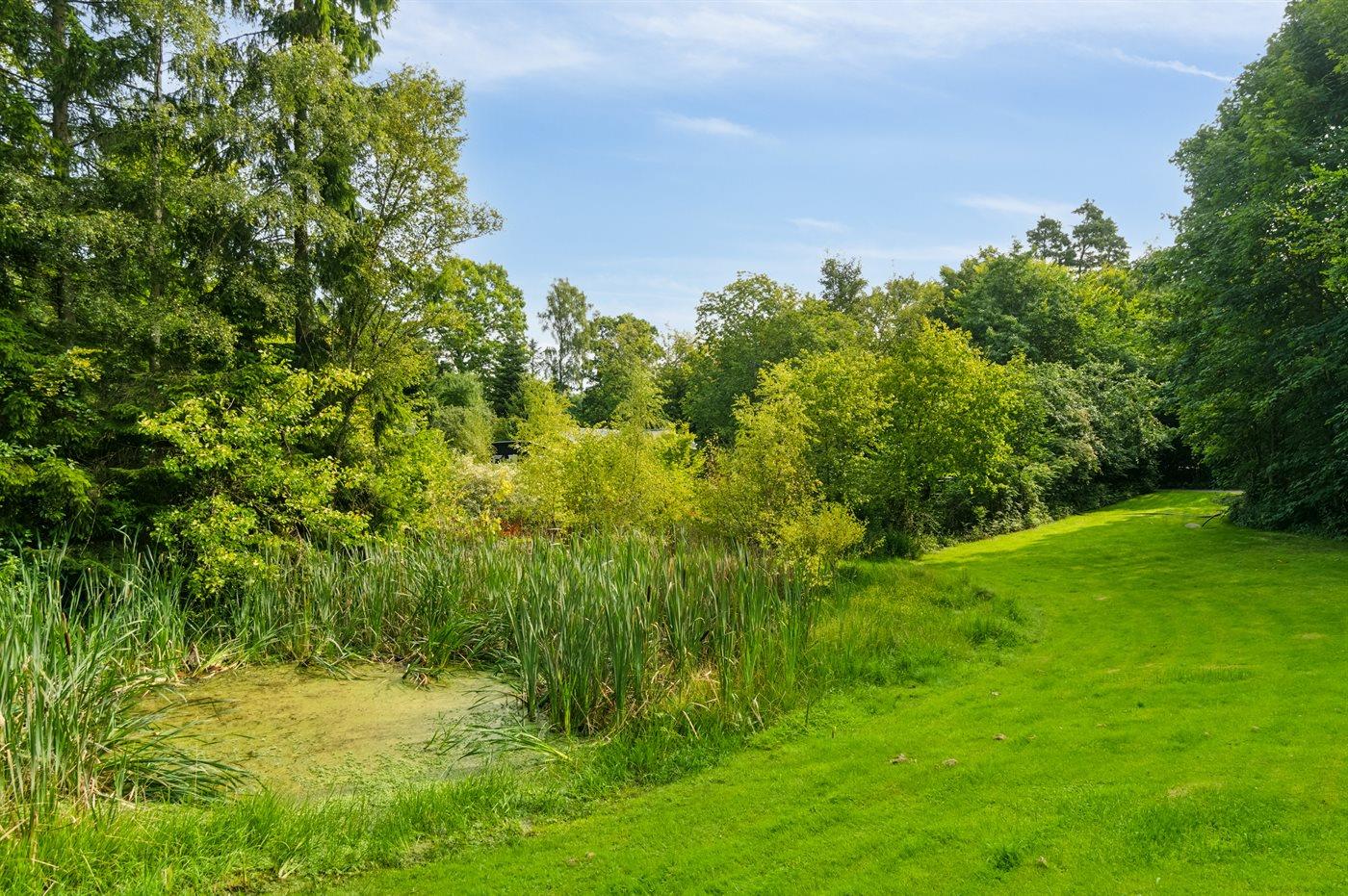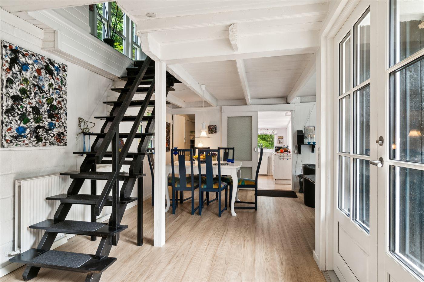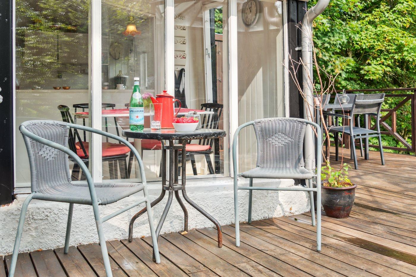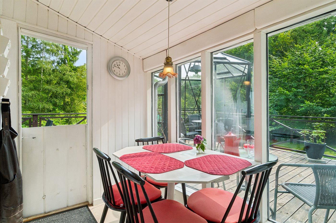 Udenfor har huset terrasser hele vejen rundt, hvor særligt den hyggelige gårdhave bør fremhæves. Sent på aftenen indbyder husets orangeri til at forlænge sommeraftenerne. Huset ligger på en fantastisk grund, og fra træterrassen er der udsigt til smuk natur og fredelige omgivelser.