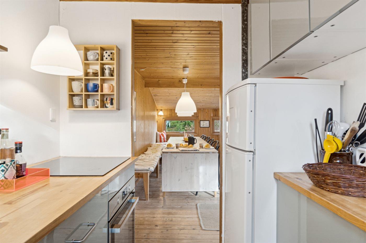 Køkkenet er udstyret med 1 køleskab. Der er 4 induktionskogeplader, varmluftovn samt opvaskemaskine.