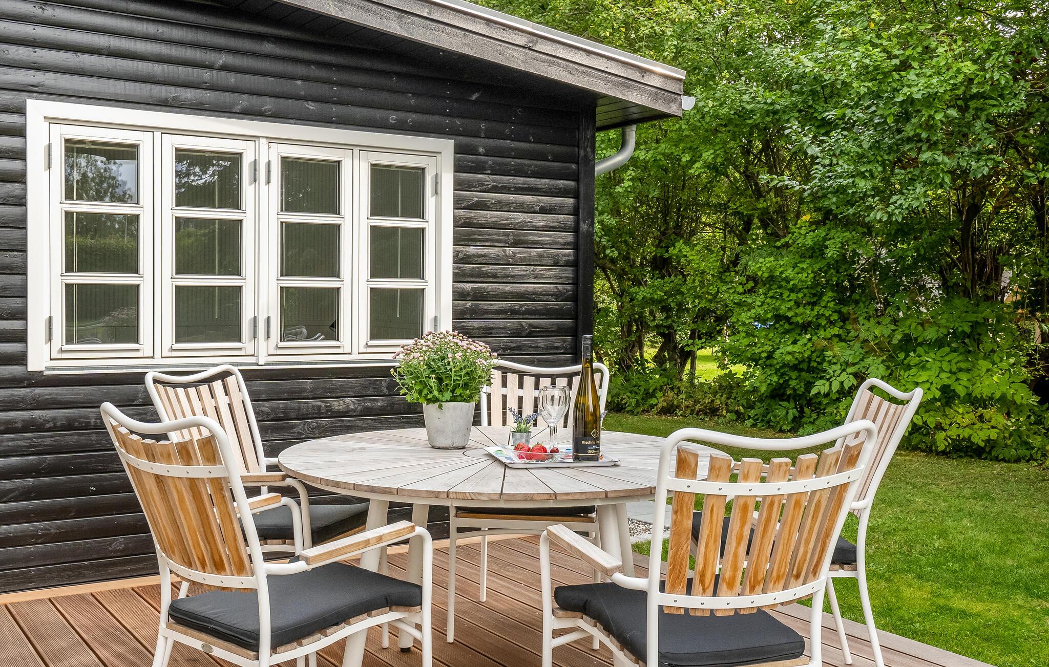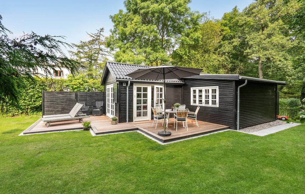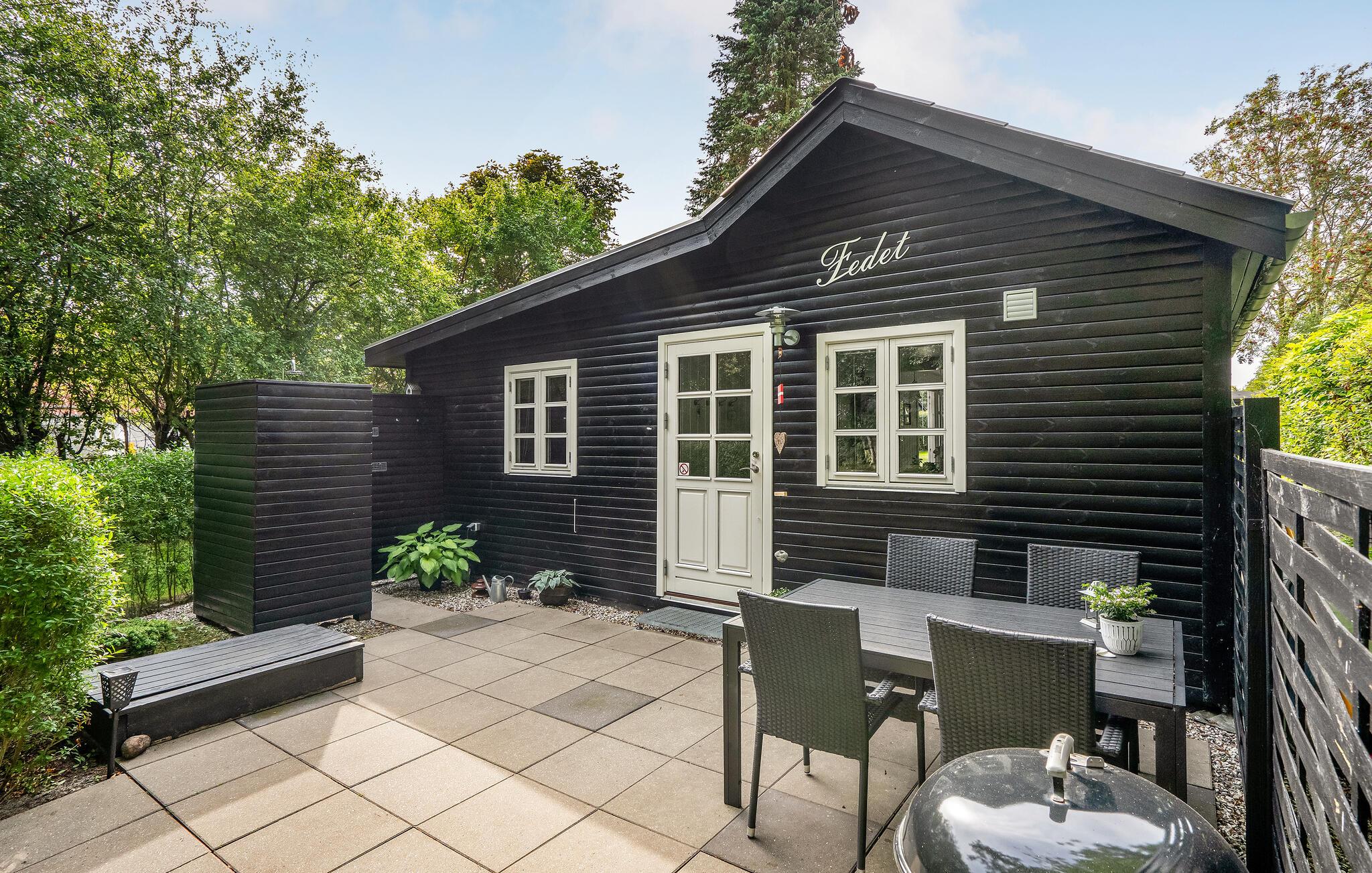 Hyggeligt træhus nær Femmøller Strand med terrasse og udendørs bruser, perfekt til afslapning og naturoplevelser.