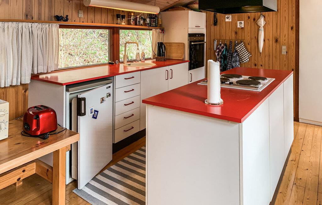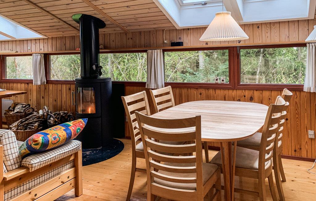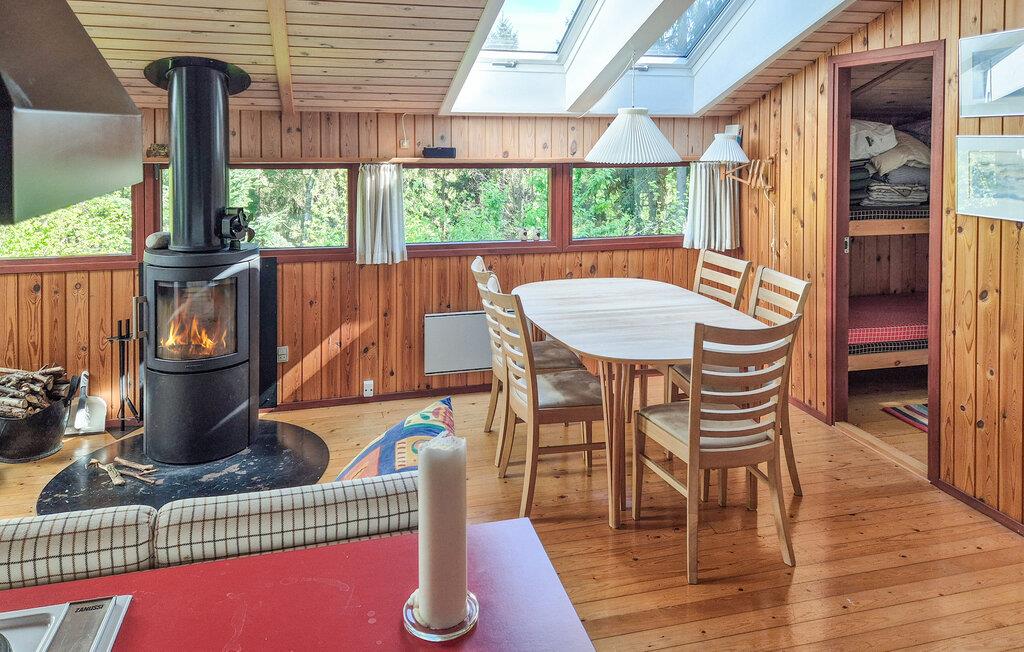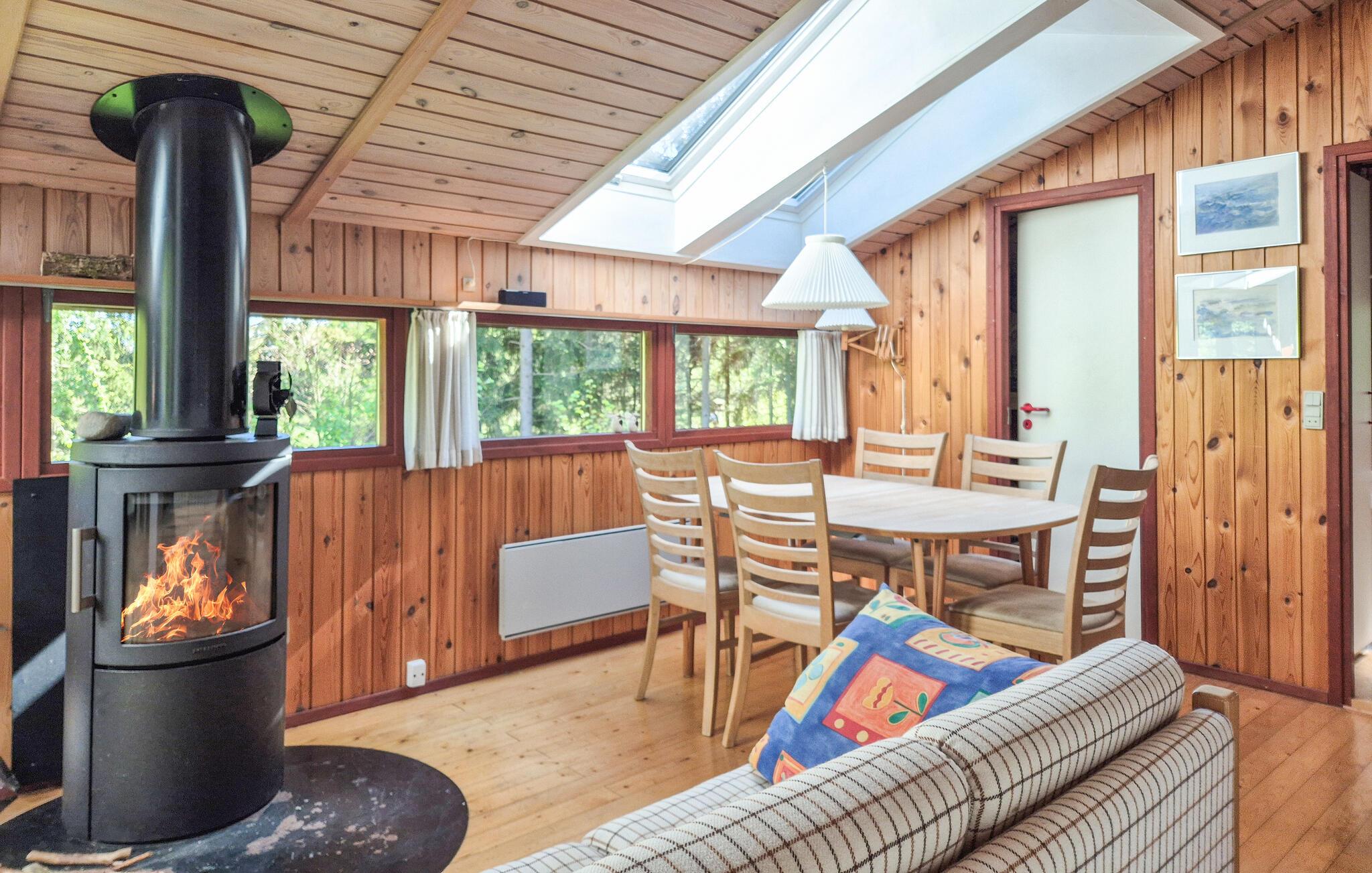 Dette charmerende træhus ligger midt i uberørt natur og giver jer den optimale base for afslappende dage med venner eller familie. Tænd brændeovnen og glæd jer til hyggelige læsetimer i sofaen og hyggelige spilleaftener ved det store spisebord. I det moderne, åbne køkken kan I tilberede måltiderne, mens I snakker med familien.