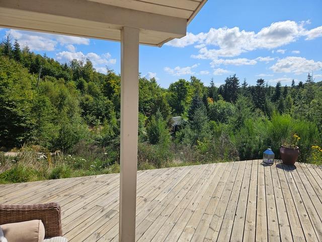 Der er flere terrasser udenfor, hvor man kan sidde og slappe af og nyde den helt unikke udsigt. På den åbne terrasse på 15 m2 er en markise med motordrev. I tilknytning til denne terrasse er der et shelter med plads til 4 personer. Der er naturligvis også havemøbler og en grill, et stort, flytbart bål-fad og en Morsø Pizzaovn. Har I har lyst til at overnatte ude og komme tættere på naturen, er der en shelter (helt tæt på huset) ved vest-terrassen med fin udsigt mod øst.