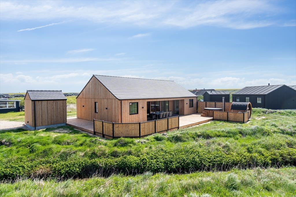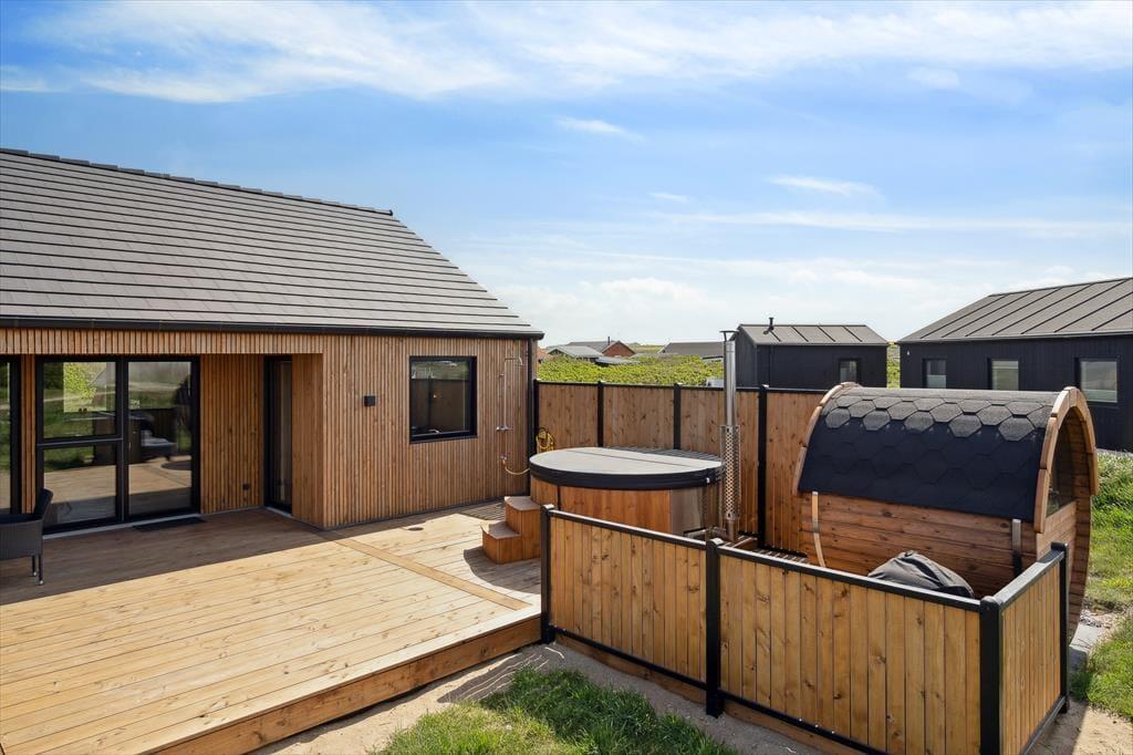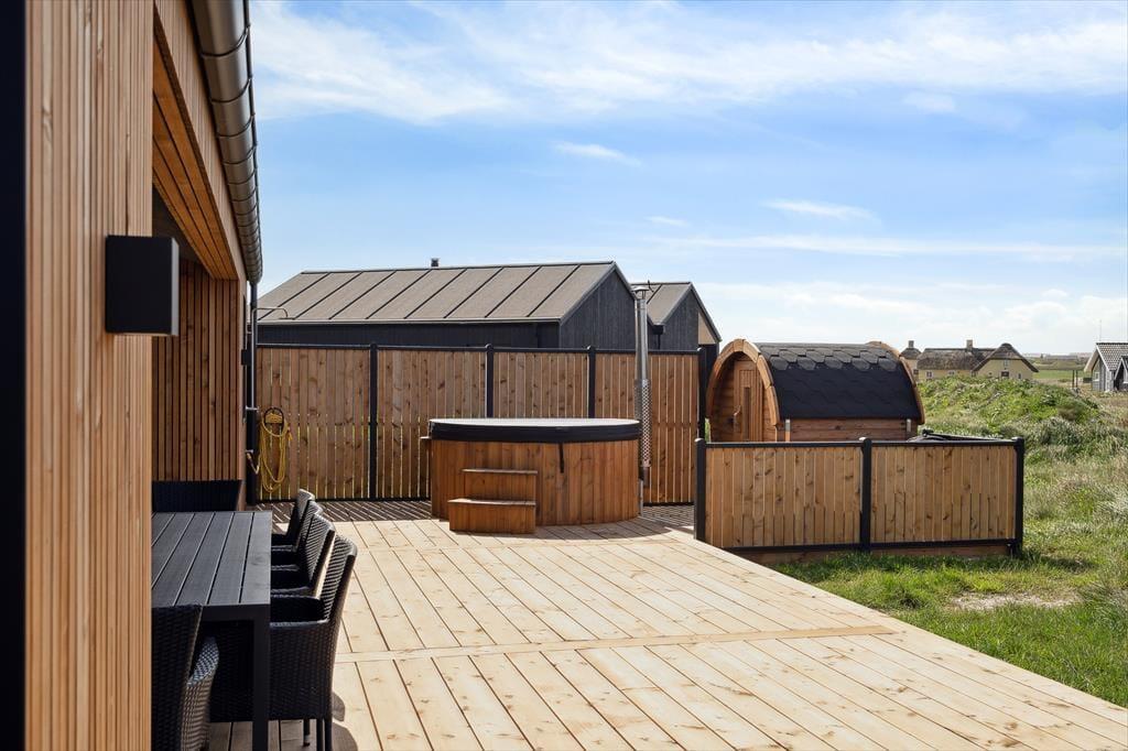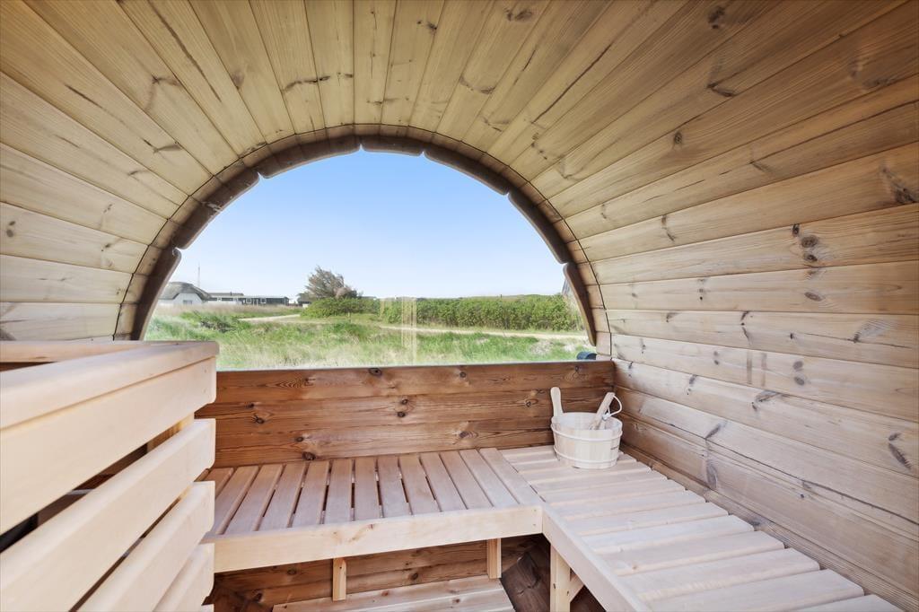 Udelivet er noget helt særligt på Stranden 10. Her strækker den rummelige træterrasse sig langs huset, og med både vildmarksbad, udendørs bruser og en lækker sauna i en tøndeformet konstruktion, er der lagt op til ren selvforkælelse. Du kan starte dagen med et varmt bad under åben himmel, lade kroppen varme igennem i saunaen efter en frisk gåtur ved havet eller nyde solnedgangen fra vildmarksbadet med himlens farvespil som kulisse. Når vejret er til det, er det oplagt at dække op til aftensmad på terrassen – og måske tænde op i grillen, mens lyden af måger og den fjerne brusen fra havet sætter den perfekte feriestemning. Den rolige atmosfære i området giver dig mulighed for virkelig at mærke freden og roen synke ind – og børnene kan lege trygt i haven, mens de voksne nyder et stille øjeblik i solen.