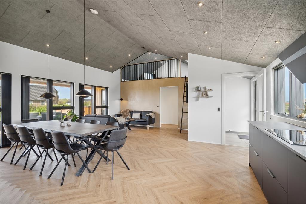 Når du træder ind i sommerhuset, mødes du af et indbydende og stilfuldt interiør, hvor der er kræset for detaljerne. Indretningen er moderne med lyse materialer og et varmt udtryk, som får stemningen til at emme af hygge. Køkkenet og stuen er forbundet i en åben løsning, så hele familien kan være sammen om både madlavning, spil og gode samtaler – og børnene vil med garanti finde sig godt til rette på den hyggelige hems. Heroppe kan de lege eller finde ro med en tablet og en pude i hjørnet, mens de voksne slapper af i sofaen med et glas vin og blikket rettet mod haven. Huset er velegnet til både små og store selskaber, og her er rig mulighed for at finde sig til rette – uanset om du kommer for stilheden, samværet eller det hele på én gang.