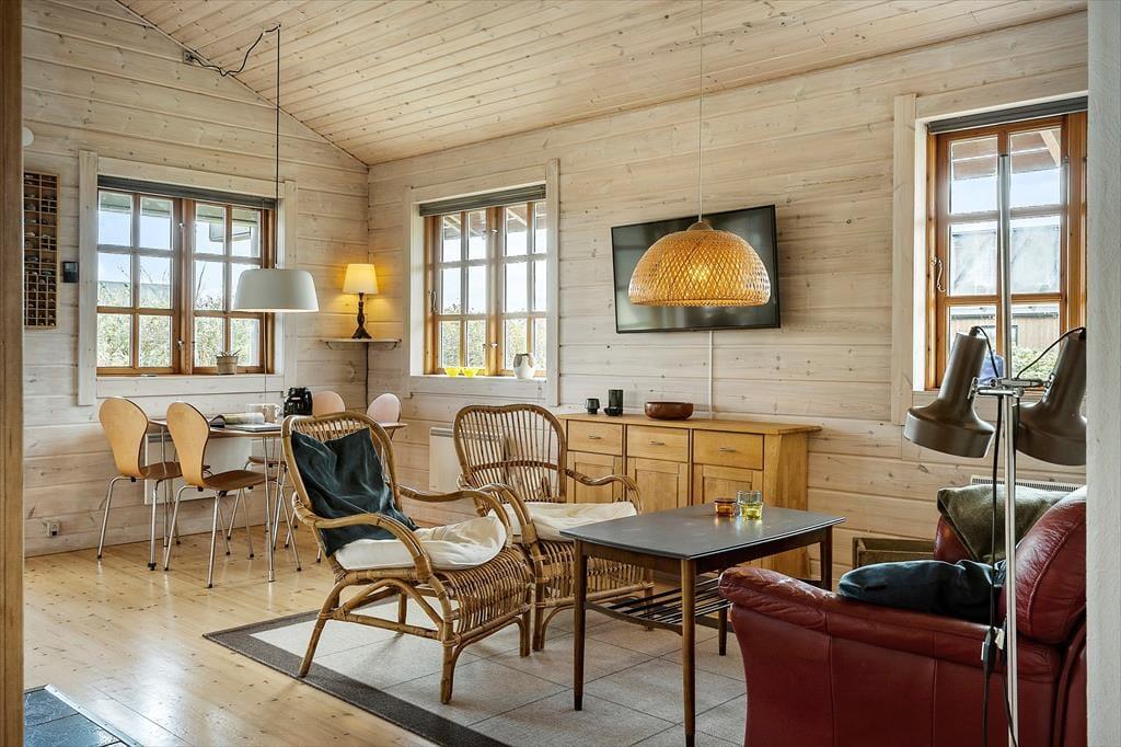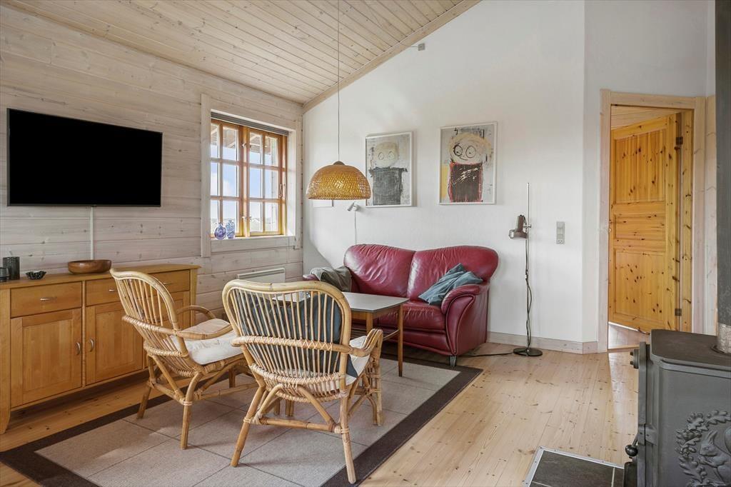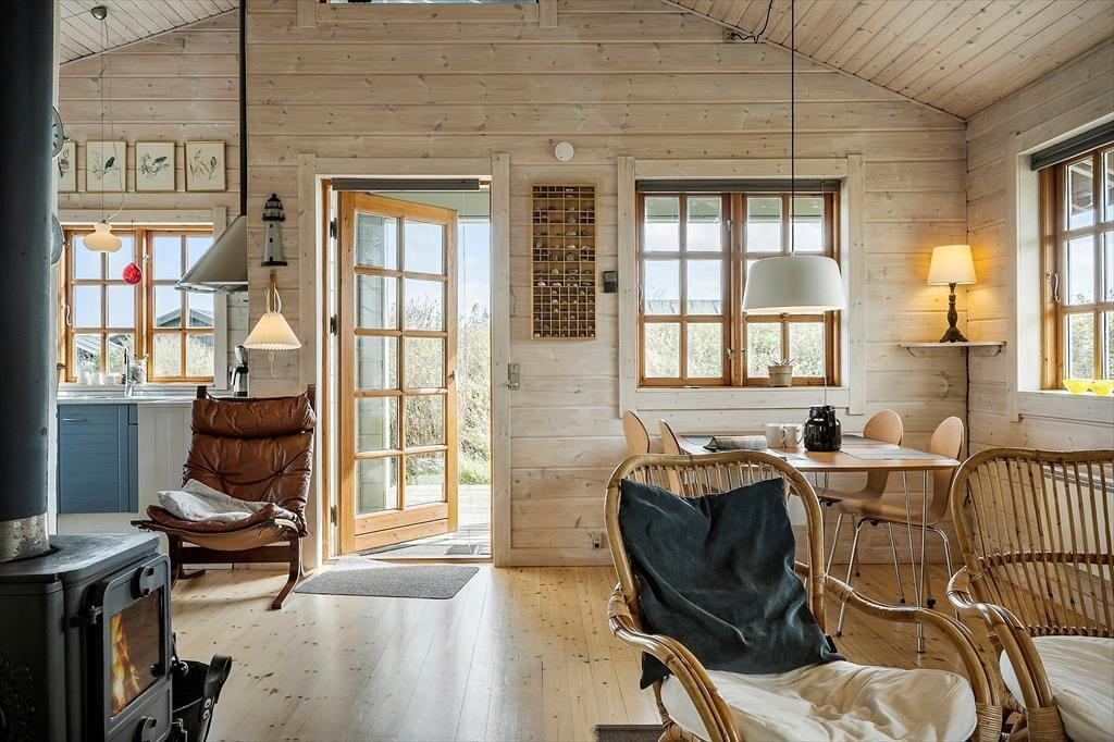 Når du træder indenfor i sommerhuset, bliver du mødt af en lys og åben indretning, der skaber en behagelig atmosfære. Her er der plads til at koble af, hvad enten du samler familien i stuen til en hyggelig filmaften eller nyder en stille stund med en bog i hånden. Sommerhuset har to soveværelser og en rummelig hems, som giver ekstra muligheder for at finde en hyggelig krog. Hemsen, med sin placering nær køkkenet, er især et hit blandt børnene, der kan lege og hygge sig, mens du tilbereder dagens måltider. Den åbne stue og køkkenet er husets naturlige samlingspunkt, hvor vinduer lukker naturen indenfor og giver et fantastisk lysindfald med udsigt over det smukke landskab og Ferring Sø.