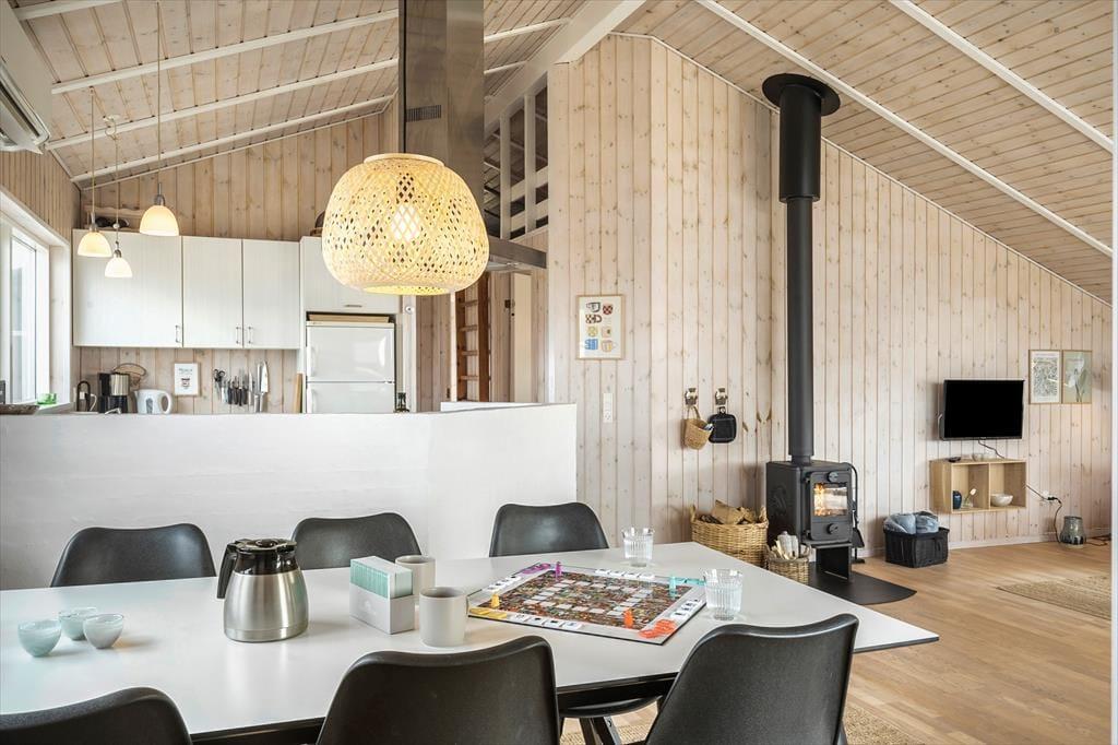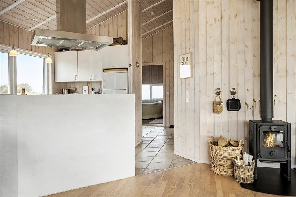Sommerhuset har en lys og venlig atmosfære, hvor store vinduer byder naturen indenfor. Den åbne forbindelse mellem stue og køkken skaber et naturligt samlingspunkt, hvor du og familien kan nyde måltider sammen, spille brætspil eller slappe af foran fjernsynet med en god film. Brændeovnen sørger for ekstra hygge og varme på kølige dage, mens udsigten til Ferring Sø er en konstant påmindelse om, at ferien er noget særligt. De tre soveværelser er komfortabelt indrettet, og badeværelset er moderne og praktisk. Huset har plads til, at alle kan finde sig godt til rette.