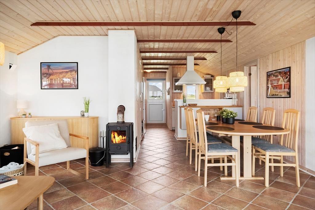 Sommerhusets lyse og åbne planløsning skaber en rar og afslappet stemning fra det øjeblik, du træder ind ad døren. Køkkenet og stuen ligger i åben forbindelse, hvilket gør det oplagt at samles til hyggelige måltider, spil og samtaler. Brændeovnen er hjertet i opholdsrummet og skaber en varm og indbydende atmosfære – perfekt til de kølige aftener, hvor I kan krølle jer sammen med en kop kakao og høre flammerne knitre. Indretningen er enkel og funktionel med fokus på, at alle skal føle sig hjemme, og huset rummer god plads til både familie og venner, der ønsker at nyde ferie tæt på havet.