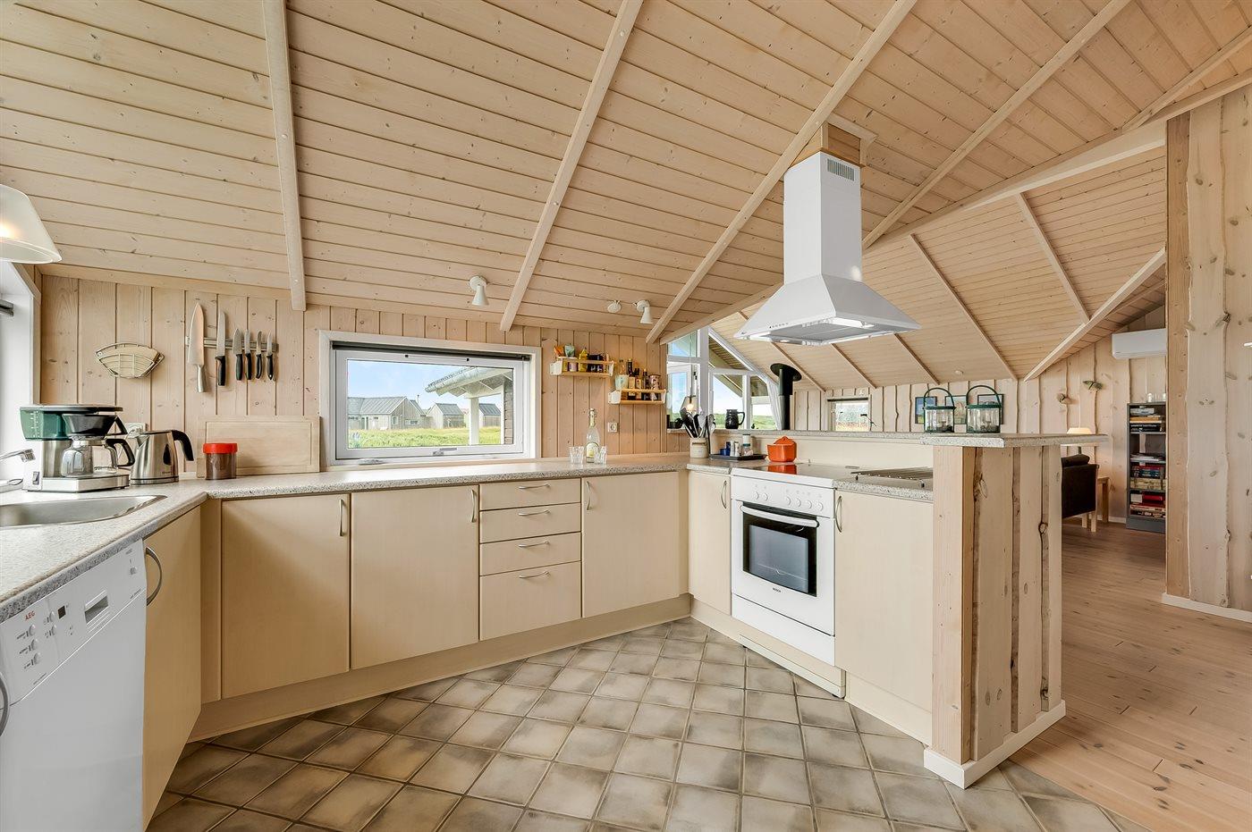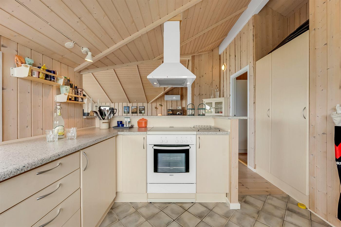 Køkkenet er udstyret med 1 køleskab. Der er 4 keramiske kogeplader, varmluftovn, mikrobølgeovn samt opvaskemaskine.