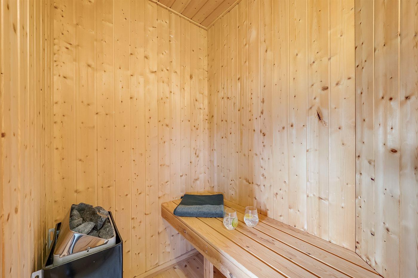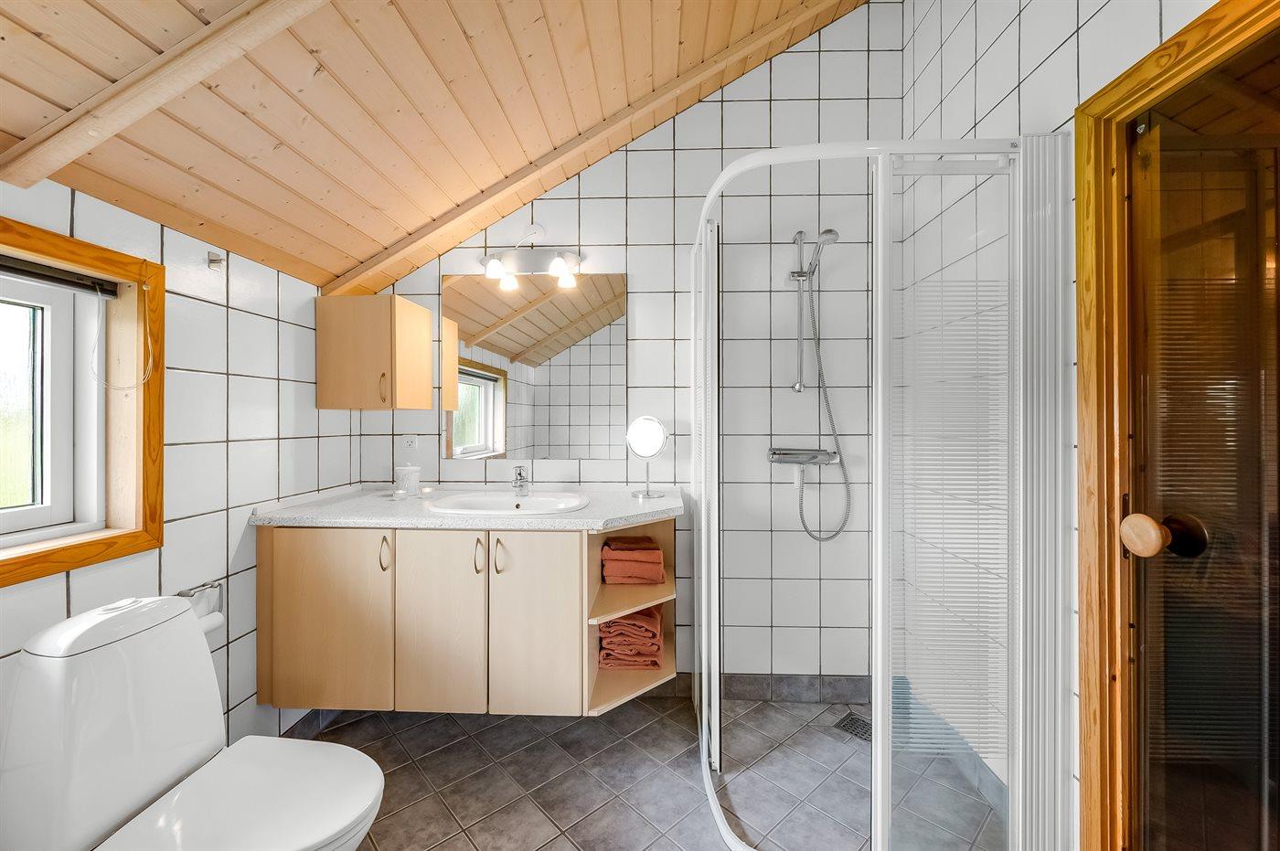 Der er 1 badeværelse med bruseniche og 2 toiletter, heraf 1 gæstetoilet. Der er gulvvarme på 1 badeværelse. Der er gulvvarme på gæstetoilettet. I saunaen er der mulighed for afslapning.