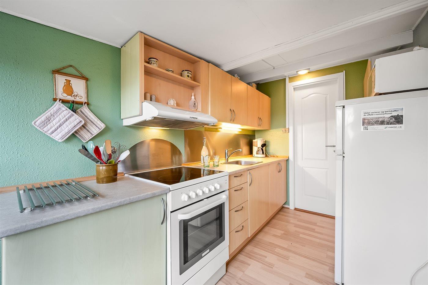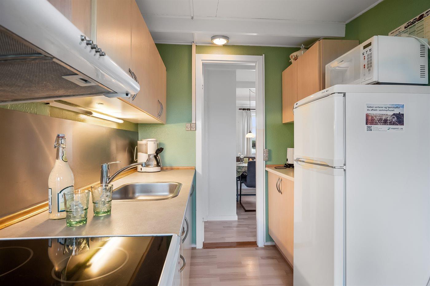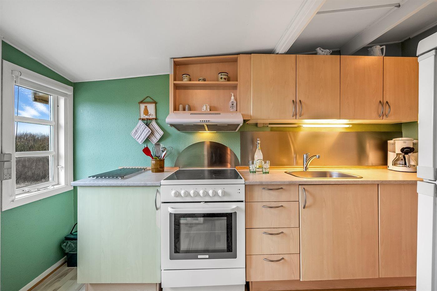 Køkkenet er udstyret med 1 køleskab. Der er 4 elkogeplader, bageovn, mikrobølgeovn.