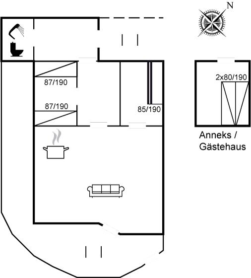 Der er i alt 3 soveværelser. Sovepladserne fordeler sig på: 2 sovepladser i dobbeltseng. 2 sovepladser i enkeltsenge. 2 sovepladser i køjeseng.- 2 af disse sovepladser befinder sig i et anneks.