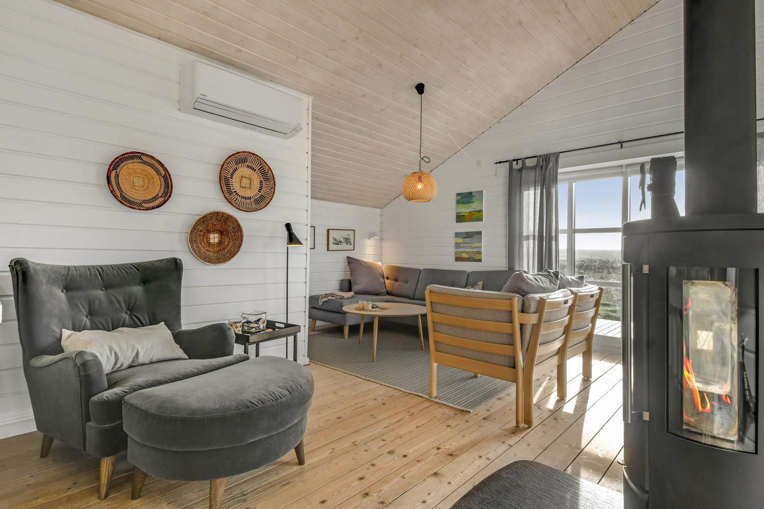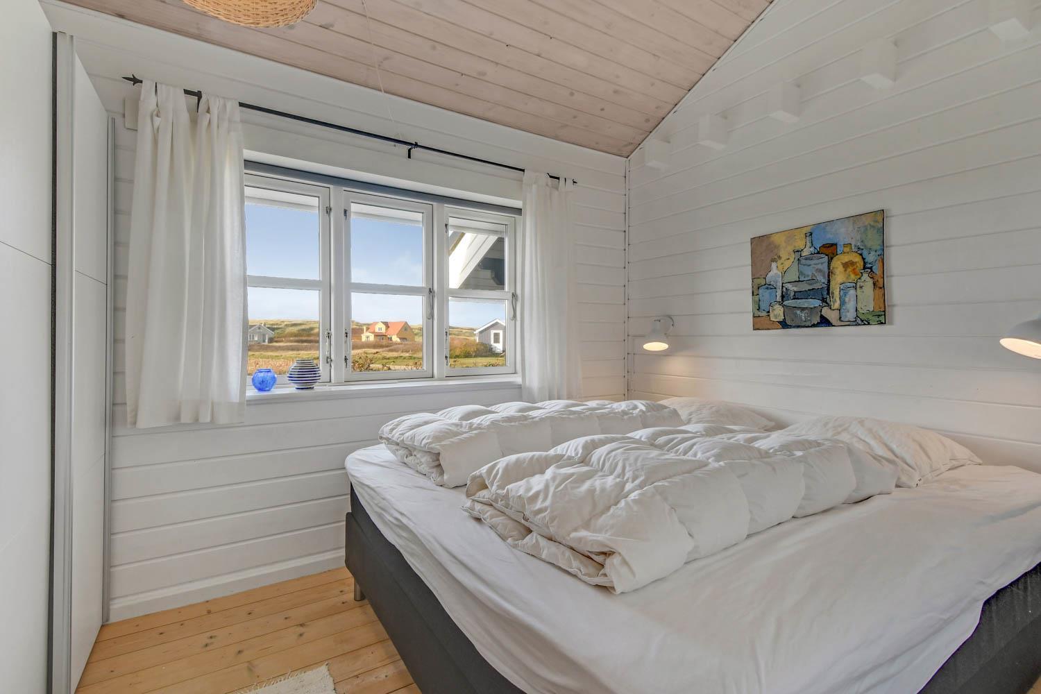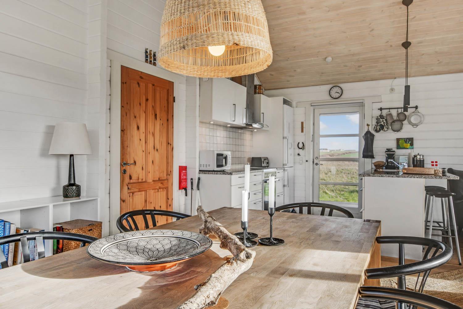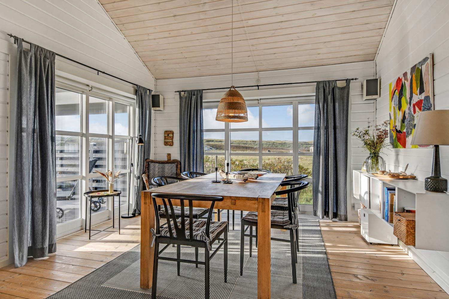 Godt og meget hyggeligt indrettet og helårsisoleret feriehus i træ. Huset er lyst og indbydende og har store vinduespartier med god udsigt over klitterne og vådområderne ved Ferring og det rige fugleliv. Opholdsstue og køkken er kombineret og danner et rummeligt og komfortabelt sted at være. I stuen er der brændeovn og varmepumpe som udover at give en behagelig varme også er med til at gøre forbrugsafregningen billigere. Der er et F-TV med parabol som tilbyder tyske kanaler og et begrænset udvalg af danske kanaler. Der findes også en DVD og gratis internetadgang. Chromecast kan medbringes. Dejlig lyst køkken som er veludstyret med alle nødvendige hvidevarer og udstyr, glaskeramisk komfur, emhætte, køle-(fryseskab, opvaskemaskine og mikroovn. Huset har 3 soveværelser: 1DS + 1DS + 2S. Badeværelse: Toilet, bruser, 2 håndvaske, gulvvarme og vaskemaskine og tørretumbler. Til de mindste gæster er der barneseng og barnestol. Der er trægulve i stue, gang og på værelserne. Har man el-bil eller en Plug-In hybrid, så er der ved Ladeboks til Type 2 ladestik, der kan lade op til 11 kWh. 1 husdyr er tilladt. Rygning er ikke tilladt.