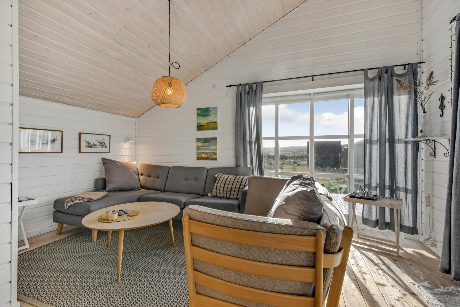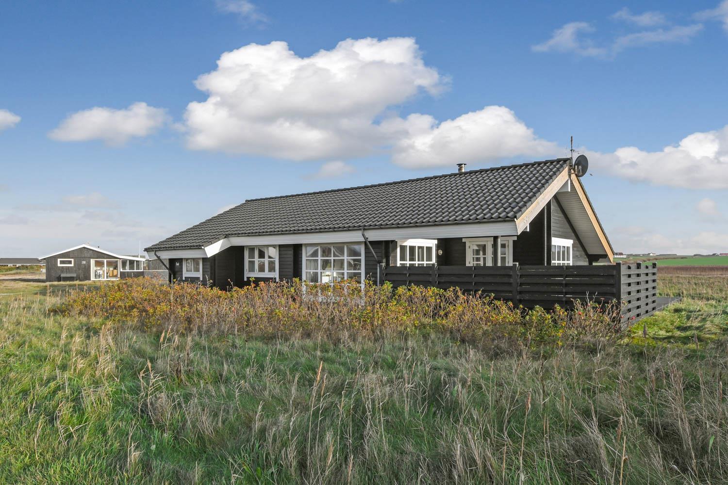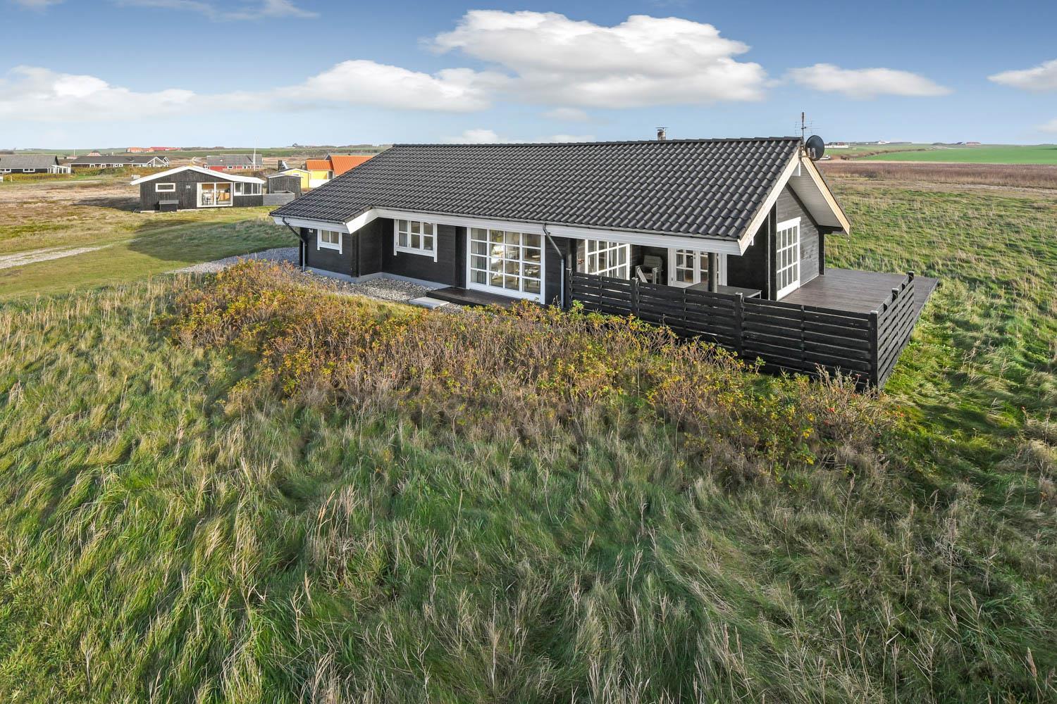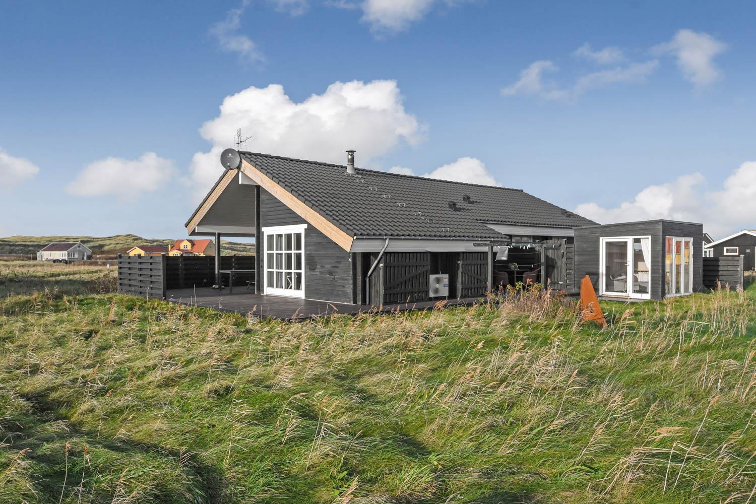 Flot nyere træhus i naturskønne omgivelser, kun 100 m fra det brusende Vesterhav. Gratis internetadgang.