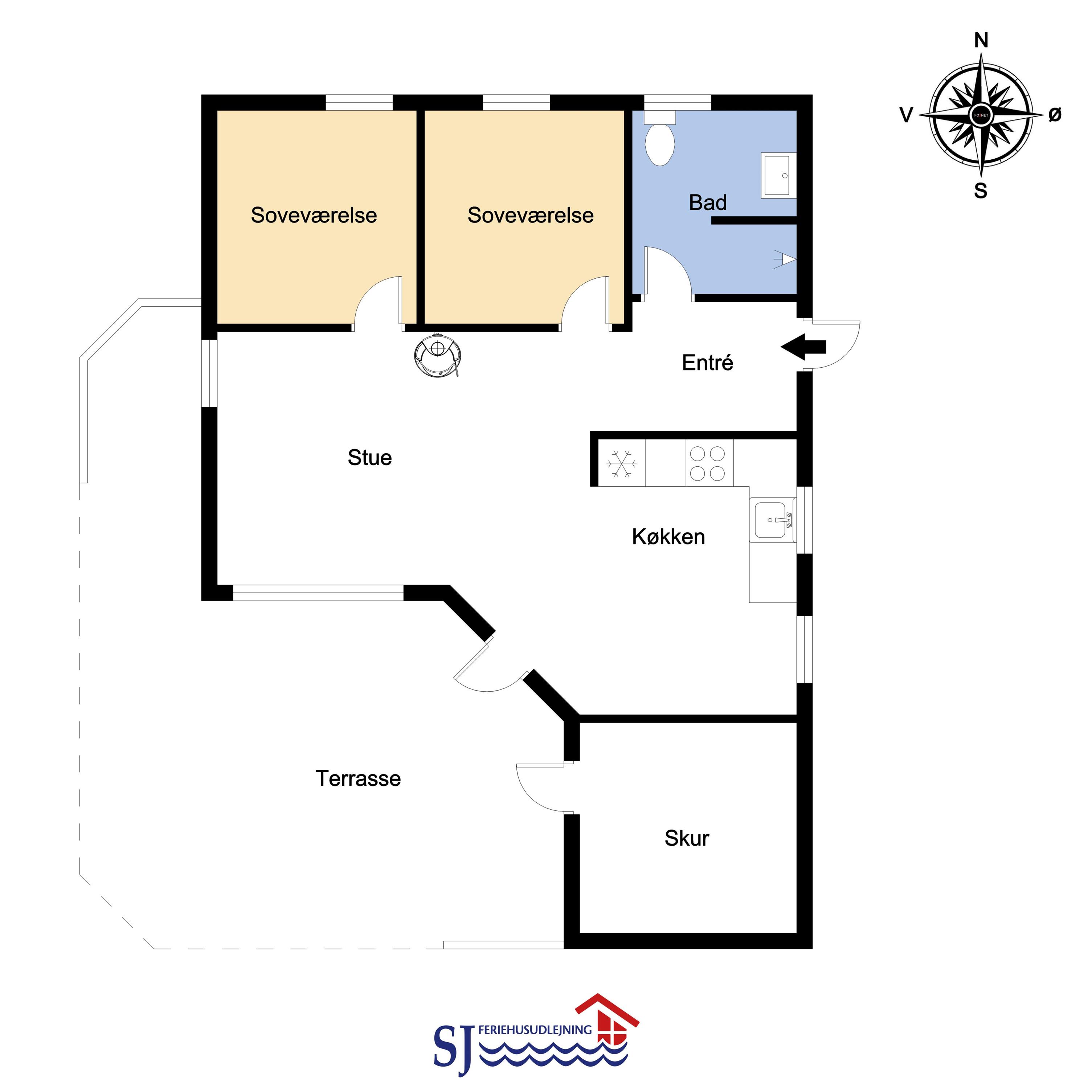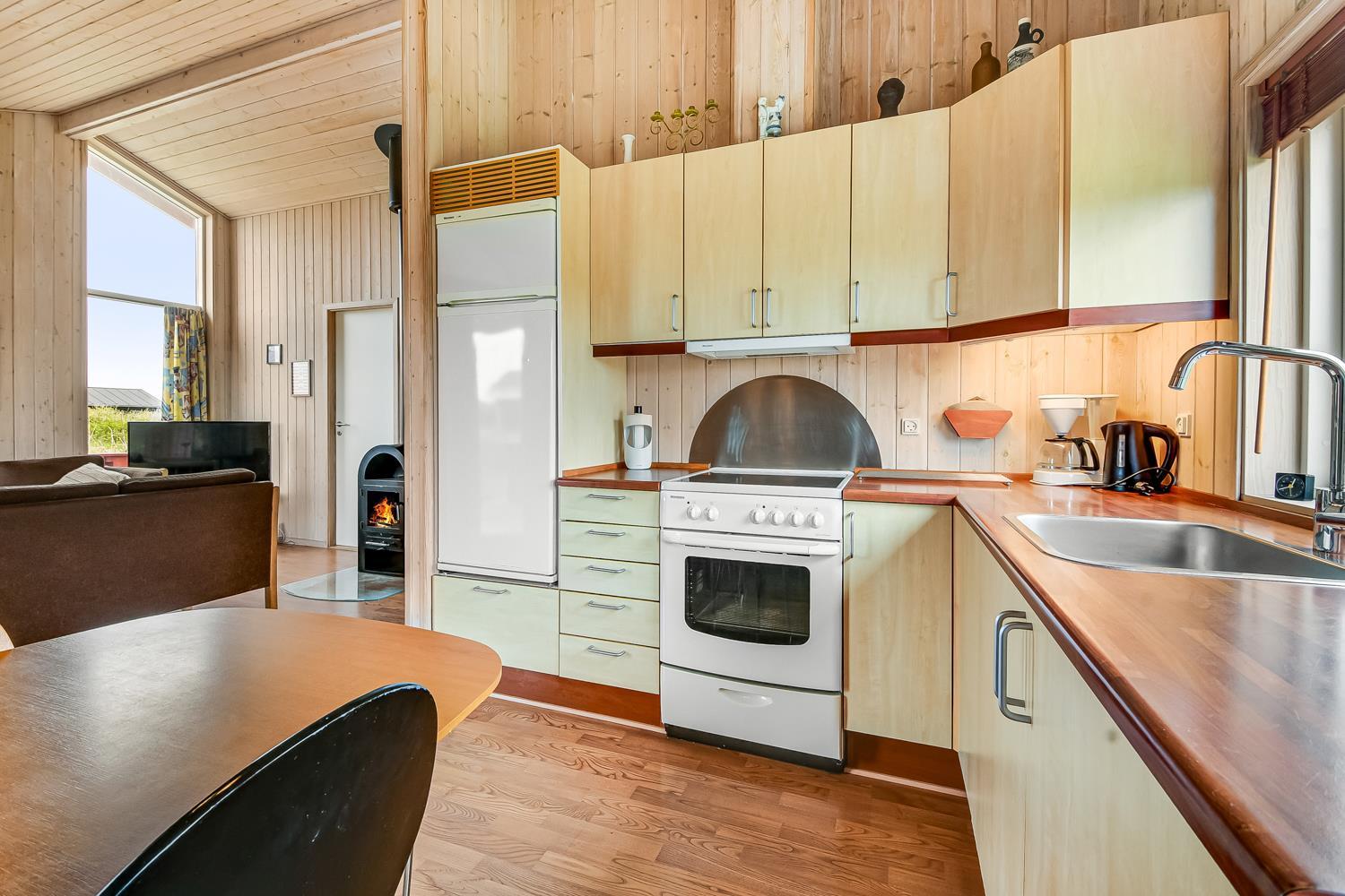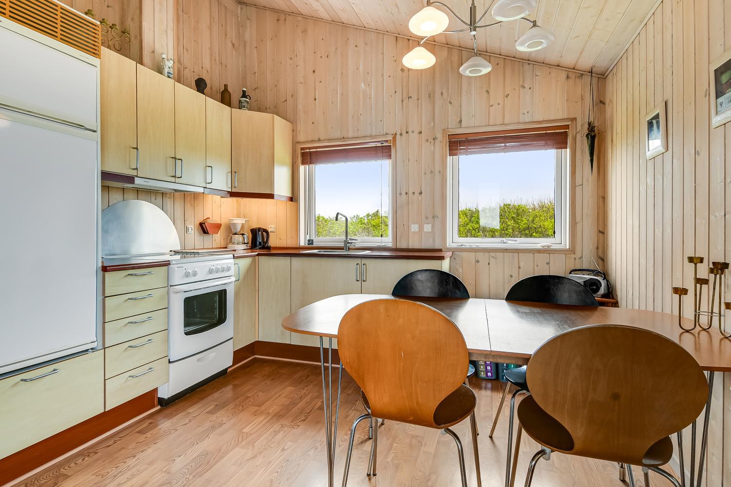Dette dejlige og hyggelige feriehus i træ er perfekt til et par eller den lille familie som ønsker at bo roligt og tæt på Vesterhavet. Huset er på 55 m2. Husets entre byder velkommen og giver plads til sko og jakker. Fra Entreen kommer man til huset lyse og indbydende hjerterum som består af en kombineret stue og køkken med trægulve. Køkkenet er godt indrettet med keramisk komfur, emhætte, køleskab med 10 l fryser. Stuen er med F-TV med fibernet-TV med danske og tyske programmer, DVD og en skøn brændeovn, som sørger for en behagelig varme også på de kolde dage. Badeværelse med toilet, håndvask og bruser samt vaskemaskine og klinkegulv. 2 soverum: 1DS + 1K. Fra stuen er der en stejl stige op til hemsen, hvor der er 2 sovepladser. 1 husdyr er tilladt. Ikke rygerhus.