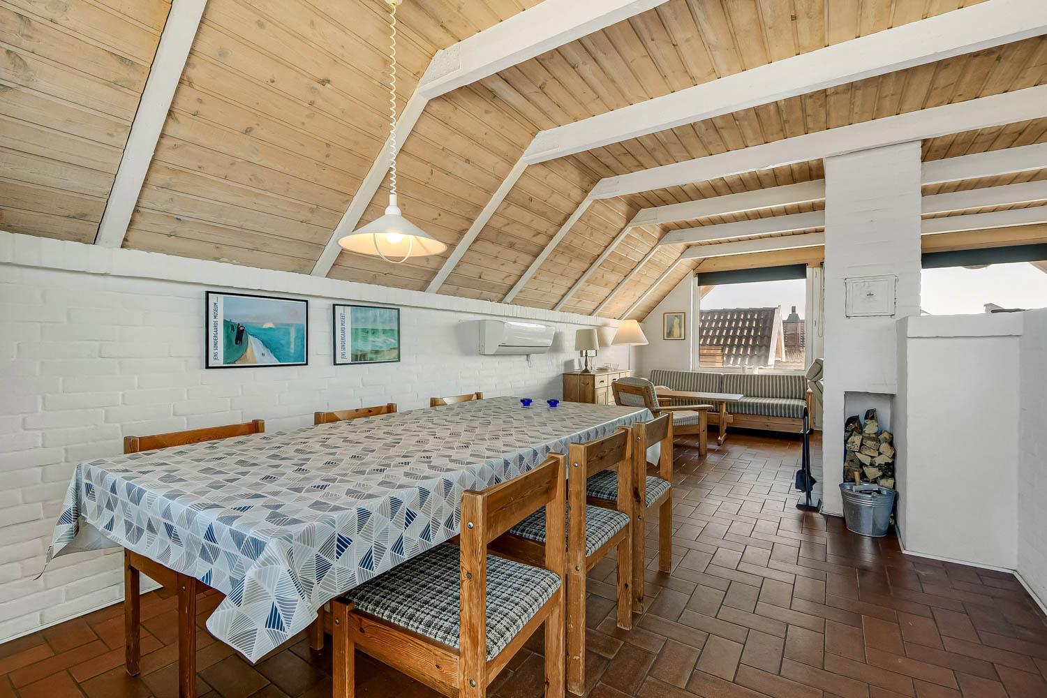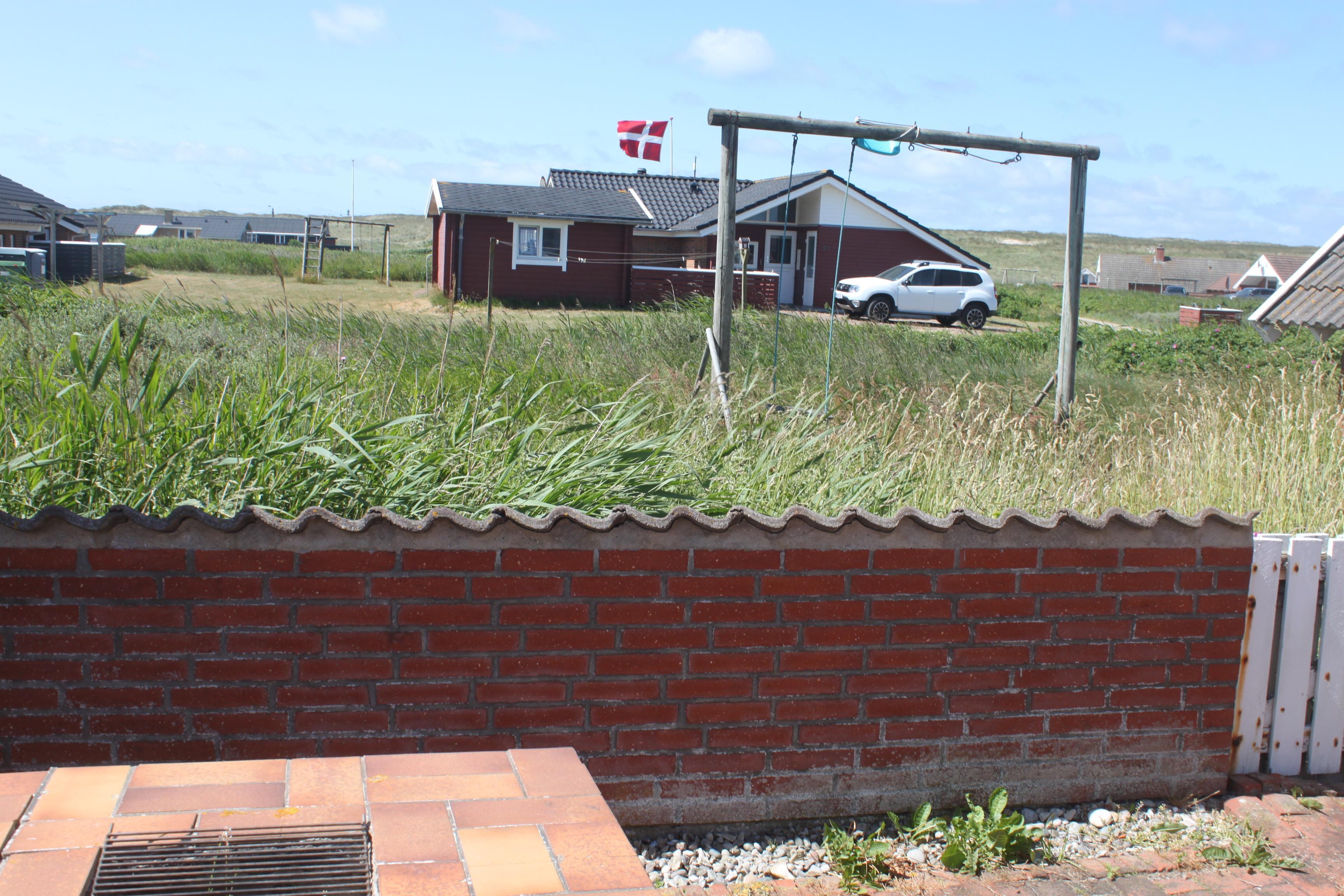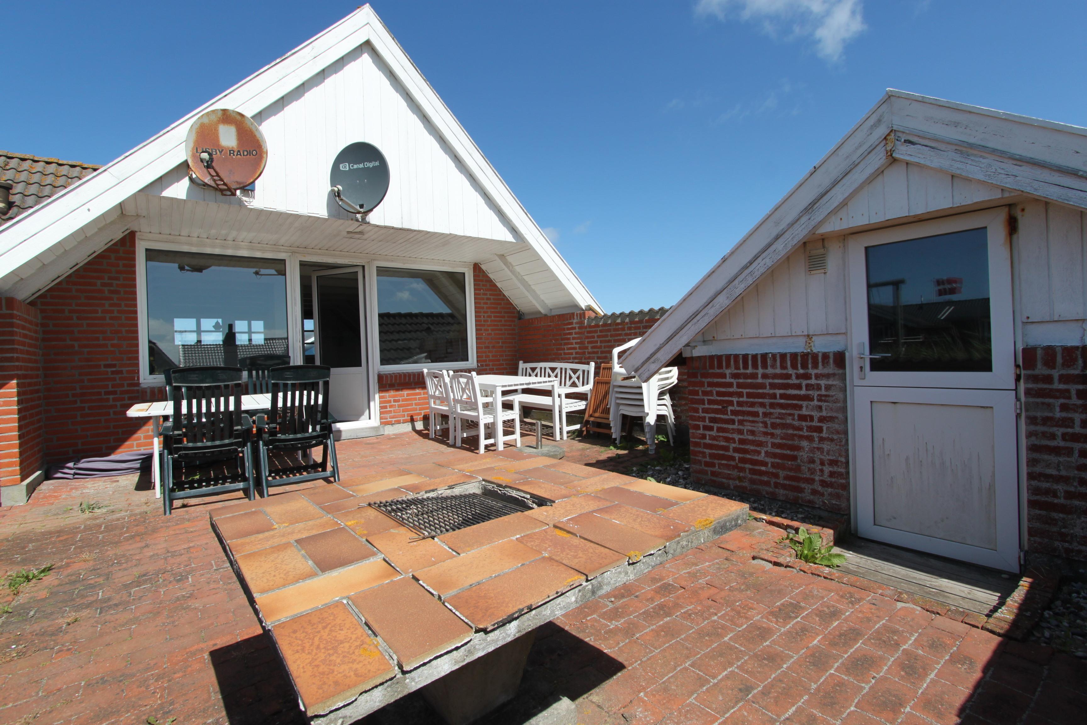 Udgang til indhegnet, delvis overdækket terrasse med havemøbler og grill. Huset ligger på en 1.200 m2 stor, naturgrund kun 300m fra Vesterhavet og Ferring sø. Lad batterierne med en god bog, lange gåture i rolige og fredelige omgivelser, nyd beliggenheden, lyden af Vesterhavet og at terrassen er indhegnet og dermed er perfekt hvis børn og husdyr medbringes.