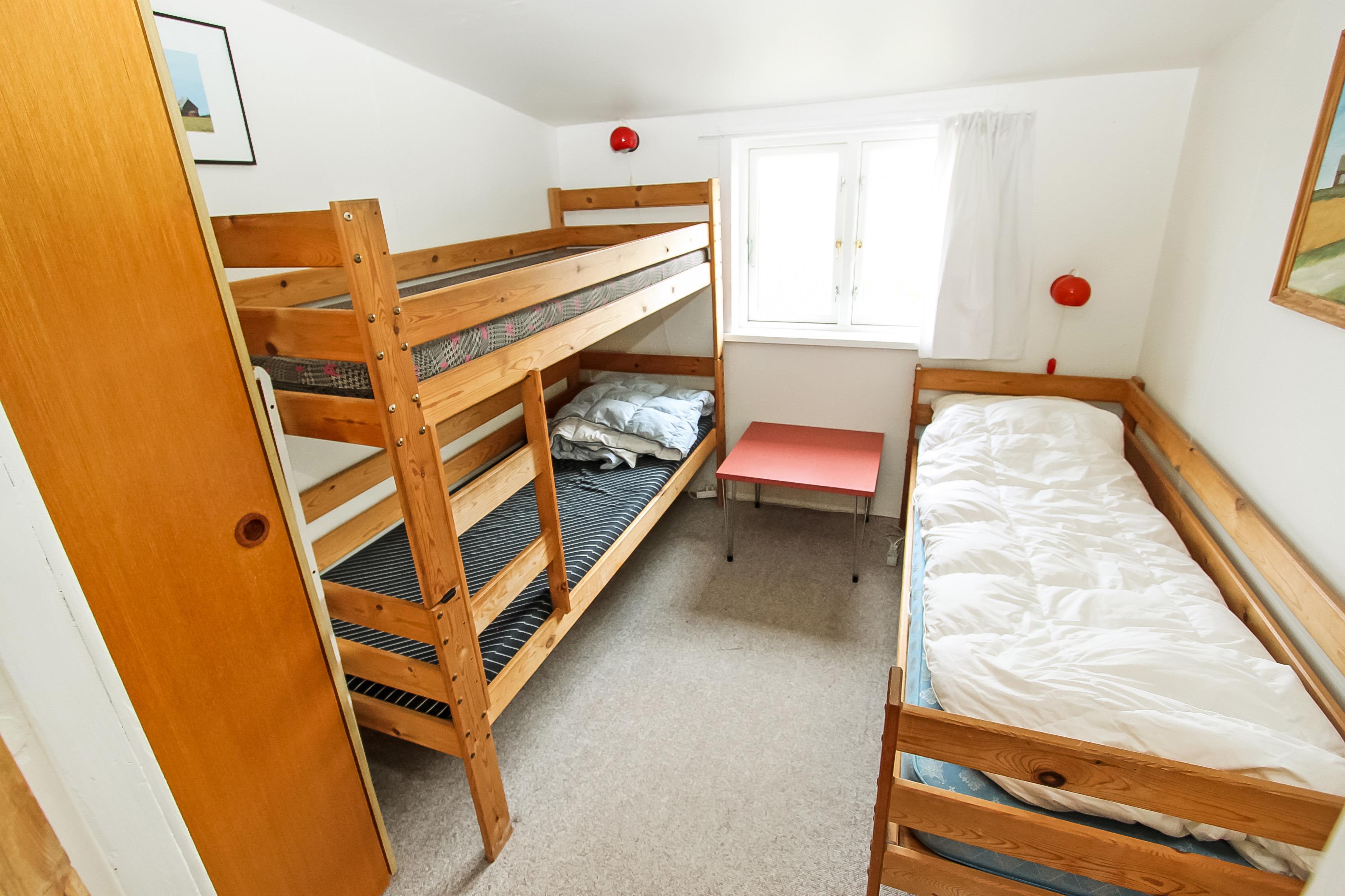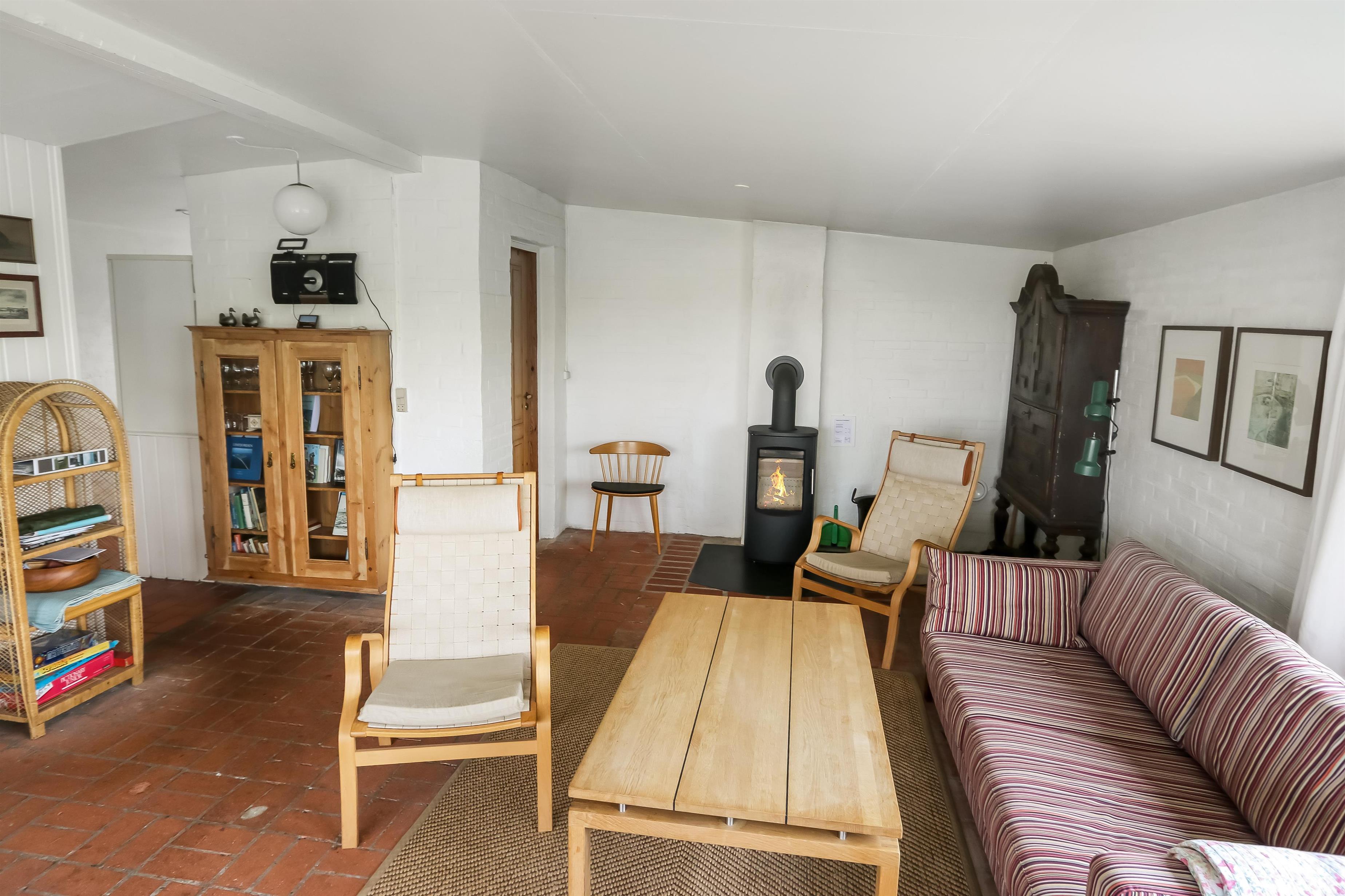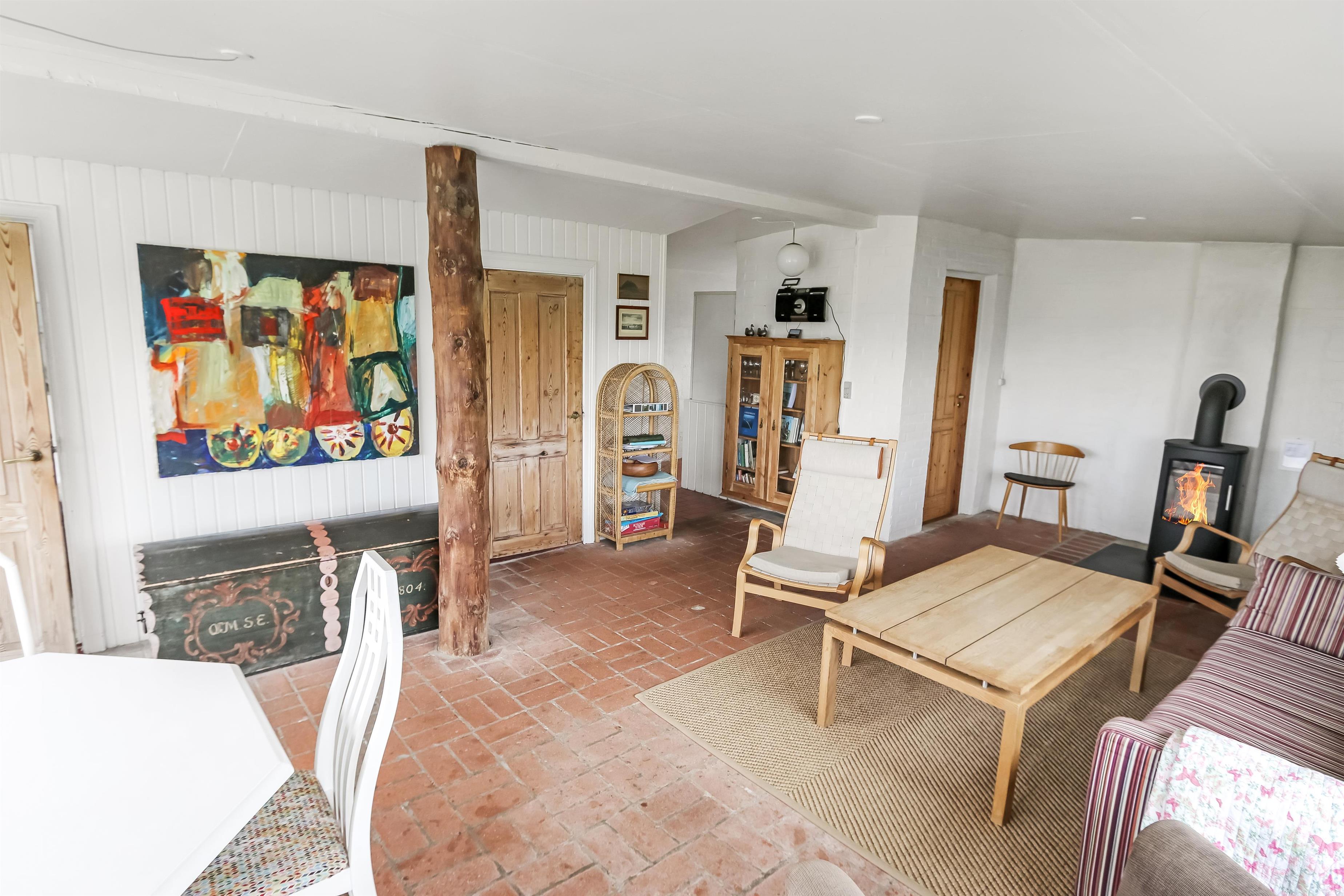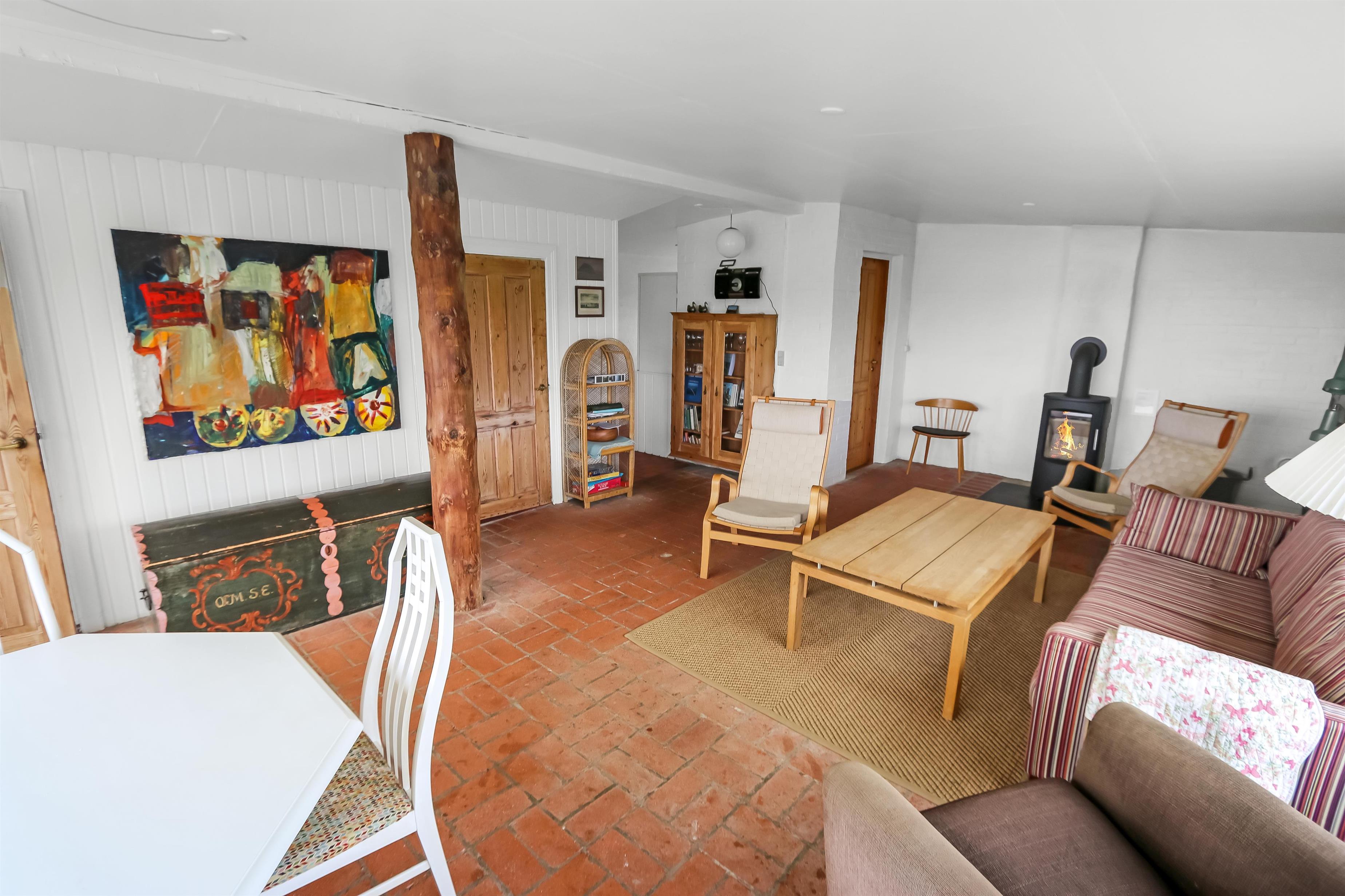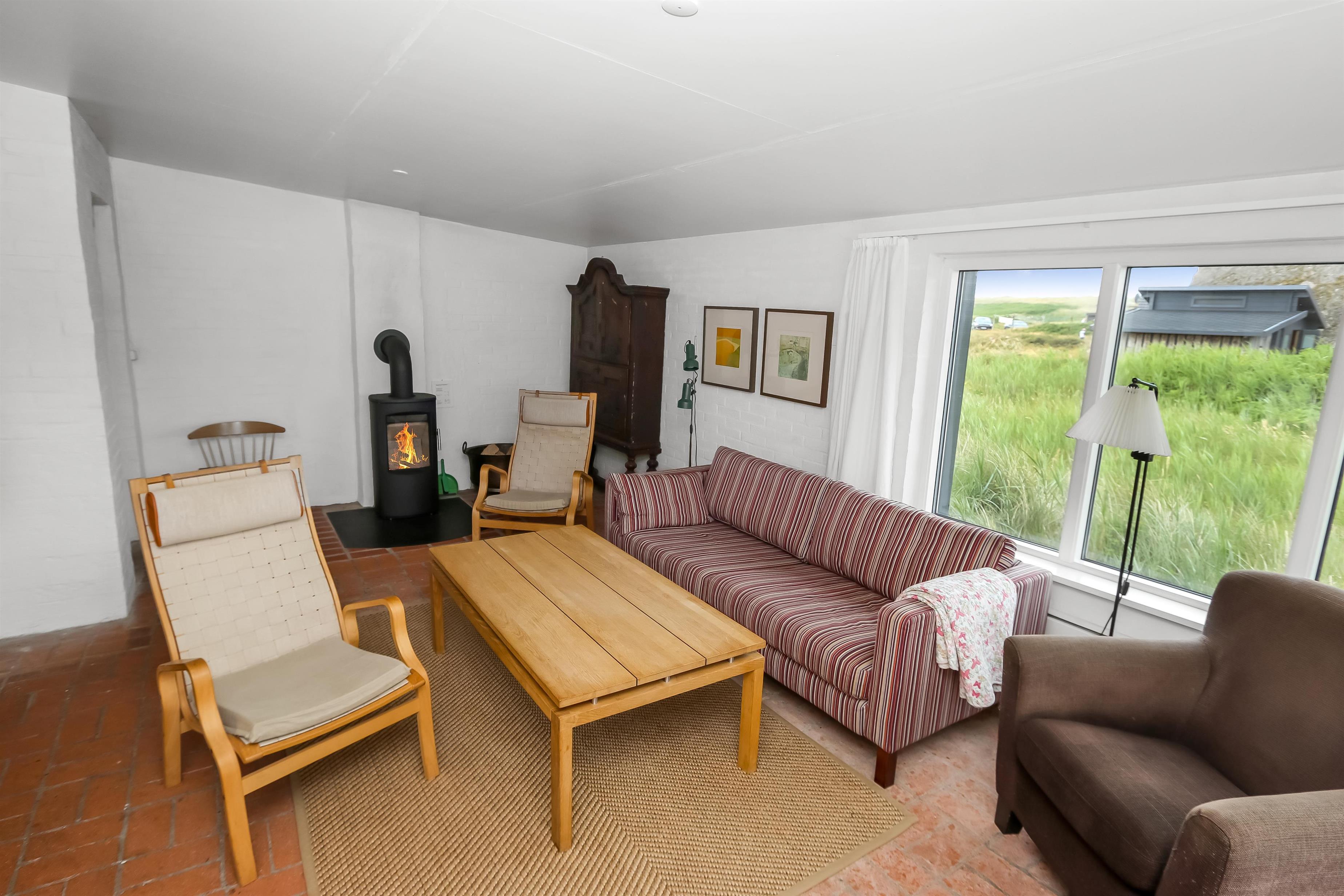 Enkelt indrettet opholdsstue med polstermøbler, spisebord og brændeovn. Der er IKKE tv i huset men der er W-LAN. 2 værelser (1DS, 1ES + 1KS) samt nyt anneks (1DS, 1E) og flot udsigt. Huset egner sig bedst til max. 5 personer.