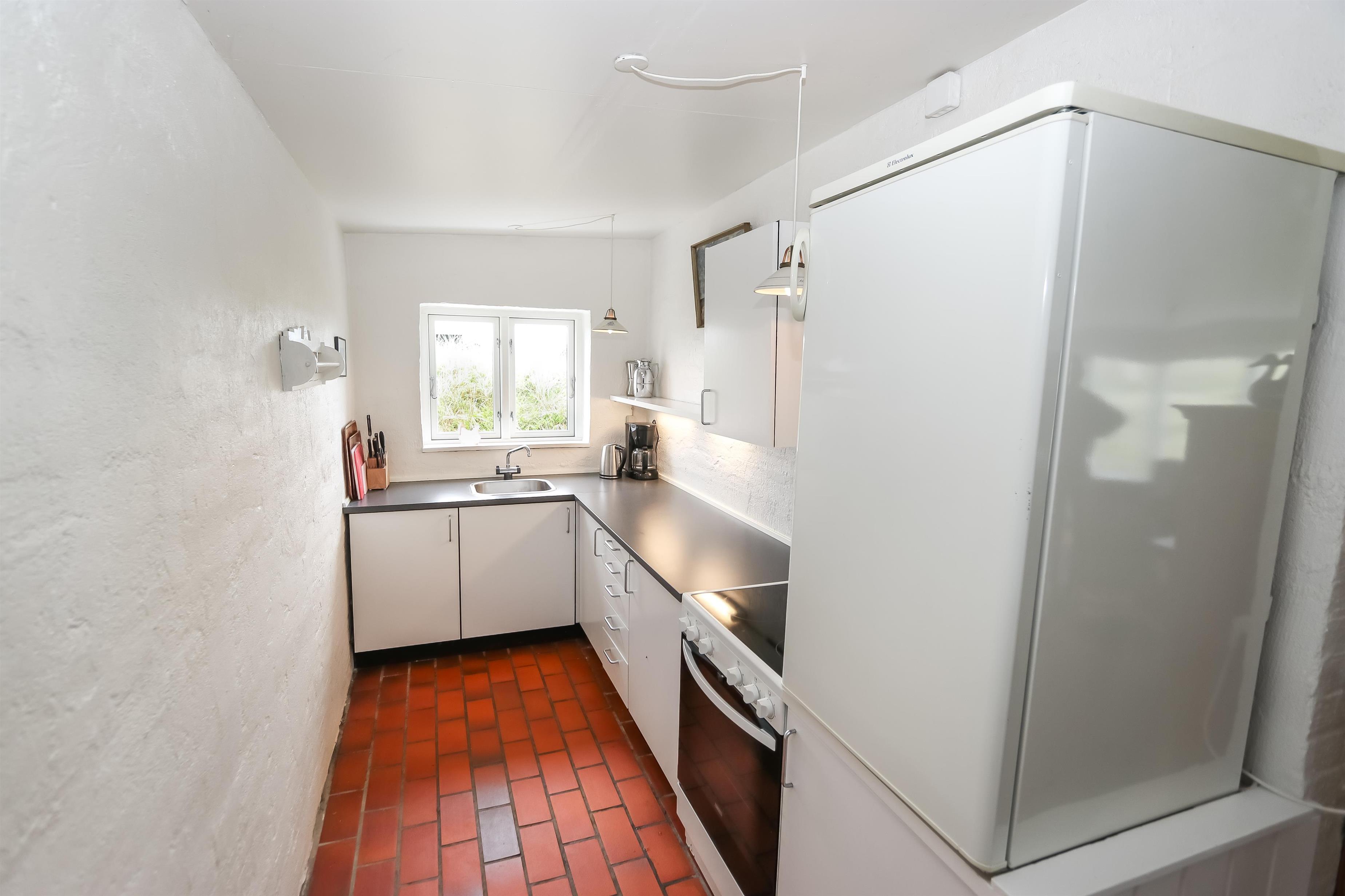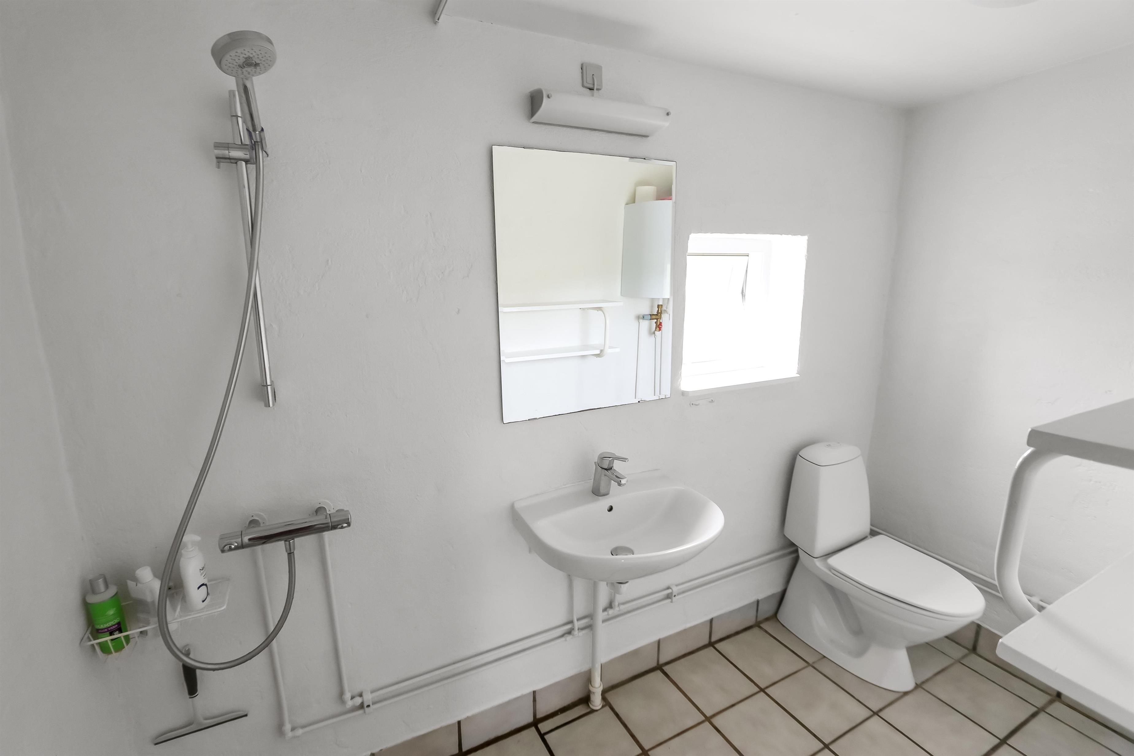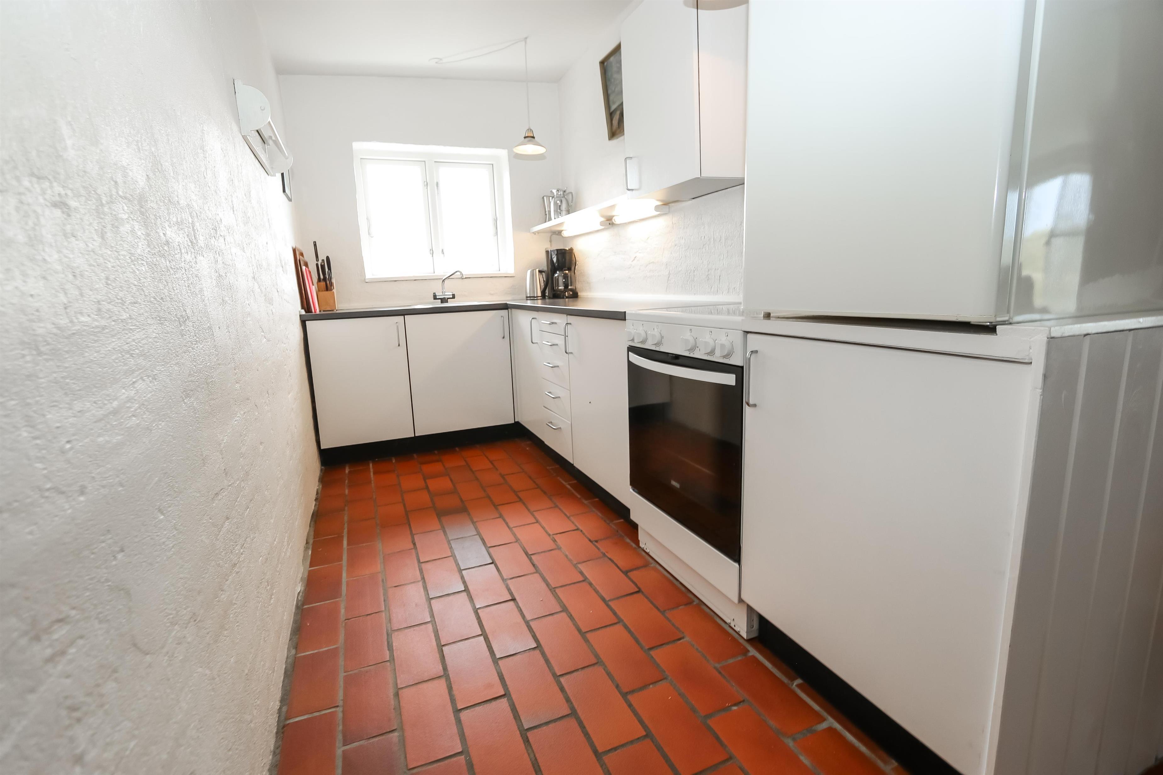 Mindre køkken med glaskeramisk komfur og køleskab med lille fryseboks. Badeværelse med bruser, toilet og håndvask. Ikke rygerhus