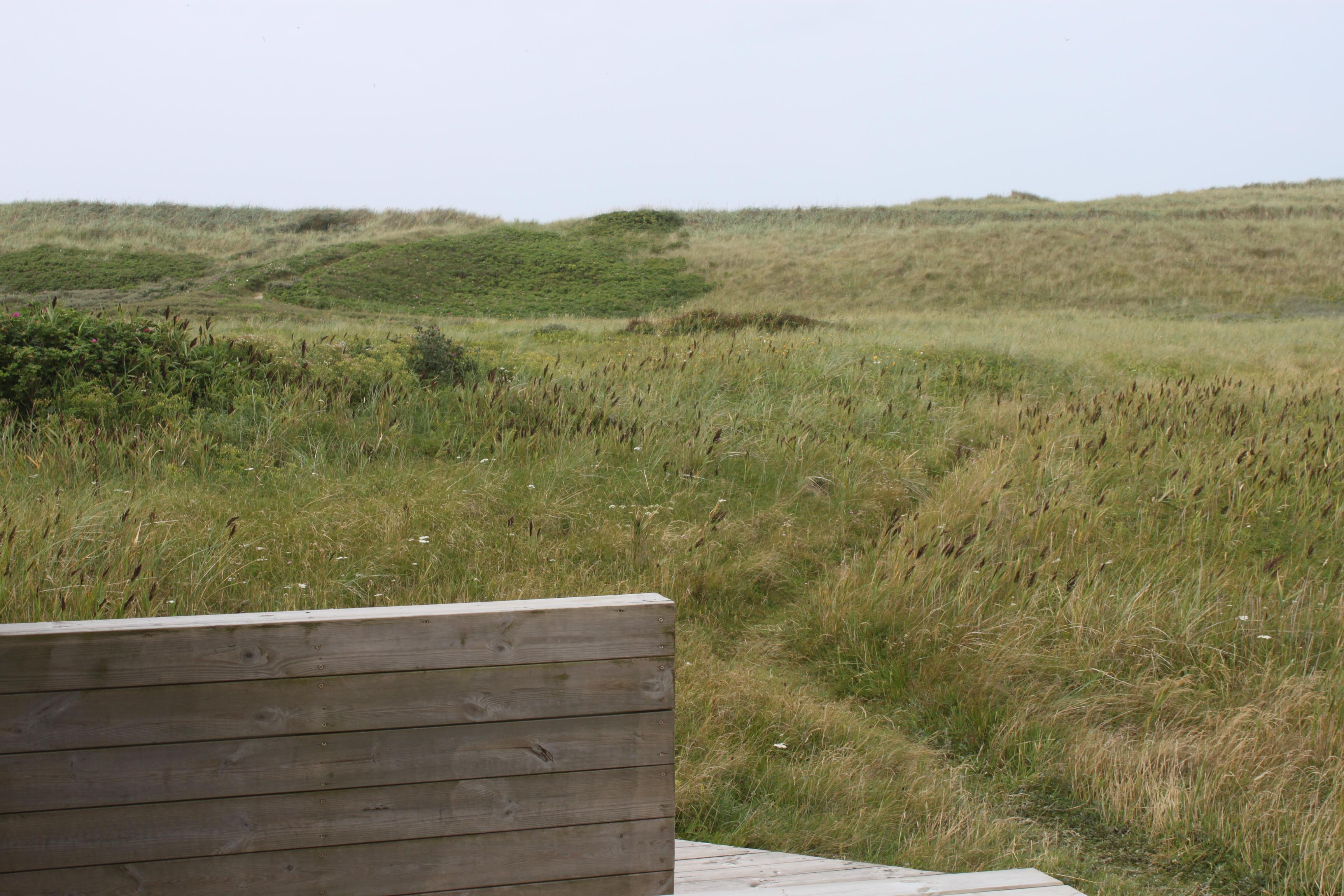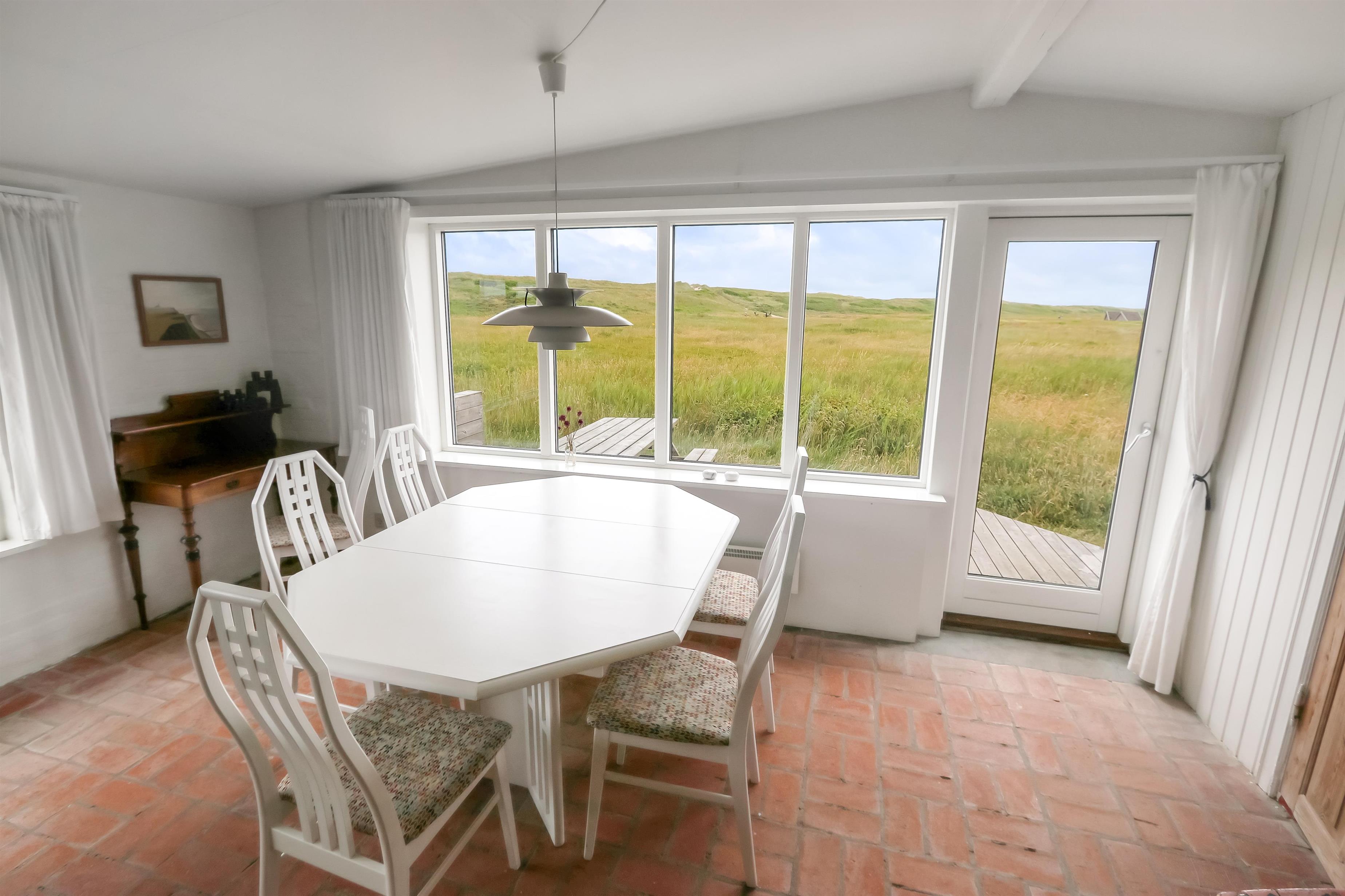 Morgenterrasse med havemøbler. Udgang til lille terrasse med havemøbler og fantastisk udsig til de høje klitter kun 150m fra Vesterhavet og kun 150 m fra Ferring sø. Huset ligger på en 9.040 m2 stor, privat, fredet naturgrund som går helt ned til havet. Sommerhuset ligger yderst på en blind vej som også bruges når man skal en tur til havet eller til Ferring sø.