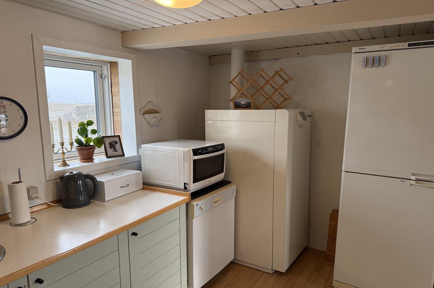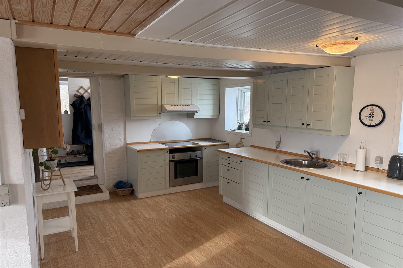 Køkkenet er udstyret med 1 køleskab. Der er 4 keramiske kogeplader, varmluftovn, mikrobølgeovn samt opvaskemaskine Der er gulvvarme i køkkenet.